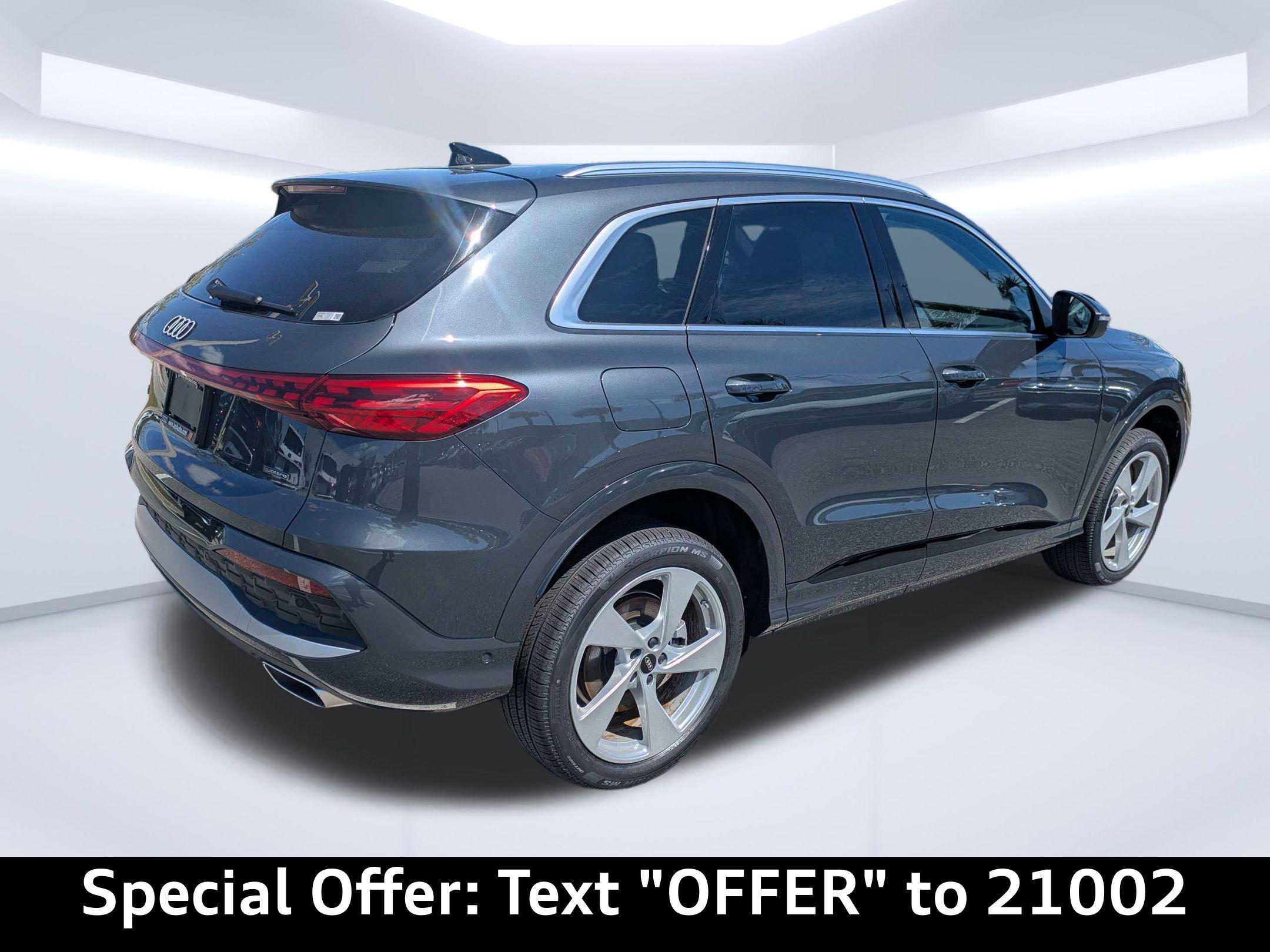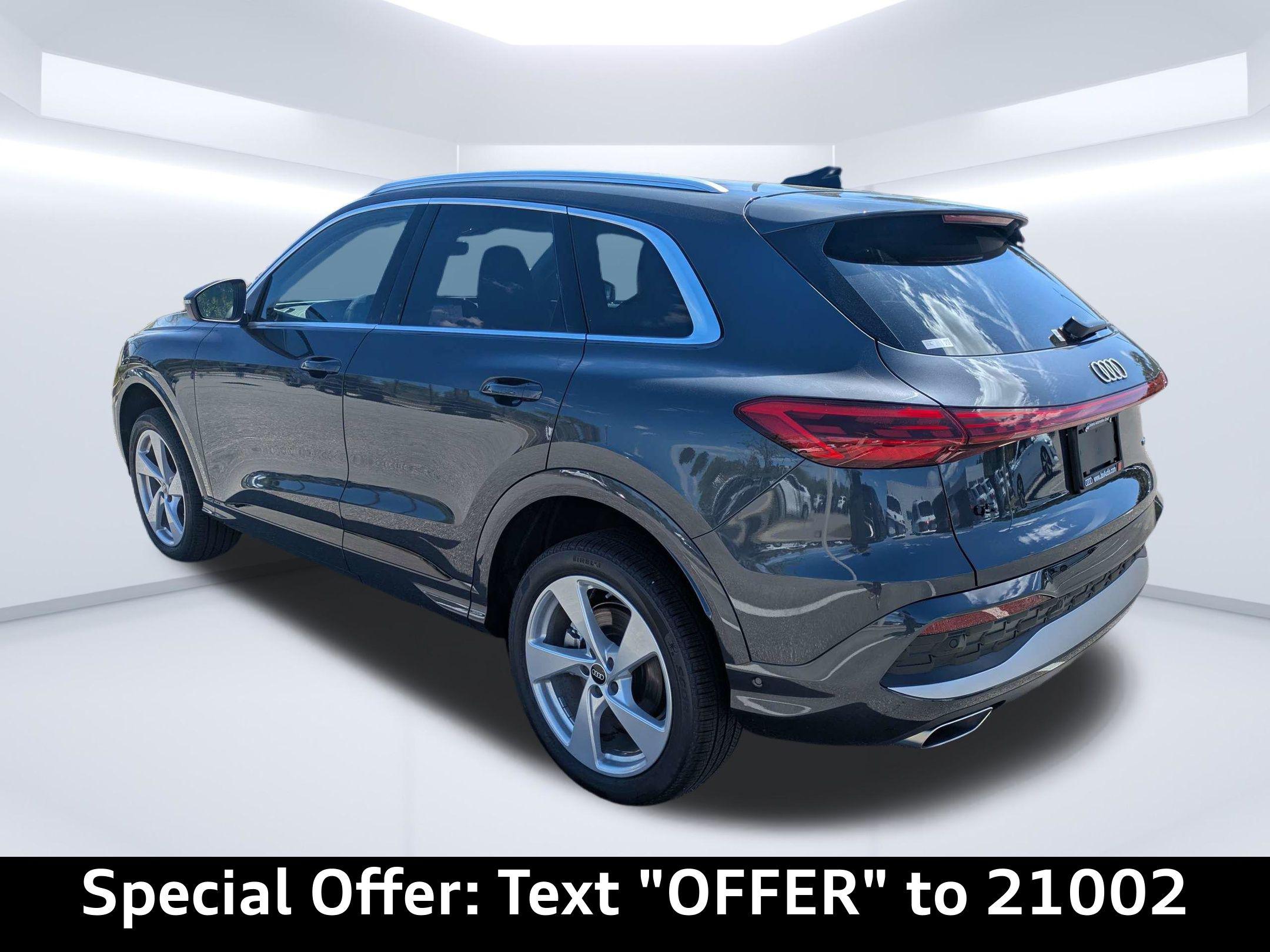 Imagine yourself cruising down A1A in Neptune Beach, windows down, the ocean breeze filling the cabin, as you head to your favorite seafood spot. The all-new 2025 Audi Q5 Premium Plus isn't just an SUV; it's your gateway to experiencing the best of Northeast Florida, blending luxury with practicality for your active lifestyle. This Tambora Gray Metallic beauty is ready to redefine your daily drive. The 2025 Audi Q5 Premium Plus is engineered to handle everything from your daily commute to weekend adventures. Its 2.0L TFSI 4-Cylinder engine delivers a responsive 268 horsepower, providing ample power for merging onto I-95 or navigating the scenic roads around Ponte Vedra Beach. The 7-Speed S Tronic automatic transmission ensures smooth, precise shifts, while the legendary quattro all-wheel drive system offers enhanced traction and stability in any weather. Whether you're hauling golf clubs to the TPC Sawgrass or navigating a sudden downpour, the Q5's advanced drivetrain provides confidence and control. The Audi drive select system allows you to tailor the driving experience to your preference, optimizing performance for efficiency or sporty handling. With its robust engine block and efficient cooling system, the Q5 is built for long-lasting reliability, ensuring years of driving pleasure. Stay connected and entertained on every journey with the Q5's cutting-edge technology. The MMI Navigation Plus radio boasts a stunning 14.5-inch primary touchscreen display, providing intuitive access to navigation, media, and vehicle settings. Wireless Apple CarPlay and wired Android Auto integration allows seamless smartphone connectivity, so you can stream your favorite playlists or podcasts during your commute. The available Bang & Olufsen Sound System with 3D Sound transforms the cabin into a concert hall, delivering an immersive audio experience for you and your passengers. With four USB ports and wireless device charging, everyone can stay powered up on long road trips. The head-up display projects essential information onto the windshield, keeping your eyes on the road while staying informed. Step inside the Q5 Premium Plus and experience a new level of comfort and refinement. The Heated Front Bucket Seats with Leather Seating Surfaces provide exceptional support and warmth on chilly mornings. The dual-zone automatic climate control ensures personalized comfort for both driver and passenger, while rear passengers can enjoy their own climate settings. The power liftgate provides easy access to the spacious cargo area, perfect for hauling groceries, sports equipment, or luggage for a weekend getaway. With memory settings for the driver's seat and mirrors, you can effortlessly return to your preferred driving position. The panoramic sunroof fills the cabin with natural light, creating an open and airy atmosphere. Aluminum rhombus inlays add a touch of modern elegance to the interior, while the leather steering wheel provides a luxurious feel. Your safety is paramount, and the 2025 Audi Q5 Premium Plus is equipped with a comprehensive suite of advanced safety features. Adaptive Cruise Control maintains a safe following distance, while Blind Spot Monitoring alerts you to vehicles in your blind spots. Automatic Emergency Braking helps prevent or mitigate collisions, providing an extra layer of protection. The Top View Camera System provides a 360-degree view of your surroundings, making parking and maneuvering in tight spaces a breeze. With six airbags, including front, side, and overhead airbags, the Q5 provides comprehensive occupant protection. Lane departure assist helps you stay centered in your lane, while rear cross traffic assist warns you of approaching vehicles when backing up. The 2025 Audi Q5 Premium Plus makes a bold statement with its sleek and modern design. The Tambora Gray Metallic paint finish exudes sophistication, while the 20-inch 5-Arm Design wheels add a touch of sporty flair. The LED headlights provide exceptional visibility, while the signature Audi grille and sculpted body lines create a distinctive and eye-catching look. Roof rails offer added versatility for carrying luggage or sports equipment, while the rear spoiler enhances aerodynamics and adds a touch of sportiness. The panoramic sunroof lets natural light flood the cabin, enhancing the sense of spaciousness and connection to the outdoors. You can find matching Accessories at our store. Here's a quick look at some of the standout features of the 2025 Audi Q5 Premium Plus: Audi Jacksonville is conveniently located near Palm Coast, making it easy to experience the all-new 2025 Audi Q5 Premium Plus for yourself. Visit us at 11401 Atlantic Blvd, Jacksonville, FL 32225, or Call us at (904) 367-3700 to schedule a test drive. Our friendly and knowledgeable team is ready to answer your questions, discuss financing options, and help you find the perfect Audi to fit your lifestyle. You can also get a trade-in value online. We look forward to welcoming you to Audi Jacksonville! Build Codes: WPS | 3FU | USB | BANG | TOPV | CRUISE | INLP | ANIME | DILGT | STRHD | HEADUP | WASHER | LEDHP | 48P | NONWL2 | NONTR | 1D6 | AY | STDEN | STDRD | STDST | STDTM2025 Audi All-new Q5 Premium Plus: Elevate Your Everyday