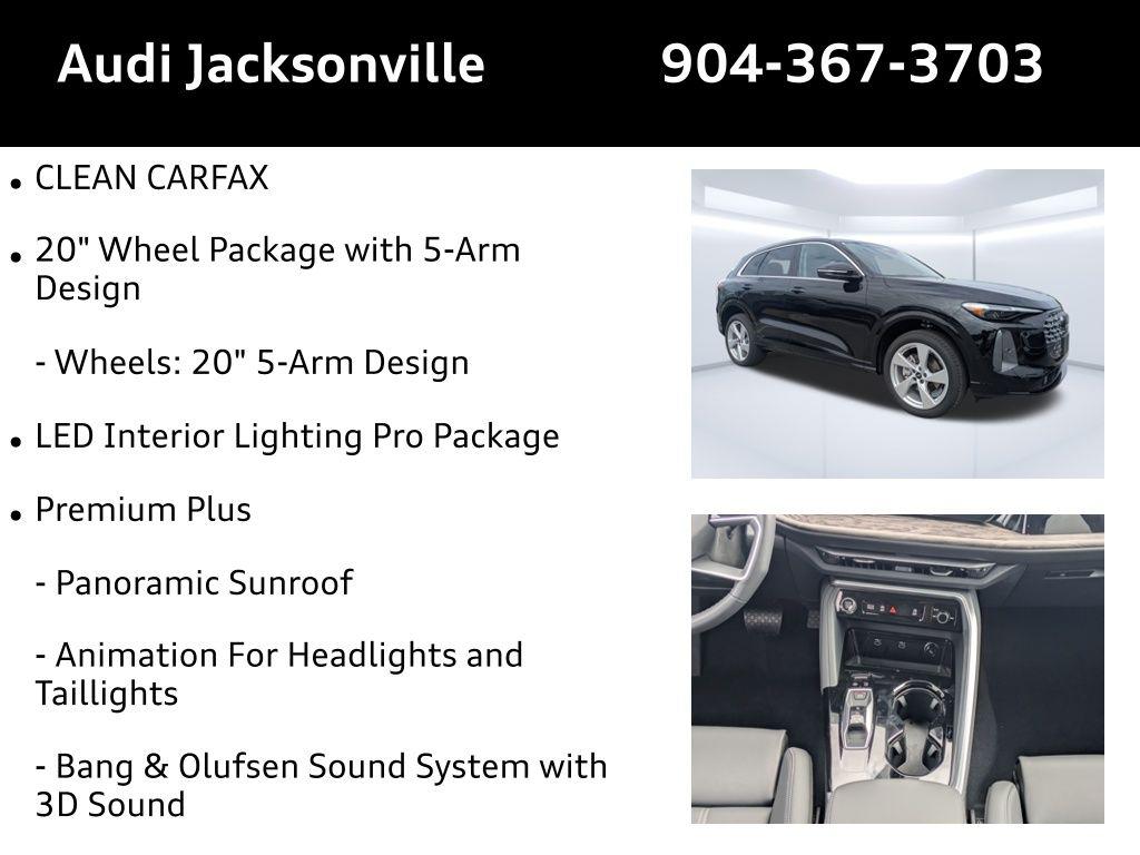 At Audi Jacksonville, located at 11401 Atlantic Blvd, Jacksonville, FL 32225, we proudly present the 2025 Audi All-new Q5 Premium Plus TFSI quattro S tronic—a vehicle designed to enhance every aspect of your life. Whether you're navigating the bustling streets of downtown Jacksonville or heading out for a weekend retreat in the serene suburbs, this luxury sport utility vehicle is crafted to meet your every need. Experience the seamless blend of power and precision with the 2.0L I-4 engine delivering a robust 268 horsepower. The quattro ultra all-wheel drive system ensures unmatched traction, making it perfect for tackling unpredictable Florida weather or hitting the sandy trails of nearby beaches. With the 7-speed S tronic transmission, enjoy smooth transitions and dynamic driving, whether you're commuting or exploring. Stay connected and in control with the Audi connect NAV & PLUS integrated navigation system, ensuring you never miss a turn. The Bang & Olufsen speaker system with 19 speakers envelops you in rich sound, turning every drive into a concert experience. Meanwhile, the head-up display keeps essential information right in your line of sight, allowing you to keep your eyes on the road and hands on the wheel. The Q5 is equipped with advanced safety features such as Audi pre sense city, offering pedestrian impact prevention, and Audi side assist for blind spot monitoring. The adaptive cruise control with traffic jam assist makes lengthy commutes stress-free, while the front and rear parking sensors simplify urban parking. Inside, the leather seating surfaces and heated front seats ensure comfort, and the dual-zone climate control keeps everyone comfortable, regardless of the season. The elegant Mythos Black Metallic exterior and sophisticated leather interior are complemented by genuine wood accents, exuding luxury and style. The power liftgate and ample cargo space make family outings and shopping trips a breeze. Plus, the roof rack is perfect for adventure seekers heading to the coast with surfboards or kayaks. With wireless Apple CarPlay and wired Android Auto, integrate your smart device effortlessly. The Audi advanced key allows for easy entry and ignition with just a touch, while the Audi smartphone interface keeps you connected on the go. Plus, the over-the-air updates ensure your vehicle's technology stays current without a trip to the dealer. Take the first step towards owning the 2025 Audi Q5. Visit Audi Jacksonville or call us at 904-367-3700 to schedule a personalized test drive. Discover competitive financing options with our Credit Application, or explore the value of your current vehicle with our Value Your Trade tool. Don’t miss out on the opportunity to elevate your driving experience today!2025 Audi All-new Q5 Premium Plus TFSI quattro S tronic: Elevate Your Everyday