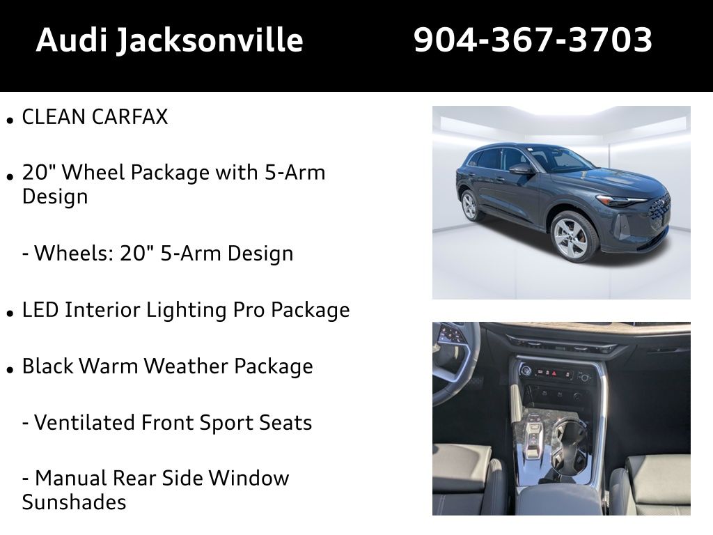Imagine yourself cruising down A1A in Neptune Beach, windows down, the ocean breeze filling the cabin, as you head to your favorite seafood spot. The all-new 2025 Audi Q5 Premium Plus isn't just an SUV; it's your gateway to experiencing the best of Northeast Florida, blending luxury with practicality for your active lifestyle. This Tambora Gray Metallic beauty is ready to redefine your daily drive. The 2025 Audi Q5 Premium Plus is engineered to handle everything from your daily commute to weekend adventures. Its 2.0L TFSI 4-Cylinder engine delivers a responsive 268 horsepower, providing ample power for merging onto I-95 or navigating the scenic roads around Ponte Vedra Beach. The 7-Speed S Tronic automatic transmission ensures smooth, precise shifts, while the legendary quattro all-wheel drive system offers enhanced traction and stability in any weather. Whether you're hauling golf clubs to the TPC Sawgrass or navigating a sudden downpour, the Q5's advanced drivetrain provides confidence and control. The Audi drive select system allows you to tailor the driving experience to your preference, optimizing performance for efficiency or sporty handling. With its robust engine block and efficient cooling system, the Q5 is built for long-lasting reliability, ensuring years of driving pleasure. Stay connected and entertained on every journey with the Q5's cutting-edge technology. The MMI Navigation Plus radio boasts a stunning 14.5-inch primary touchscreen display, providing intuitive access to navigation, media, and vehicle settings. Wireless Apple CarPlay and wired Android Auto integration allows seamless smartphone connectivity, so you can stream your favorite playlists or podcasts during your commute. The available Bang & Olufsen Sound System with 3D Sound transforms the cabin into a concert hall, delivering an immersive audio experience for you and your passengers. With four USB ports and wireless device charging, everyone can stay powered up on long road trips. The head-up display projects essential information onto the windshield, keeping your eyes on the road while staying informed. Step inside the Q5 Premium Plus and experience a new level of comfort and refinement. The Heated Front Bucket Seats with Leather Seating Surfaces provide exceptional support and warmth on chilly mornings. The dual-zone automatic climate control ensures personalized comfort for both driver and passenger, while rear passengers can enjoy their own climate settings. The power liftgate provides easy access to the spacious cargo area, perfect for hauling groceries, sports equipment, or luggage for a weekend getaway. With memory settings for the driver's seat and mirrors, you can effortlessly return to your preferred driving position. The panoramic sunroof fills the cabin with natural light, creating an open and airy atmosphere. Aluminum rhombus inlays add a touch of modern elegance to the interior, while the leather steering wheel provides a luxurious feel. Your safety is paramount, and the 2025 Audi Q5 Premium Plus is equipped with a comprehensive suite of advanced safety features. Adaptive Cruise Control maintains a safe following distance, while Blind Spot Monitoring alerts you to vehicles in your blind spots. Automatic Emergency Braking helps prevent or mitigate collisions, providing an extra layer of protection. The Top View Camera System provides a 360-degree view of your surroundings, making parking and maneuvering in tight spaces a breeze. With six airbags, including front, side, and overhead airbags, the Q5 provides comprehensive occupant protection. Lane departure assist helps you stay centered in your lane, while rear cross traffic assist warns you of approaching vehicles when backing up. The 2025 Audi Q5 Premium Plus makes a bold statement with its sleek and modern design. The Tambora Gray Metallic paint finish exudes sophistication, while the 20-inch 5-Arm Design wheels add a touch of sporty flair. The LED headlights provide exceptional visibility, while the signature Audi grille and sculpted body lines create a distinctive and eye-catching look. Roof rails offer added versatility for carrying luggage or sports equipment, while the rear spoiler enhances aerodynamics and adds a touch of sportiness. The panoramic sunroof lets natural light flood the cabin, enhancing the sense of spaciousness and connection to the outdoors. You can find matching Accessories at our store. Here's a quick look at some of the standout features of the 2025 Audi Q5 Premium Plus: Audi Jacksonville is conveniently located near Palm Coast, making it easy to experience the all-new 2025 Audi Q5 Premium Plus for yourself. Visit us at 11401 Atlantic Blvd, Jacksonville, FL 32225, or Call us at (904) 367-3700 to schedule a test drive. Our friendly and knowledgeable team is ready to answer your questions, discuss financing options, and help you find the perfect Audi to fit your lifestyle. You can also get a trade-in value online. We look forward to welcoming you to Audi Jacksonville! Build Codes: WPS | 3FU | USB | BANG | TOPV | CRUISE | INLP | ANIME | DILGT | STRHD | HEADUP | WASHER | LEDHP | 48P | NONWL2 | NONTR | 1D6 | AY | STDEN | STDRD | STDST | STDTM2025 Audi All-new Q5 Premium Plus: Elevate Your Everyday