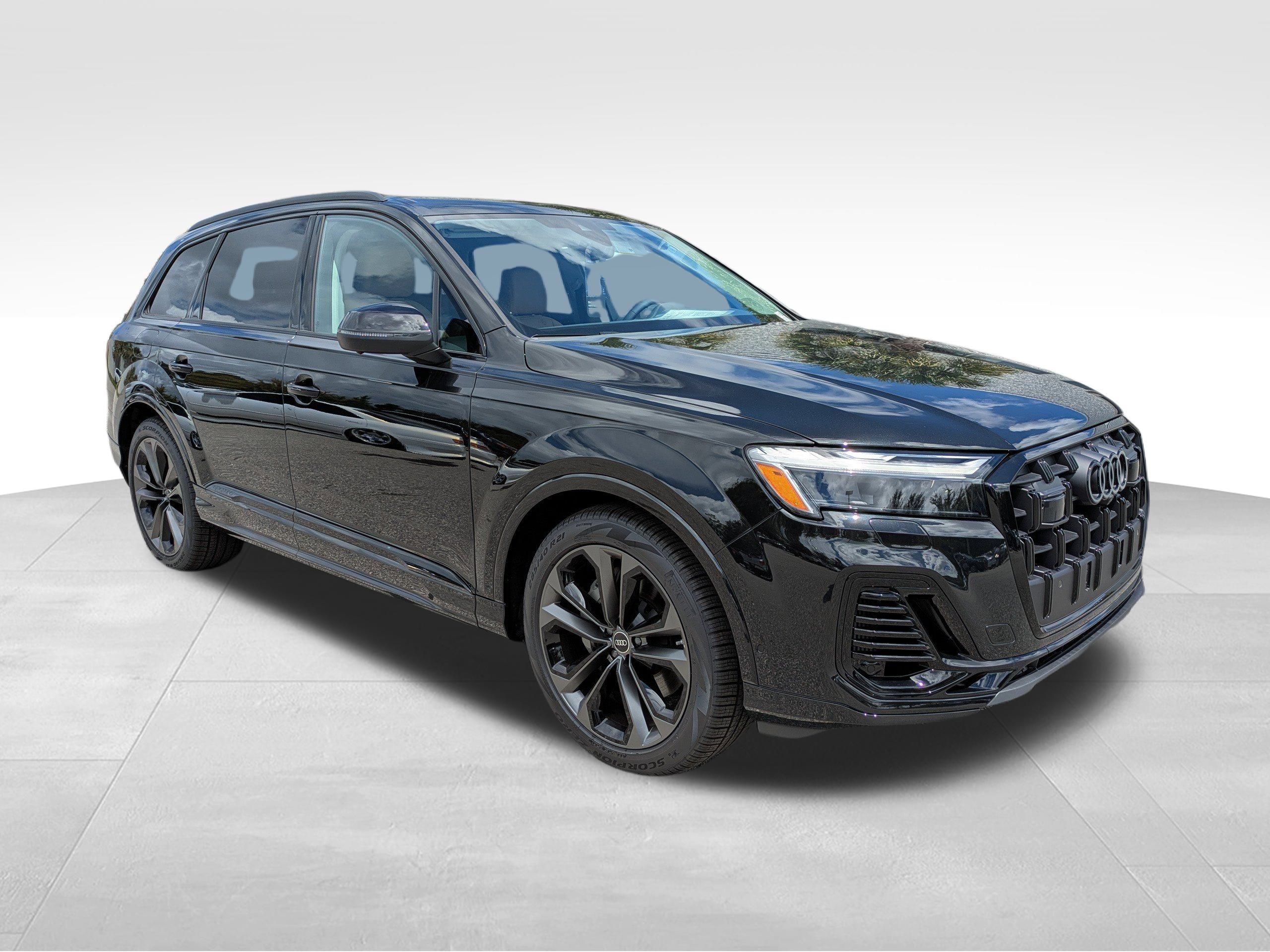 Mythos Black Metallic 2025 Audi Q7 55 TFSI quattro Premium Plus quattro 8-Speed Automatic with Tiptronic 3.0L TFSI 7-Pin Adapter, ABS brakes, Alloy wheels, Anthracite Gray Audi Rings, Audi Beam Rings, Audi Guard Protection Kit, Black Door Blades, Black Exterior Trim, Black Grille, Black Optic Package, Black Roof Rails, Black Window Surrounds, Comfort Adaptive Air Suspension, Compass, Convenience Package, Dark Chrome Exhaust Tips, Electronic Stability Control, Executive Plus Package, Four-Zone Automatic Climate Control, Front dual zone A/C, Heated door mirrors, Heated Front Bucket Seats, Heated front seats, Heated Rear Seats, Heated Steering Wheel, Illuminated Door Sills, Illuminated entry, LED Interior Lighting Package Plus, Low tire pressure warning, Power Liftgate, Power Soft-Closing Doors, Premium Plus Package, Privacy Trunk Cover, Remote keyless entry, Top View Camera System, Traction control, Traffic Sign Recognition, Trailer Hitch, Wheels: 21"" 5-Double-Spoke-Design Matte Gray.