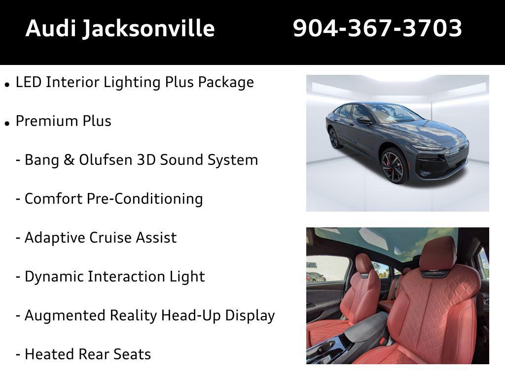 Experience the future of driving with the 2025 Audi S6 e-tron Premium Plus, a vehicle that combines cutting-edge technology with unparalleled luxury. As you cruise through Jacksonville's vibrant streets or head for a weekend at the beaches of Atlantic Beach, the dual electric motor engine and quattro all-wheel drive deliver seamless power and precision handling. Whether you're navigating urban landscapes or venturing out on a scenic drive along the coast, the adaptive suspension and automatic height-adjustable ride ensure every journey is smooth and responsive. Plus, the regenerative braking system not only enhances efficiency but also adds a layer of responsibility to your thrilling rides. Step inside the S6 e-tron and discover a sanctuary of advanced technology. The Audi virtual cockpit plus and MMI Navigation plus keep you connected and informed, while the augmented reality head-up display projects critical information directly onto your windshield, allowing you to keep your eyes on the road. For an immersive audio experience, the Bang & Olufsen 3D Sound System with 16 speakers envelops you in rich, concert-like sound. Whether you're commuting to downtown Jacksonville or embarking on a weekend getaway, the smartphone integration with wireless Apple CarPlay and Android Auto keeps your digital life effortlessly connected. Safety is paramount in the S6 e-tron, equipped with features like Audi pre sense front and rear cross traffic assist to protect you and your loved ones. Maneuvering in tight spaces becomes a breeze with the top view camera system and park assist plus, perfect for parking at the bustling St. Johns Town Center or your neighborhood garage. Comfort is also at the forefront, with heated massaging and ventilated front sport seats wrapped in luxurious Nappa leather, ensuring you arrive at your destination relaxed and refreshed. The S6 e-tron's Magnet Gray exterior with Anthracite Audi Rings and 21-inch Black Optic Package exudes a dynamic yet elegant presence. Inside, the fine Nappa leather seating surfaces in Arras Red add sophistication to every drive. For family outings or shopping trips, the power liftgate and spacious cargo area make loading and unloading effortless. The Audi Guard All-Weather Mats and Cargo Mat provide practical protection against the elements, keeping your vehicle pristine. Don't miss the opportunity to own this remarkable blend of performance, luxury, and technology. Visit Audi Jacksonville at 11401 Atlantic Blvd, Jacksonville, FL 32225 for a test drive. Call us today at 904-367-3700 to learn more about our flexible financing options and discover how the Audi S6 e-tron can enhance your lifestyle. Ready to take the next step? Apply for financing at Audi Jacksonville Credit Application or get an estimate on your current vehicle's trade-in value with our Value Your Trade tool. This vehicle is more than a mode of transportation; it's an extension of your aspirations and achievements. Embrace the future with the 2025 Audi S6 e-tron Premium Plus.2025 Audi S6 e-tron Premium Plus: Elevate Your Drive in Jacksonville