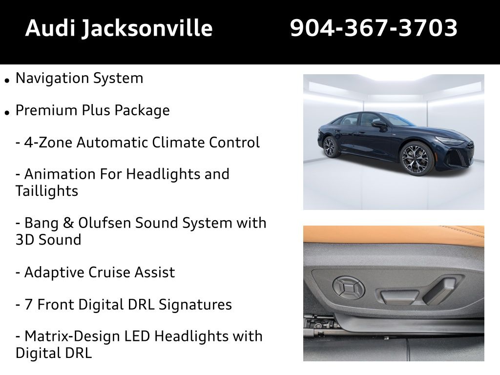 Welcome to a new era of driving with the 2026 Audi A6 Premium quattro S tronic, where luxury meets precision engineering. This exquisite sedan, now at Audi Jacksonville, is designed for those who demand more from their vehicles. Whether navigating the bustling streets of Jacksonville or embarking on a weekend getaway to the serene beaches, the A6 is your perfect companion. Under the hood, the A6 boasts a robust 3L V-6 gasoline direct injection engine. This powerhouse delivers an impressive 362HP, ensuring you have the performance to conquer any road. The quattro ultra all-wheel drive system offers exceptional traction and stability, making it ideal for the unpredictable Florida weather. With the Audi drive select, tailor your driving experience to match your mood, whether you're cruising along the coast or tackling a winding country road. Step inside and immerse yourself in a world of cutting-edge technology. The Audi virtual cockpit plus offers an immersive driving experience, while the Bang & Olufsen 3D Premium sound system with 16 speakers transforms every journey into a concert hall experience. Stay connected with the Audi MMI Navigation plus and wireless Apple CarPlay & Android Auto, ensuring you have seamless access to all your apps and navigation. Safety is paramount in the A6, equipped with an array of advanced features such as Audi pre sense for forward collision warning and Audi side assist for blind spot monitoring. The top view camera system with a virtual 360 view ensures you have complete awareness of your surroundings, perfect for tight urban parking spaces. Inside, enjoy the comfort of ventilated front seats and a four-zone climate control system, keeping every passenger comfortable during those hot Jacksonville summers. Picture yourself driving to a family outing at Jacksonville's stunning parks or heading downtown for a business meeting. The A6's spacious interior and leather seating surfaces provide the ultimate in comfort and elegance. The power rear windshield blind ensures privacy and protection from the sun, while the adaptive cruise control with stop-and-go functionality makes long drives a breeze. Don't miss the opportunity to own this masterpiece of engineering. Visit us at Audi Jacksonville or call us at 904-367-3700. Ready to experience the A6 for yourself? Apply for financing through our Credit Application or get a trade value for your current vehicle using our Value Your Trade tool. Embrace the Audi experience today!Discover the 2026 Audi A6 Premium quattro S tronic—A Symphony of Luxury and Performance