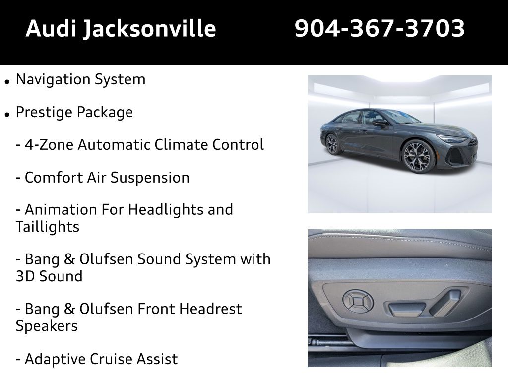 Imagine gliding through the oak-lined streets of San Jose, the sun glinting off the Daytona Gray finish of your new Audi A6 as you head home after a productive day. The anticipation builds as you consider the weekend ahead – perhaps a round of golf at Ponte Vedra Beach, followed by a relaxed evening with friends. This isn't just transportation; it's a statement. The 2026 Audi A6 Prestige quattro S tronic isn't just a car; it's an experience meticulously crafted for the discerning driver. It’s designed for those who appreciate the finer things, demand peak performance, and expect cutting-edge technology seamlessly integrated into their daily lives. From its powerful engine to its luxurious interior, every detail of the A6 speaks to a commitment to excellence and an unwavering pursuit of automotive perfection. Get ready to redefine your drive. The 2026 Audi A6 Prestige isn't just about luxury; it's engineered for a responsive and confident driving experience, whether you're navigating the daily commute or enjoying a weekend escape. Its 3.0L V-6 DOHC engine, featuring an aluminum block for reduced weight and enhanced thermal management, delivers exhilarating power. Paired with the smooth-shifting 7-speed S tronic automatic transmission, you'll experience seamless acceleration and precise gear changes. The legendary quattro all-wheel drive system provides exceptional grip and stability, giving you the confidence to tackle varied road conditions. Whether you're facing a sudden downpour on your way home to Nocatee or navigating the occasional sandy patch near Neptune Beach, the A6 maintains composure and control. Audi Drive Select lets you tailor the driving experience to your preference, offering different modes that adjust the engine, transmission, steering, and suspension settings. The A6's sophisticated suspension system, featuring independent front and rear setups, ensures a comfortable and controlled ride. The available adaptive ride suspension automatically adjusts to road conditions, providing a smooth and refined experience, perfect for long drives along the A1A near Ponte Vedra Beach. With features like engine oil cooler and transmission oil cooler, the A6 is built to handle demanding driving conditions, ensuring optimal performance and longevity. The start-stop engine technology enhances fuel efficiency, making your daily drives more economical without sacrificing performance. The A6 offers a driving experience that is both engaging and refined. Stay connected and entertained in the 2026 Audi A6, where cutting-edge technology enhances every drive. The centerpiece is the Audi MMI Navigation plus system with its responsive 14.5-inch touchscreen display, putting intuitive control at your fingertips. Whether you're navigating to a tee time at one of Ponte Vedra Beach's premier golf courses or finding the quickest route through Jacksonville, the system offers real-time traffic updates and voice-activated controls to keep you focused on the road. For seamless smartphone integration, enjoy wireless Apple CarPlay and Android Auto, allowing you to stream your favorite playlists or podcasts on your commute. The available Bang & Olufsen 3D Premium Sound System transforms the cabin into a concert hall, while the Audi virtual cockpit plus provides a customizable digital display behind the steering wheel, offering key vehicle information at a glance. Passengers will appreciate the available front passenger touchscreen, providing access to entertainment and navigation controls. Stay charged on the go with the convenient wireless device charging pad, and multiple USB ports ensure everyone's devices stay powered up. The head-up display projects essential information onto the windshield, keeping your eyes on the road ahead, while Bluetooth connectivity allows for hands-free calls and audio streaming. These features combine to make every journey, whether a quick trip to Neptune Beach or a longer family road trip, a connected and enjoyable experience. Sink into the luxurious embrace of the 2026 Audi A6 Prestige, where every detail is crafted for your comfort. The Nappa leather seats, with both heating and ventilation, ensure optimal comfort whether you're navigating a steamy Jacksonville afternoon or enjoying a crisp morning drive along the A1A near Ponte Vedra Beach. With four-zone climate control, everyone enjoys their ideal temperature. The A6's interior offers a sanctuary from the everyday. Memory settings for the driver's seat, mirrors, and steering wheel ensure your perfect driving position is always ready. Genuine wood inlays and piano black accents add a touch of sophistication. Power rear sunshades provide added privacy and sun protection for rear passengers. Weekend trips to Palm Coast are a breeze with the A6's versatile cargo space and convenient power trunk release. The 40/20/40 split-folding rear seats easily accommodate longer items. Thoughtful touches like the refrigerated glovebox and multiple 12V power outlets enhance every journey. The leather-wrapped steering wheel, complete with heating, provides a premium feel, even on the coldest mornings. With features like remote start and keyless entry, convenience is always at your fingertips. The 2026 Audi A6 prioritizes your peace of mind with a comprehensive suite of safety and driver assistance technologies. Whether you're navigating the bustling streets of San Jose or cruising along the A1A near Neptune Beach, these features provide an added layer of confidence. Advanced collision avoidance systems, including Forward Collision Warning and Brake Assist, are designed to help mitigate potential incidents. Lane Departure Warning keeps you centered, while Blind Spot Monitoring provides an extra set of eyes when merging onto I-95. The Adaptive Cruise Control system with lane guidance makes highway driving more relaxed and secure. Maneuvering in tight spots is simplified with Front and Rear Parking Sensors and a Top View Camera System, offe