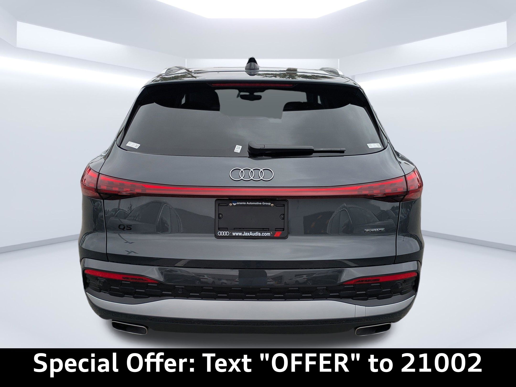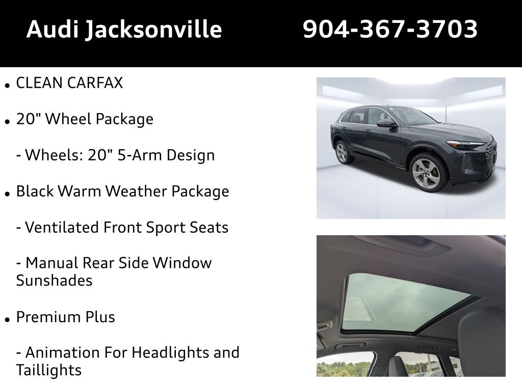 Imagine yourself cruising down A1A in Neptune Beach, the ocean breeze gently tousling your hair, as you head to your favorite beachfront cafe. Or perhaps you're navigating the tree-lined streets of San Jose, en route to a weekend brunch with friends. The 2026 Audi Q5 2.0T Premium Plus is ready to elevate every journey, seamlessly blending luxury with practicality for your active Jacksonville lifestyle. The 2026 Audi Q5 2.0T Premium Plus is engineered to deliver a refined driving experience, whether you're commuting to downtown Jacksonville or embarking on a weekend adventure. Powered by a responsive 2.0L 4-Cylinder TFSI engine paired with a smooth-shifting 7-Speed Automatic S tronic transmission, this SUV offers the perfect balance of performance and efficiency. The legendary quattro All-Wheel Drive system provides enhanced traction and stability, giving you confidence in various driving conditions. With an EPA-estimated fuel economy of 22 city / 30 highway MPG, you can enjoy the drive without constant worry about refueling. Stay connected and informed on every journey with the advanced technology features of the 2026 Audi Q5 2.0T Premium Plus. The Radio: MMI Navigation Plus system, enhanced with Navigation system: Audi connect NAV & PLUS, provides intuitive route guidance and real-time traffic updates, ensuring you always arrive at your destination with ease. The Steering wheel mounted audio controls allow you to effortlessly manage your entertainment without taking your hands off the wheel. An Outside temperature display keeps you informed of changing conditions. Step inside the 2026 Audi Q5 2.0T Premium Plus and experience a sanctuary of comfort and sophistication. Sink into the supportive Heated Front Bucket Seats with Leather Seating Surfaces, perfect for those cooler mornings. The Power driver seat and Power passenger seat, combined with Memory seat function, allow you to find your ideal driving position with ease. Enjoy the natural light and fresh air with the Power moonroof: Panoramic. The convenience of Power windows, Power door mirrors, Power steering, and Remote keyless entry enhance your daily driving experience. The Power Liftgate simplifies loading and unloading cargo, while the Leather steering wheel adds a touch of elegance. The Rear seat center armrest and Split folding rear seat offer versatility for passengers and cargo alike. Heated door mirrors ensure clear visibility in colder weather. Your safety is paramount in the 2026 Audi Q5 2.0T Premium Plus. Equipped with ABS brakes, 4-Wheel Disc Brakes, and Brake assist, this SUV provides confident stopping power in various situations. The Exterior Parking Camera Rear offers enhanced visibility when maneuvering in tight spaces. The Dual front impact airbags, Dual front side impact airbags, and Overhead airbag provide comprehensive protection in the event of a collision. Adaptive Cruise Control helps maintain a safe following distance on the highway. Occupant sensing airbag adds an extra layer of safety. The 2026 Audi Q5 2.0T Premium Plus exudes modern elegance and sporty sophistication. Finished in stunning Tambora Gray Metallic, this SUV commands attention on any road. The Alloy wheels and Bumpers: body-color enhance its sleek profile, while the Spoiler adds a touch of athleticism. The Auto tilt-away steering wheel provides added convenience. Auto High-beam Headlights, Front fog lights, and Rear fog lights improve visibility in challenging conditions. The Four wheel independent suspension, Telescoping steering wheel, and Tilt steering wheel contribute to a smooth and controlled ride. Front reading lights and Rear reading lights provide convenient illumination. Experience the 2026 Audi Q5 2.0T Premium Plus for yourself at Audi Jacksonville, conveniently located at 11401 Atlantic Blvd, Jacksonville, FL 32225. Whether you're coming from Ponte Vedra Beach or Palm Coast, we're just a short drive away. Our team is ready to assist you with all your automotive needs. Get Directions to Audi Jacksonville. Call us at (904) 367-3700 to schedule a test drive or learn more. You can also Value Your Trade or Credit Application online. We look forward to welcoming you to Audi Jacksonville!2026 Audi Q5 2.0T Premium Plus: Elevate Your Everyday Drive