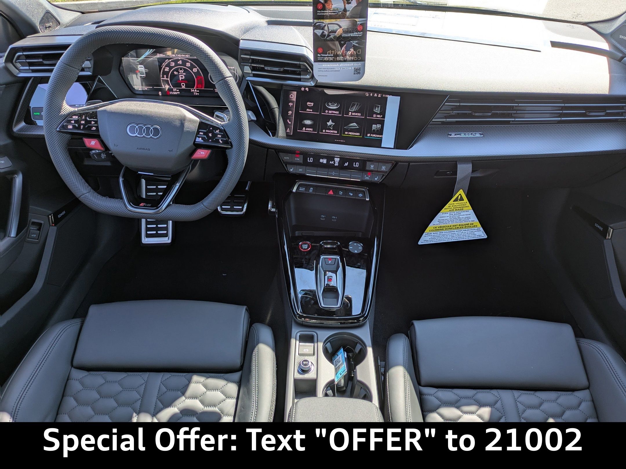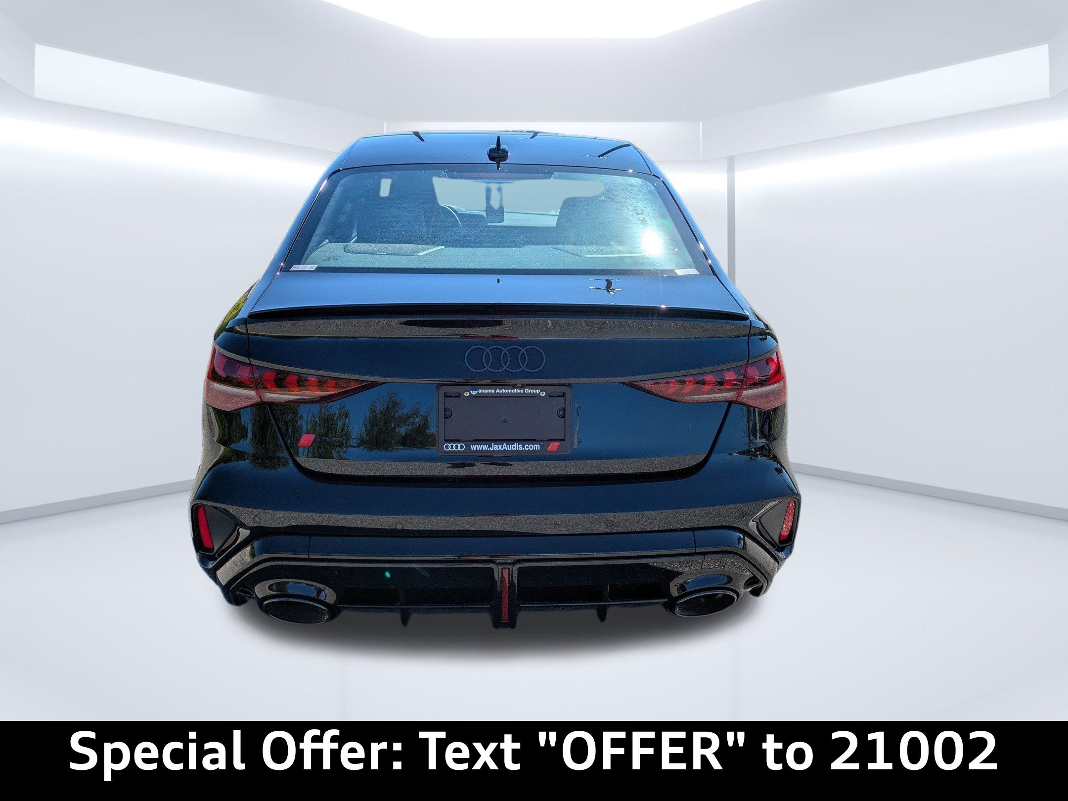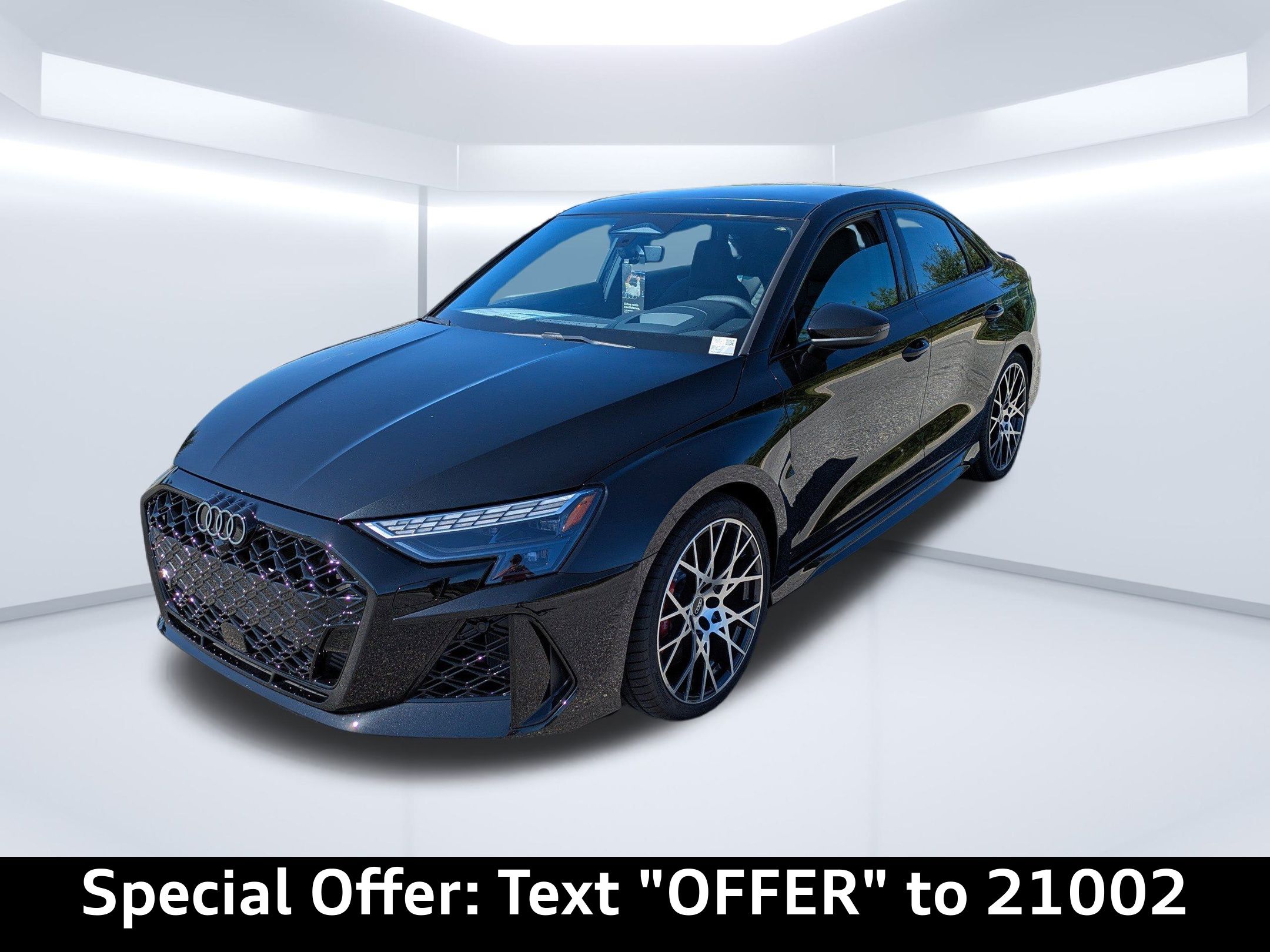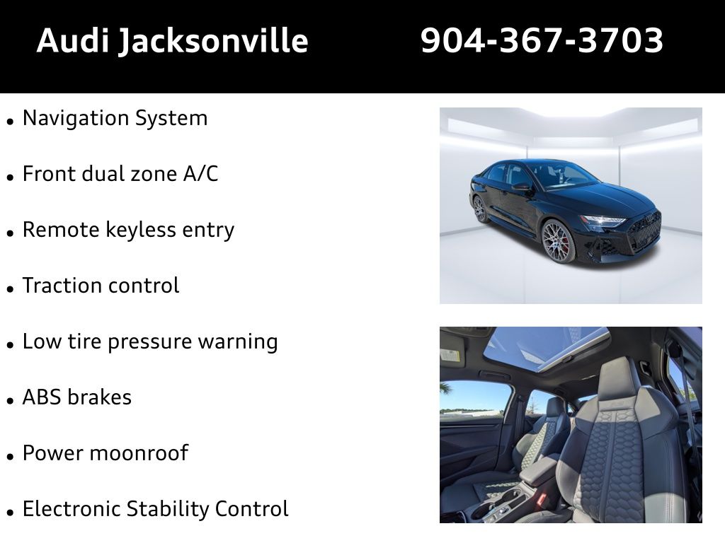 Welcome to the ultimate driving experience with the 2026 Audi RS 3 TFSI quattro S tronic, now available at Audi Jacksonville. Whether you're cruising through Jacksonville's vibrant streets or escaping to the serene beaches, this vehicle delivers unparalleled performance and style. Power through your daily commute with a 2.5L I-5 engine boasting 394 horsepower, seamlessly paired with a 7-Speed S Tronic Dual-Clutch Automatic Transmission. The full-time quattro All-Wheel Drive and adaptive suspension adapt effortlessly to Florida's diverse landscapes, ensuring a smooth ride on any terrain. Stay connected on every journey with the Audi Virtual Cockpit Plus, featuring a stunning 12.3-inch display that keeps essential information at your fingertips. As you navigate the bustling Jacksonville roads or plan a weekend getaway, the MMI Navigation Plus with touch response and real-time traffic updates ensures you're always on the right path. Enjoy crystal-clear audio through the SONOS Premium Sound System with 3D Sound, perfect for those long drives along the coast. Plus, the integration of Apple CarPlay and Android Auto keeps you seamlessly connected to your digital world. Safety is paramount in the 2026 Audi RS 3. Equipped with Audi pre sense basic and front collision mitigation, the vehicle offers peace of mind whether you're navigating crowded city streets or open highways. The blind spot monitor and rear cross traffic alert are invaluable for parking in busy areas like downtown Jacksonville. Inside, indulge in the luxury of Fine Nappa Leather seats with heated front sport seats. The dual-zone climate control system ensures you and your passengers enjoy personalized comfort, regardless of the Florida heat. Turn heads wherever you go with the mythos black metallic exterior, complemented by a striking black grille and Phantom Black Polished wheels. The sport exhaust system with black tips and red painted brake calipers add a sporty flair, while the power moonroof invites the Florida sunshine into your drive. The LED Matrix-design headlights ensure excellent visibility, day or night, making every journey a safe and stylish affair. The 2026 Audi RS 3 TFSI quattro S tronic isn't just a car—it's a statement. It's designed for those who value performance, luxury, and cutting-edge technology. Don't miss your chance to experience this remarkable vehicle. Visit Audi Jacksonville at 11401 Atlantic Blvd, Jacksonville, FL 32225, or call us at 904-367-3700 to schedule your test drive today. Ready to make it yours? Start by filling out our Credit Application or get a trade value on your current vehicle using our Value Your Trade tool. This thrilling ride won’t last long—seize the opportunity to own the road with the Audi RS 3.2026 Audi RS 3 TFSI quattro S tronic: Unleash the Road