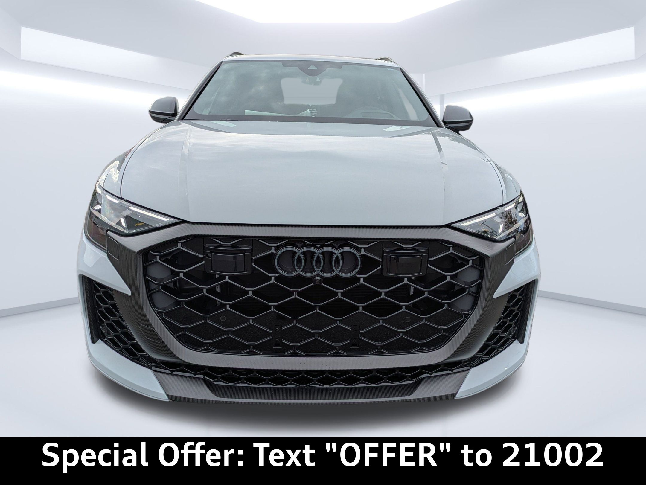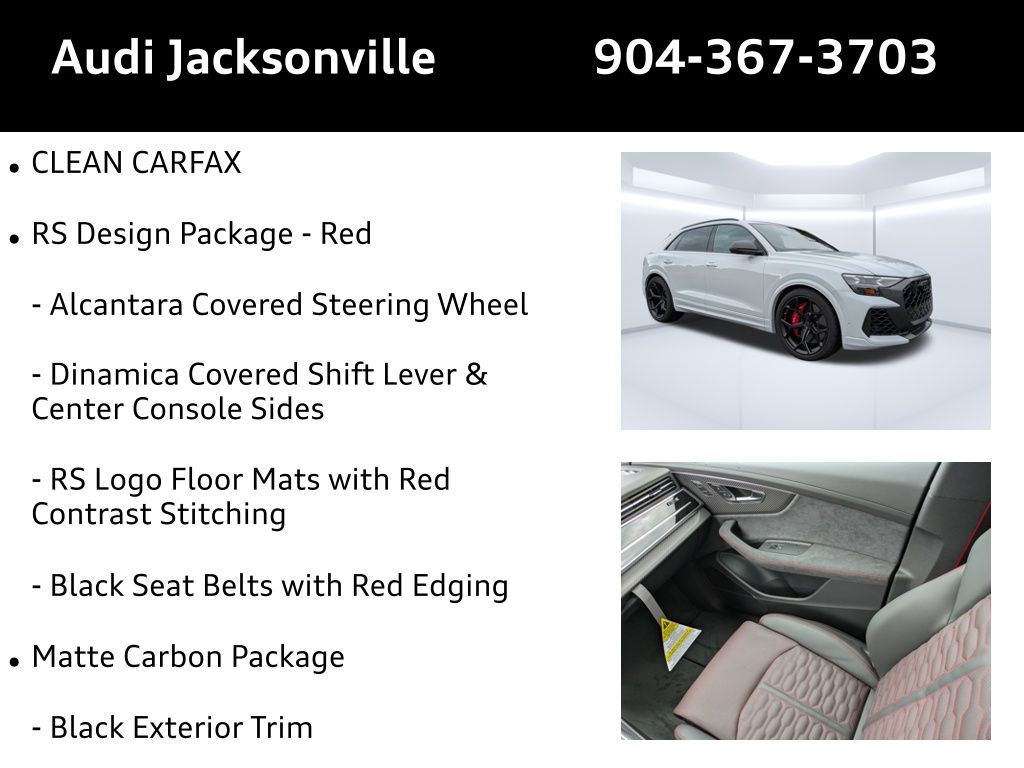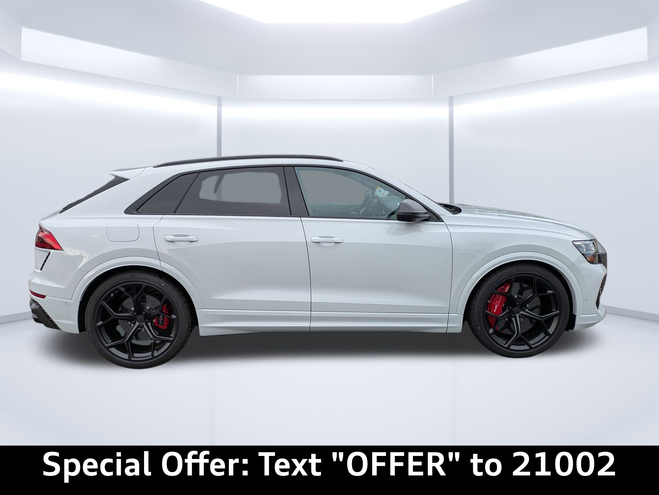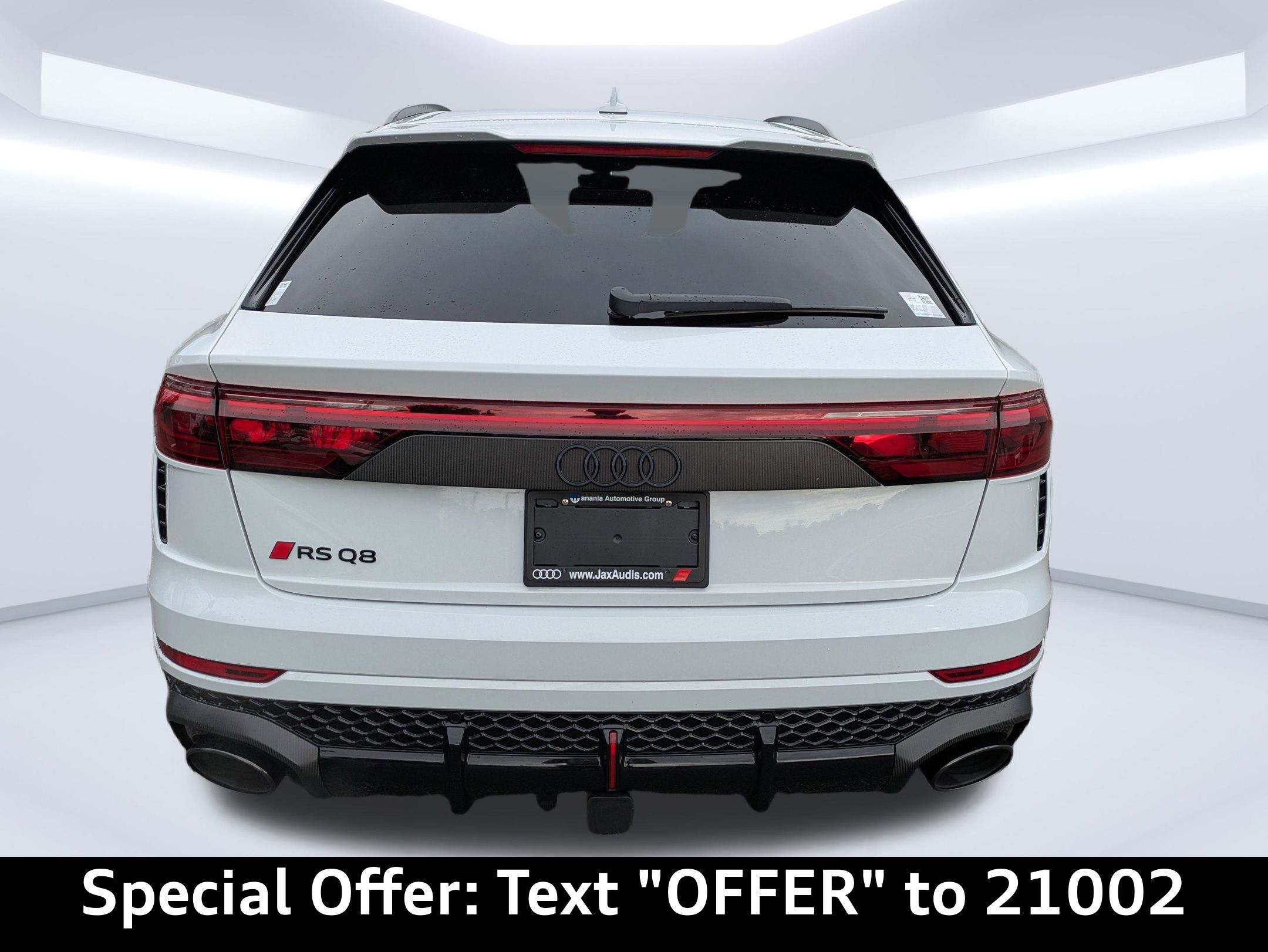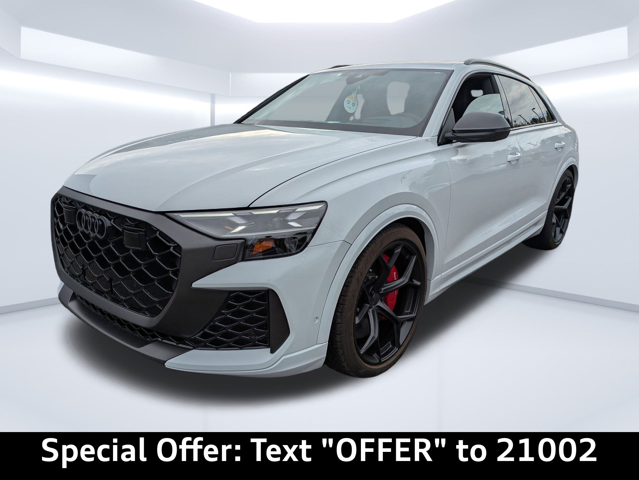 Welcome to an unparalleled driving experience with the 2026 Audi RS Q8 Performance quattro tiptronic, where luxury meets performance in the heart of Jacksonville. This sport utility vehicle, available at Audi Jacksonville, epitomizes sophistication and state-of-the-art technology tailored for the vibrant lifestyle of Jacksonville's professionals and families. Beneath its sleek glacier white metallic exterior lies a formidable 4L V-8 twin-turbo engine delivering a breathtaking 631 horsepower. With quattro all-wheel drive and a cutting-edge mild hybrid electric vehicle (MHEV) system, this beast is designed for both efficiency and power. Whether you're cruising along the scenic routes of the St. Johns River or navigating the lively streets of downtown Jacksonville, the adaptive suspension and automatic curve slowdown cruise control ensure a smooth, controlled ride. Stay effortlessly connected with the Audi MMI Navigation Plus with Touch Response, featuring wireless Apple CarPlay and Android Auto for seamless smartphone integration. Your journeys become symphonies with the Bang & Olufsen Premium Sound System with 3D Sound and its 17 speakers, turning every commute or family road trip into a concert. Embrace the tech-savvy lifestyle of Jacksonville with the Audi virtual cockpit plus, providing a customizable digital display for all your driving data. Safety is paramount in the RS Q8, with features like Audi side assist blind spot warning, Audi pre sense basic and front forward collision mitigation, and adaptive cruise assist with lane guidance offering peace of mind on every drive. The interior boasts luxurious Valcona leather seating surfaces, with heated and ventilated front sport seats and dual-zone climate control ensuring comfort for all. The panoramic power moonroof and selectable color ambient lighting create an inviting ambiance, perfect for both driver and passengers. Imagine gliding over the St. Johns River bridge with the HD Matrix-design LED headlights cutting through the night, or effortlessly maneuvering through Arlington's suburban streets with the top view camera system and rear-wheel steering. Whether heading to a business meeting or a weekend getaway, the RS Q8's power liftgate and spacious cargo area make loading your gear a breeze. With features like remote keyless entry and smart device remote start, your vehicle is always ready when you are. Experience the 2026 Audi RS Q8 Performance quattro tiptronic firsthand by visiting Audi Jacksonville or give us a call at 904-367-3700. Ready to make this remarkable vehicle yours? Start your credit application here or get a trade value on your current vehicle using our Value Your Trade tool. Don’t miss the opportunity to elevate your driving experience with the RS Q8—a vehicle as dynamic and sophisticated as you are.Discover the 2026 Audi RS Q8 Performance quattro tiptronic