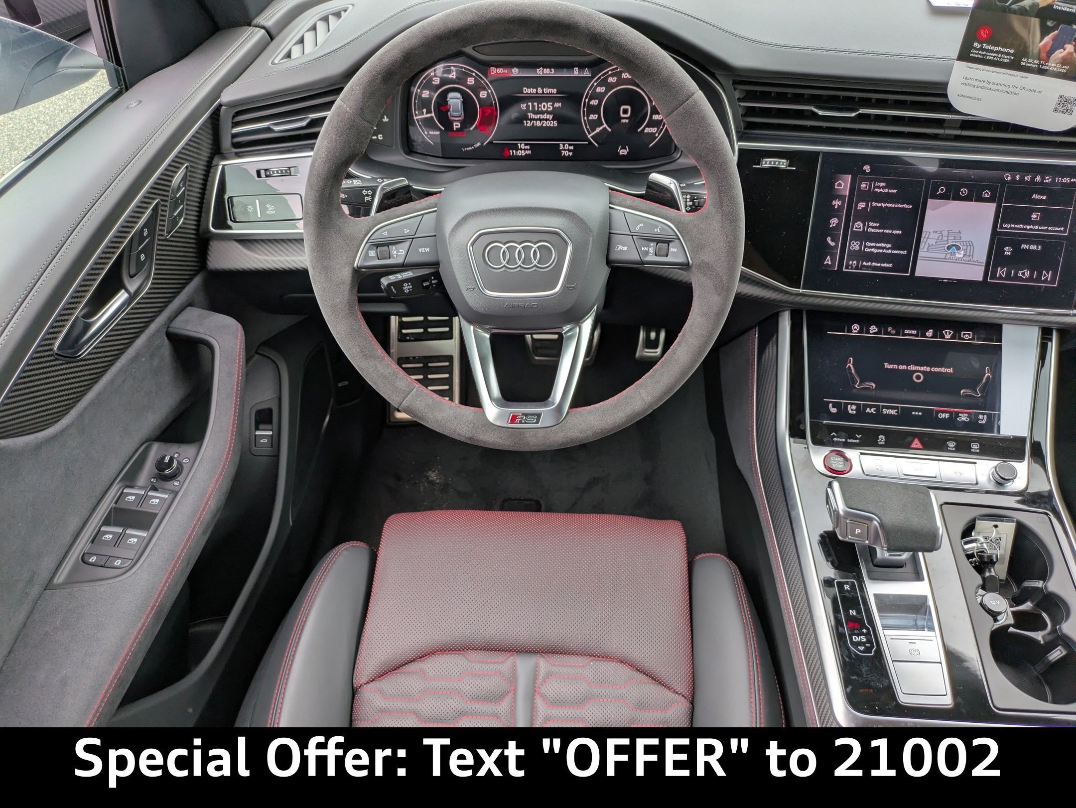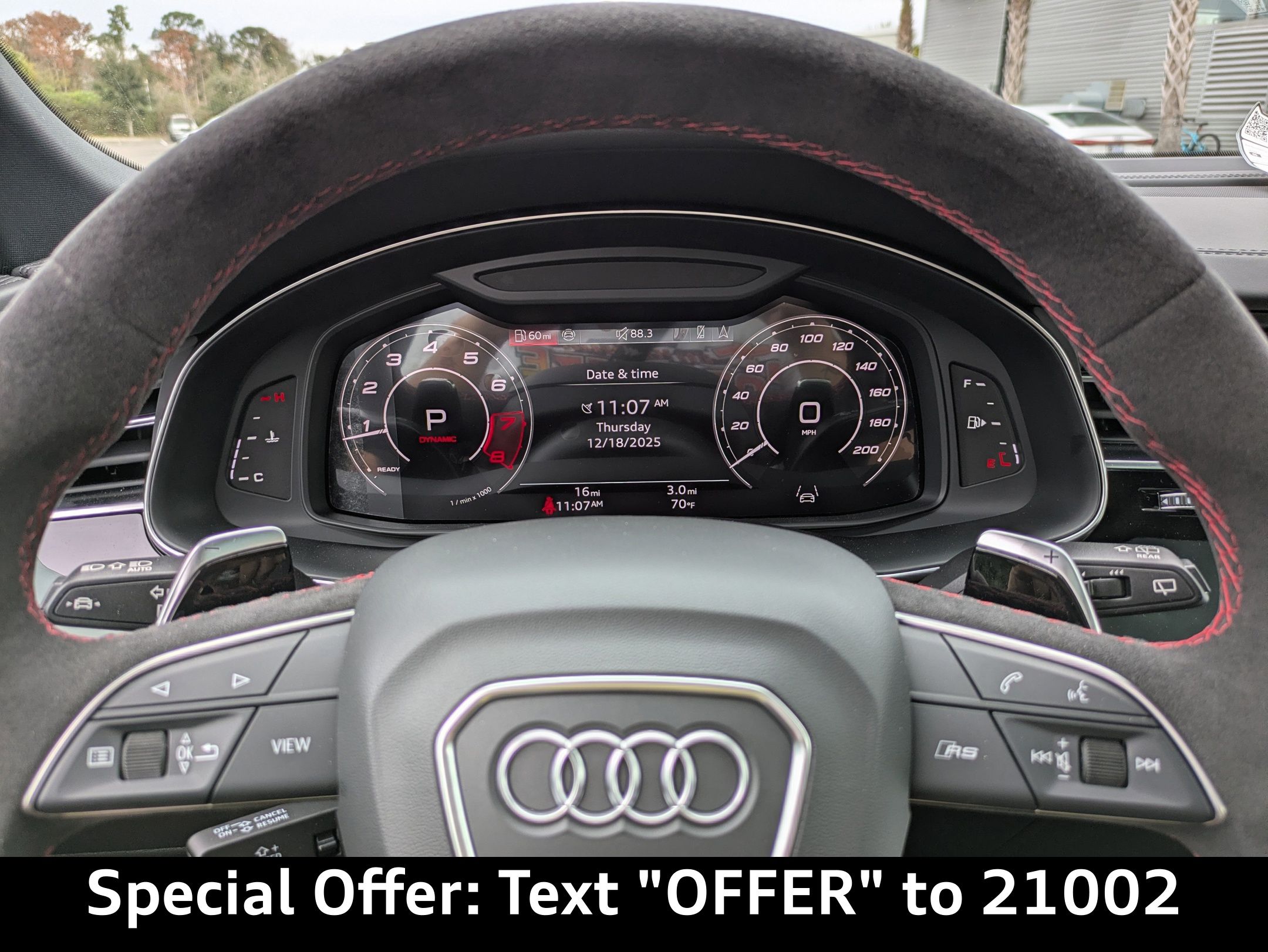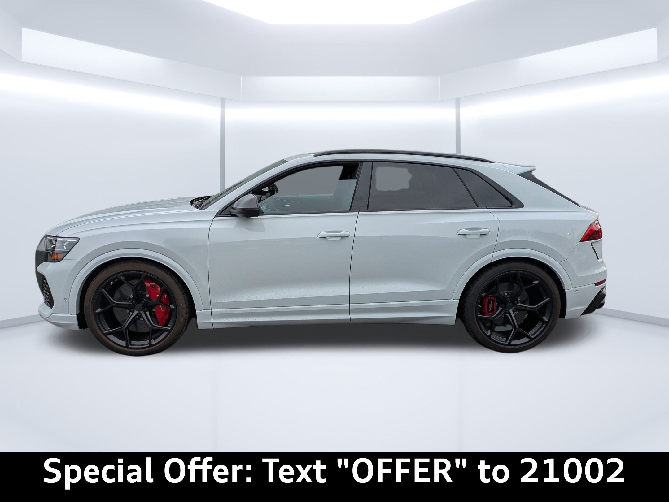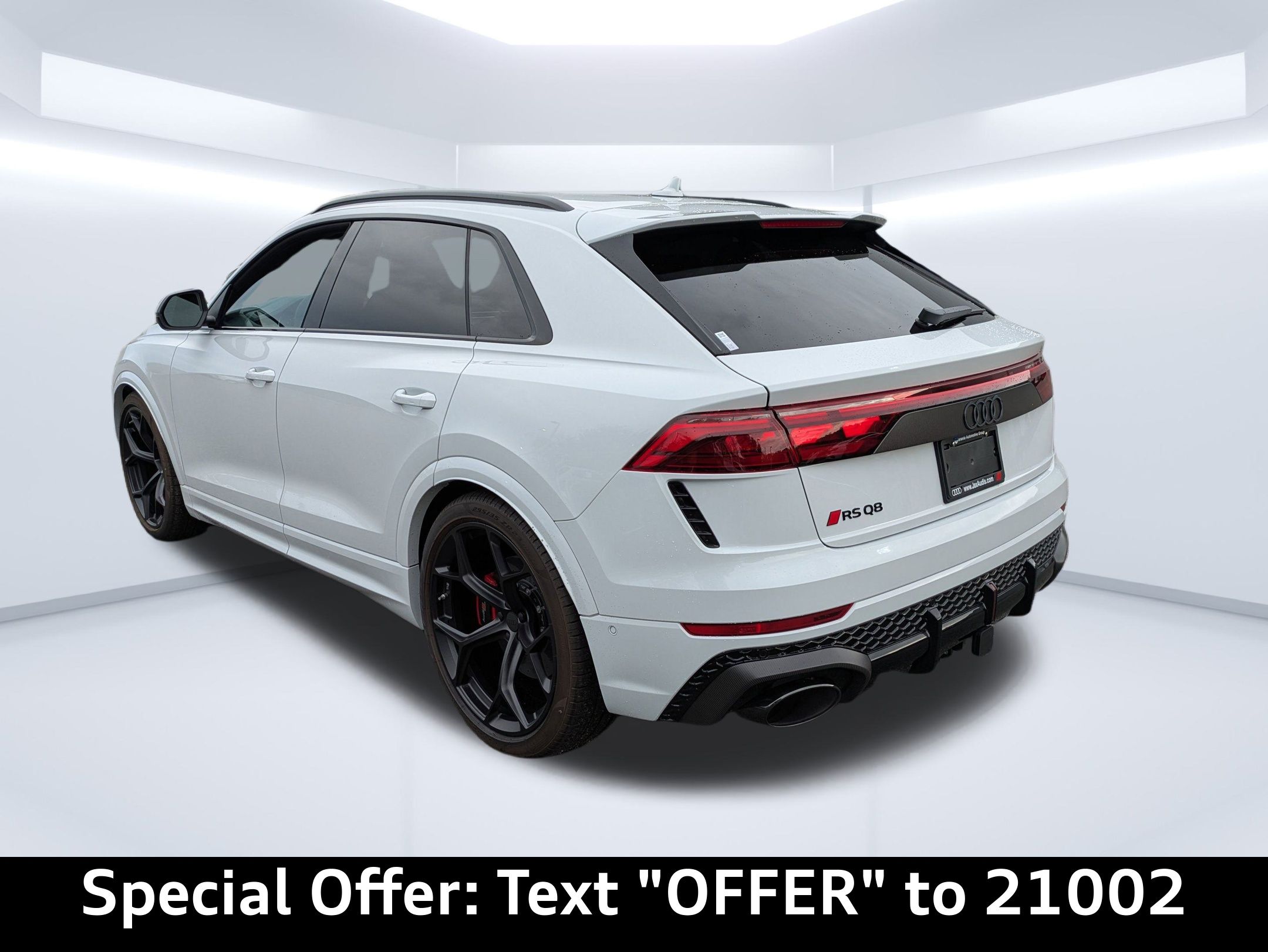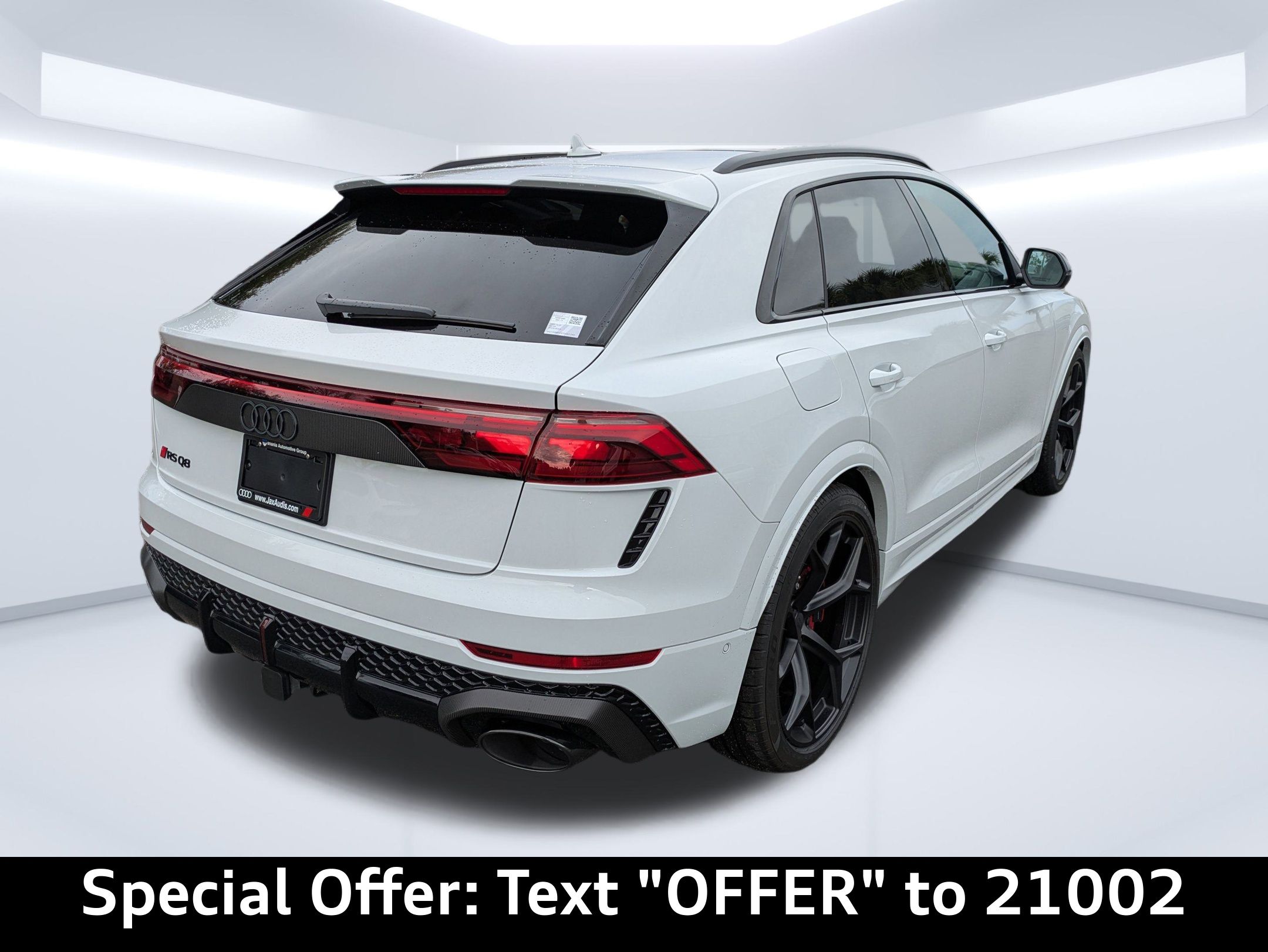 Welcome to an unparalleled driving experience with the 2026 Audi RS Q8 Performance quattro tiptronic, where luxury meets performance in the heart of Jacksonville. This sport utility vehicle, available at Audi Jacksonville, epitomizes sophistication and state-of-the-art technology tailored for the vibrant lifestyle of Jacksonville's professionals and families. Beneath its sleek glacier white metallic exterior lies a formidable 4L V-8 twin-turbo engine delivering a breathtaking 631 horsepower. With quattro all-wheel drive and a cutting-edge mild hybrid electric vehicle (MHEV) system, this beast is designed for both efficiency and power. Whether you're cruising along the scenic routes of the St. Johns River or navigating the lively streets of downtown Jacksonville, the adaptive suspension and automatic curve slowdown cruise control ensure a smooth, controlled ride. Stay effortlessly connected with the Audi MMI Navigation Plus with Touch Response, featuring wireless Apple CarPlay and Android Auto for seamless smartphone integration. Your journeys become symphonies with the Bang & Olufsen Premium Sound System with 3D Sound and its 17 speakers, turning every commute or family road trip into a concert. Embrace the tech-savvy lifestyle of Jacksonville with the Audi virtual cockpit plus, providing a customizable digital display for all your driving data. Safety is paramount in the RS Q8, with features like Audi side assist blind spot warning, Audi pre sense basic and front forward collision mitigation, and adaptive cruise assist with lane guidance offering peace of mind on every drive. The interior boasts luxurious Valcona leather seating surfaces, with heated and ventilated front sport seats and dual-zone climate control ensuring comfort for all. The panoramic power moonroof and selectable color ambient lighting create an inviting ambiance, perfect for both driver and passengers. Imagine gliding over the St. Johns River bridge with the HD Matrix-design LED headlights cutting through the night, or effortlessly maneuvering through Arlington's suburban streets with the top view camera system and rear-wheel steering. Whether heading to a business meeting or a weekend getaway, the RS Q8's power liftgate and spacious cargo area make loading your gear a breeze. With features like remote keyless entry and smart device remote start, your vehicle is always ready when you are. Experience the 2026 Audi RS Q8 Performance quattro tiptronic firsthand by visiting Audi Jacksonville or give us a call at 904-367-3700. Ready to make this remarkable vehicle yours? Start your credit application here or get a trade value on your current vehicle using our Value Your Trade tool. Don’t miss the opportunity to elevate your driving experience with the RS Q8—a vehicle as dynamic and sophisticated as you are.Discover the 2026 Audi RS Q8 Performance quattro tiptronic