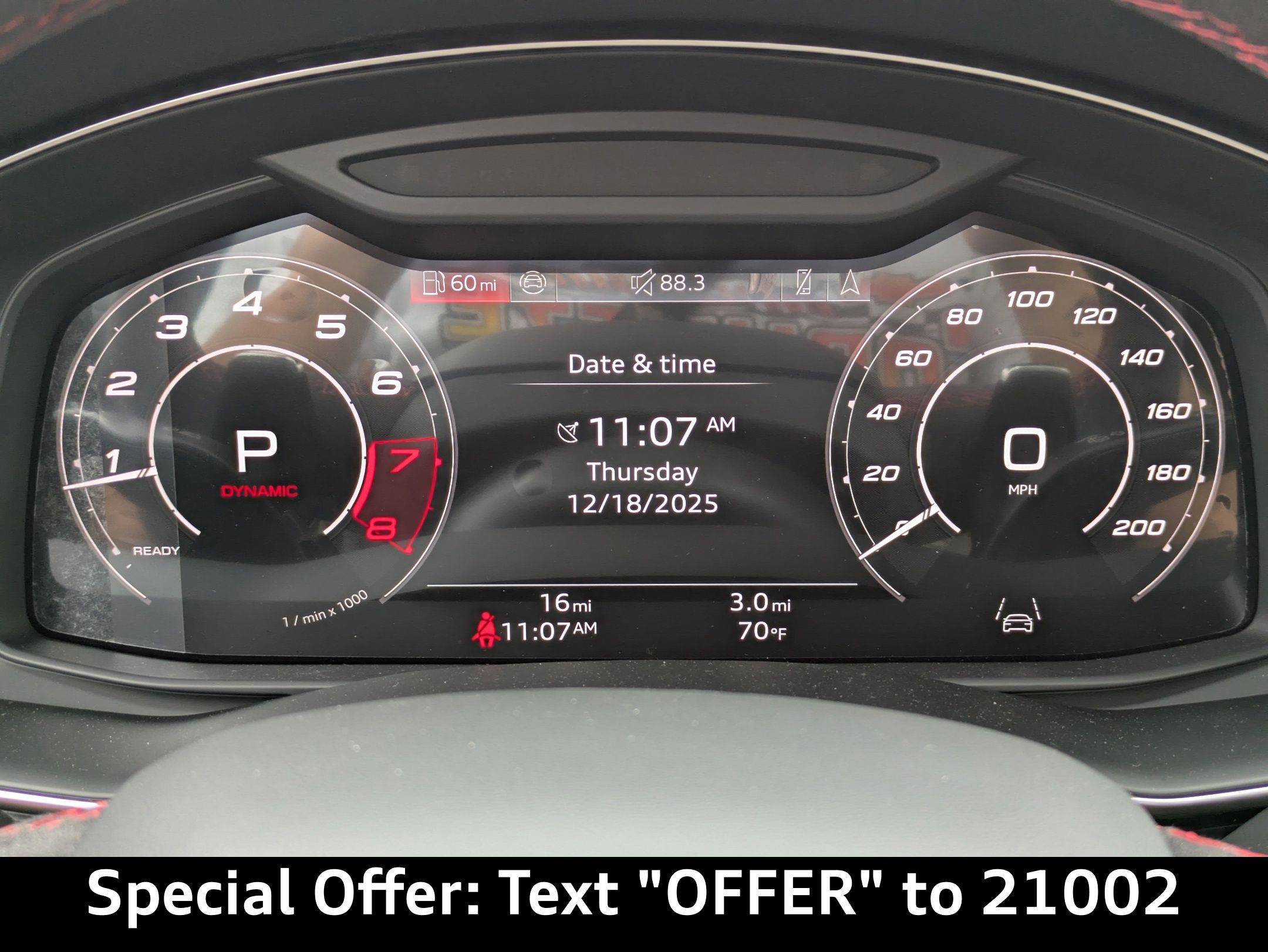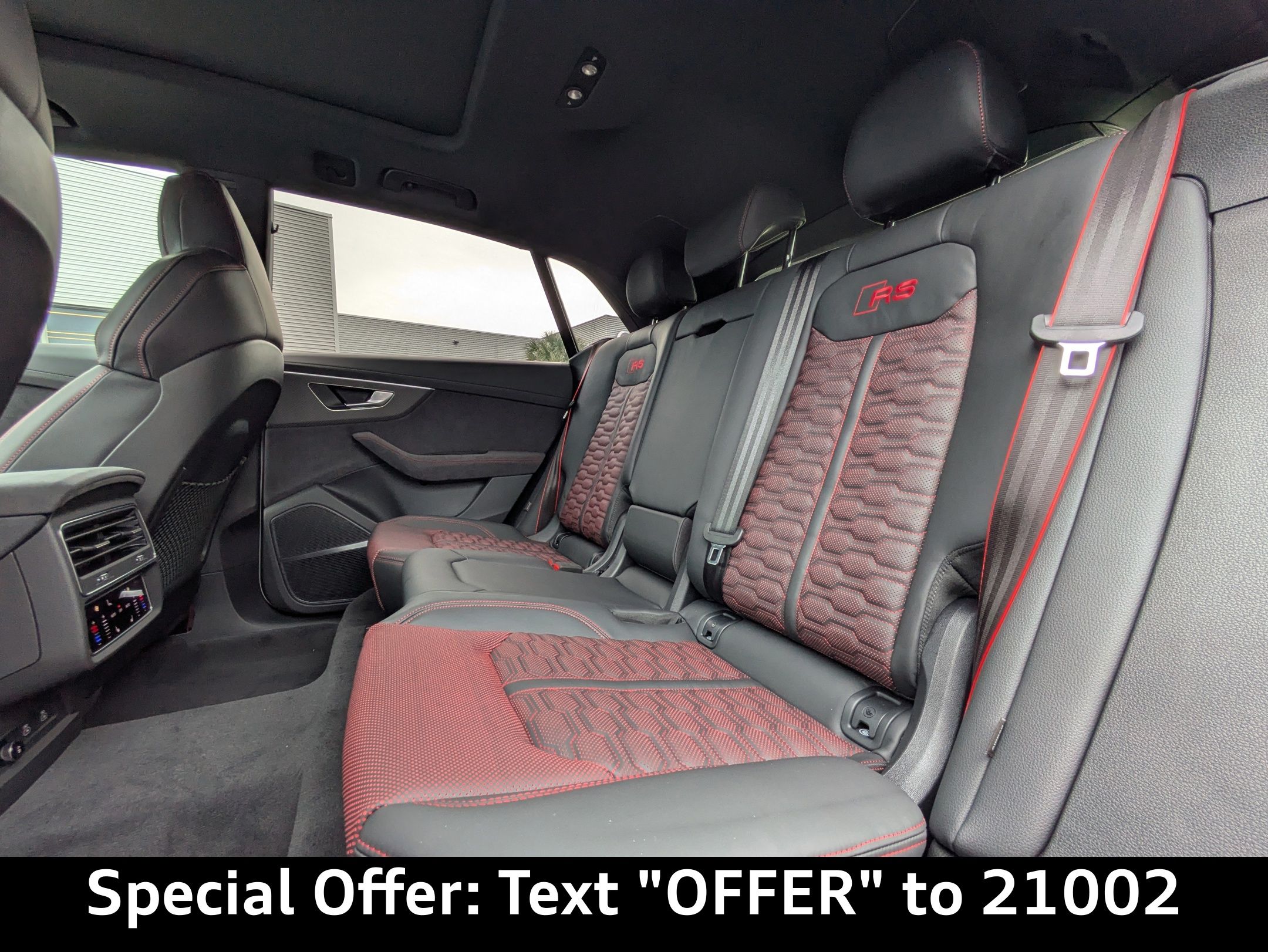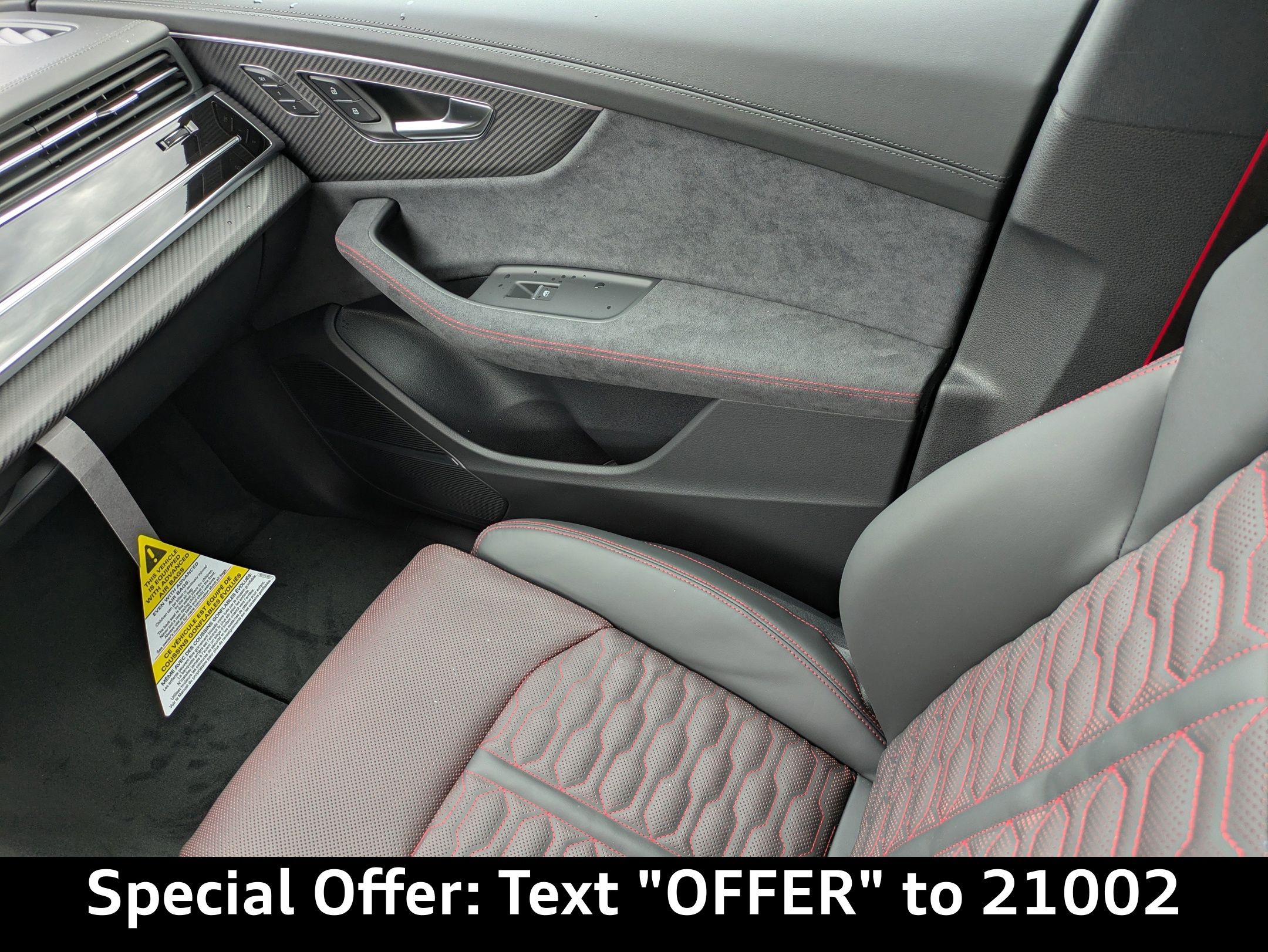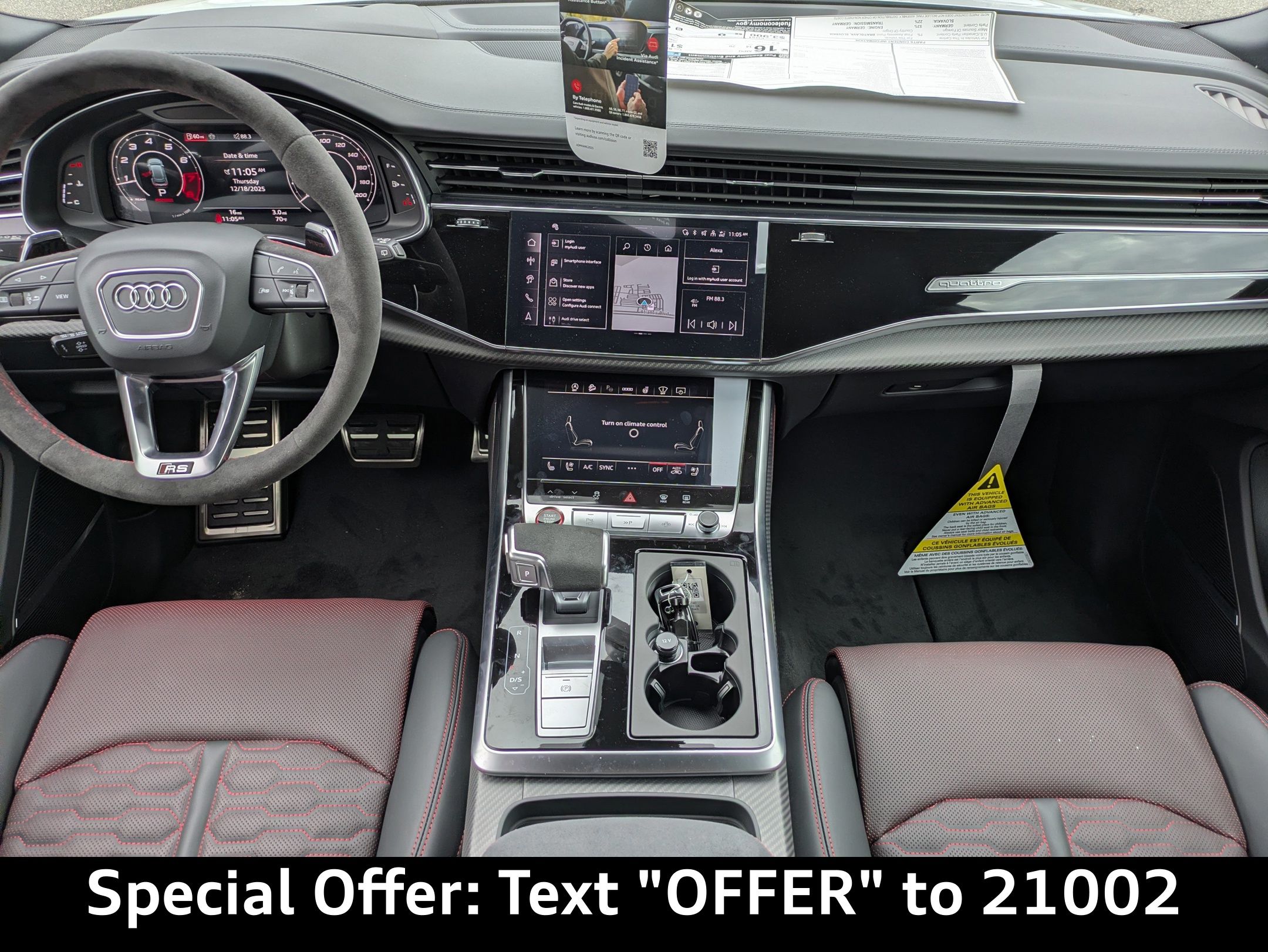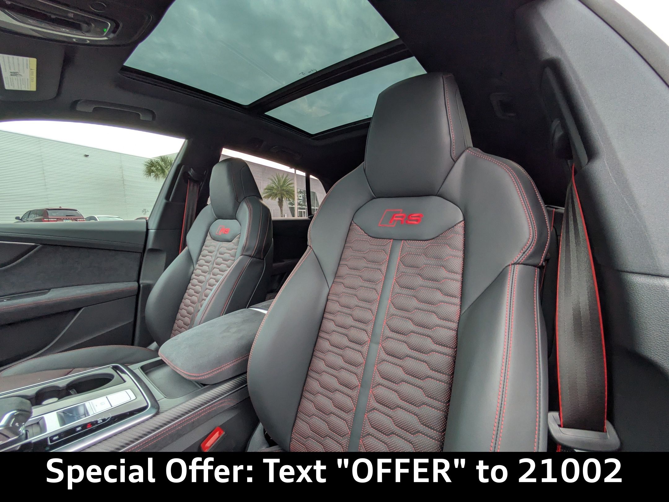 Welcome to an unparalleled driving experience with the 2026 Audi RS Q8 Performance quattro tiptronic, where luxury meets performance in the heart of Jacksonville. This sport utility vehicle, available at Audi Jacksonville, epitomizes sophistication and state-of-the-art technology tailored for the vibrant lifestyle of Jacksonville's professionals and families. Beneath its sleek glacier white metallic exterior lies a formidable 4L V-8 twin-turbo engine delivering a breathtaking 631 horsepower. With quattro all-wheel drive and a cutting-edge mild hybrid electric vehicle (MHEV) system, this beast is designed for both efficiency and power. Whether you're cruising along the scenic routes of the St. Johns River or navigating the lively streets of downtown Jacksonville, the adaptive suspension and automatic curve slowdown cruise control ensure a smooth, controlled ride. Stay effortlessly connected with the Audi MMI Navigation Plus with Touch Response, featuring wireless Apple CarPlay and Android Auto for seamless smartphone integration. Your journeys become symphonies with the Bang & Olufsen Premium Sound System with 3D Sound and its 17 speakers, turning every commute or family road trip into a concert. Embrace the tech-savvy lifestyle of Jacksonville with the Audi virtual cockpit plus, providing a customizable digital display for all your driving data. Safety is paramount in the RS Q8, with features like Audi side assist blind spot warning, Audi pre sense basic and front forward collision mitigation, and adaptive cruise assist with lane guidance offering peace of mind on every drive. The interior boasts luxurious Valcona leather seating surfaces, with heated and ventilated front sport seats and dual-zone climate control ensuring comfort for all. The panoramic power moonroof and selectable color ambient lighting create an inviting ambiance, perfect for both driver and passengers. Imagine gliding over the St. Johns River bridge with the HD Matrix-design LED headlights cutting through the night, or effortlessly maneuvering through Arlington's suburban streets with the top view camera system and rear-wheel steering. Whether heading to a business meeting or a weekend getaway, the RS Q8's power liftgate and spacious cargo area make loading your gear a breeze. With features like remote keyless entry and smart device remote start, your vehicle is always ready when you are. Experience the 2026 Audi RS Q8 Performance quattro tiptronic firsthand by visiting Audi Jacksonville or give us a call at 904-367-3700. Ready to make this remarkable vehicle yours? Start your credit application here or get a trade value on your current vehicle using our Value Your Trade tool. Don’t miss the opportunity to elevate your driving experience with the RS Q8—a vehicle as dynamic and sophisticated as you are.Discover the 2026 Audi RS Q8 Performance quattro tiptronic