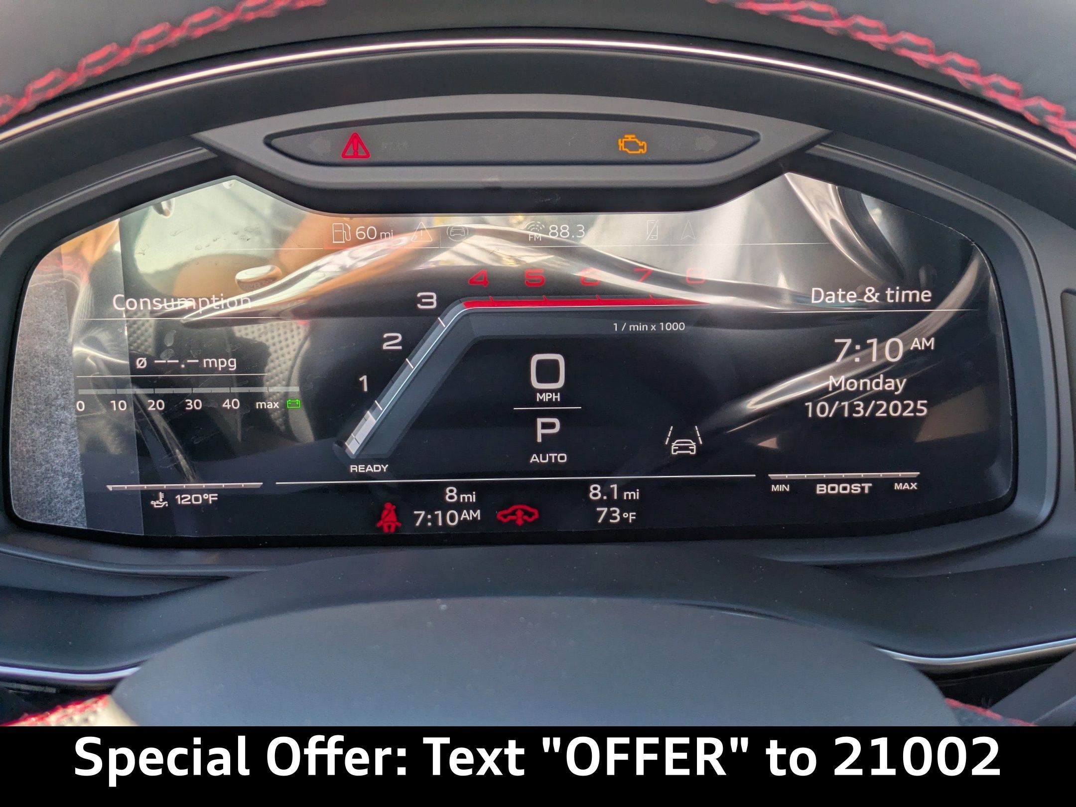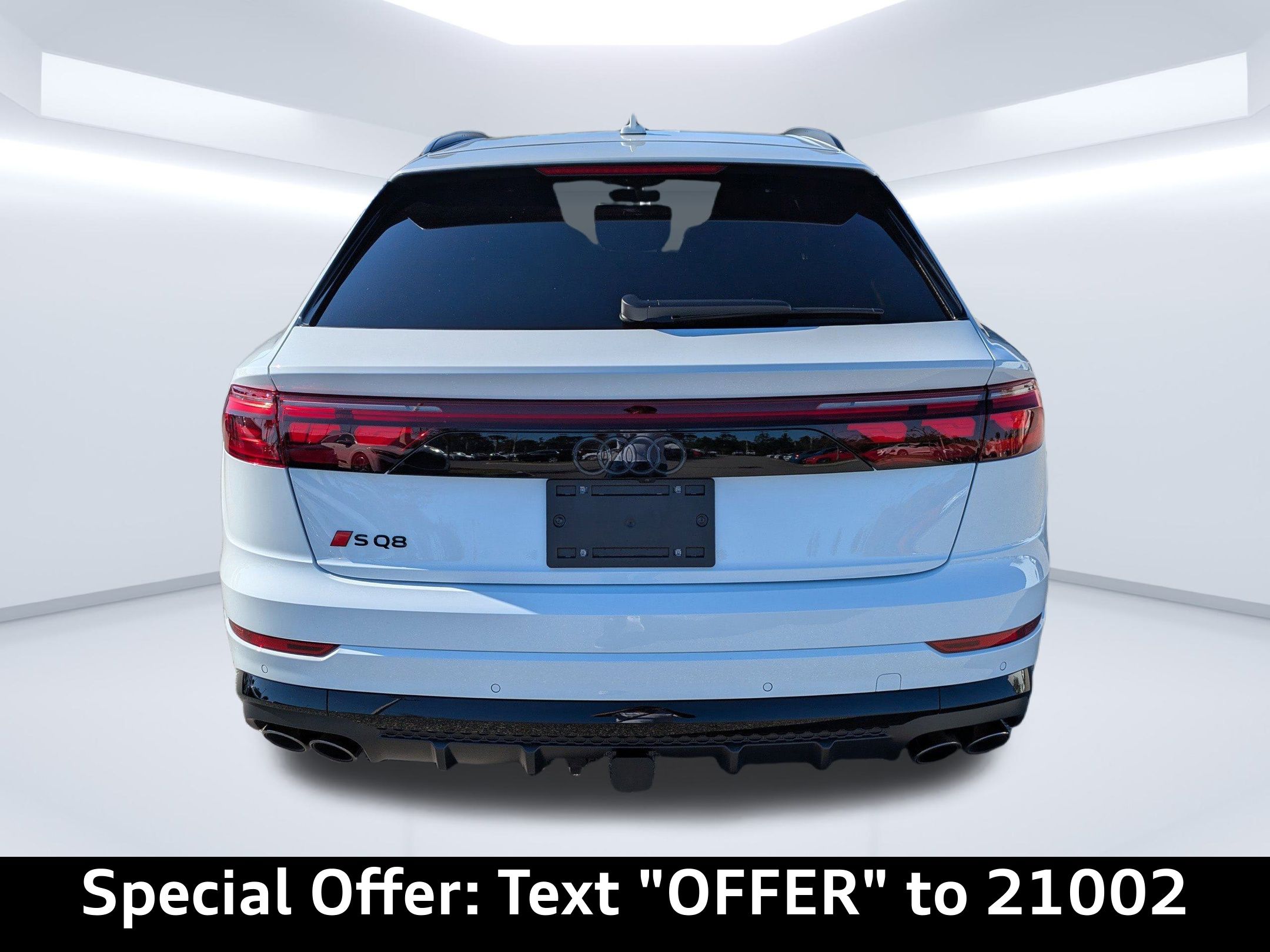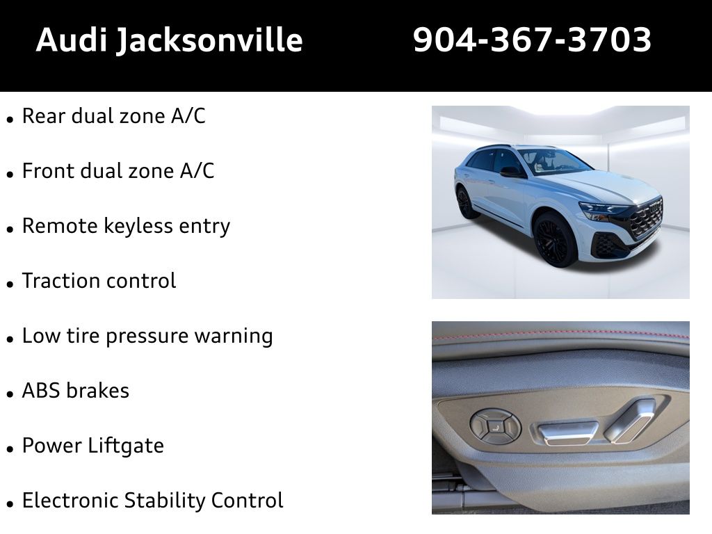 Step into the world of unbridled power and luxury with the 2026 Audi SQ8 Prestige, a vehicle engineered for those who demand both performance and sophistication. Powered by a dynamic 4L V-8 twin-turbocharged engine producing an exhilarating 500HP, this SUV is built to conquer the roads of Jacksonville and beyond. The 8-Speed Automatic Transmission with Tiptronic ensures seamless gear changes, while the quattro all-wheel drive system provides unparalleled traction and stability, making it perfect for any Floridian weather challenge or a spontaneous drive to the coastal sands. The Audi SQ8 is not just about power; it's about intelligent design, too. With the Audi virtual cockpit plus, experience a customizable 12.3-inch display that keeps all your essential driving information at your fingertips. The integrated Audi MMI Navigation plus guides you effortlessly through Jacksonville's bustling streets, while the Bang & Olufsen Premium Sound System with 3D Sound transforms every journey into a concert hall experience, perfect for those commutes to downtown or weekend getaways. Safety is paramount in the SQ8, featuring cutting-edge driver assistance systems like Audi pre sense basic and front, which offer forward collision mitigation, and Audi side assist blind spot warning. The adaptive cruise assist with lane guidance ensures smooth and stress-free highway drives, especially during your daily commute along I-95. Inside, the Valcona leather seats with ventilation and massaging functions promise ultimate comfort, making every trip—from school runs to evening dinners—a luxurious affair. Whether you're navigating the urban landscape or heading out for an adventure, the SQ8 caters to your lifestyle with its versatile features. The adaptive ride suspension and rear-wheel steering provide agility and comfort, making it as adept at handling tight city streets as it is at cruising the open highway. The power liftgate rear cargo door and ample cargo space ensure you have room for all your gear, whether it's for a family outing to the Jax Zoo or a weekend retreat to Amelia Island. With its Glacier White Metallic exterior and sleek Black Optic Package, the Audi SQ8 is a statement of modern elegance. The panoramic sunroof floods the cabin with natural light, highlighting the exquisite piano black and carbon fiber interior accents. The HD Matrix-design LED headlights with laser light technology illuminate the road ahead, ensuring you turn heads wherever you go. Ready to make the 2026 Audi SQ8 your own? Visit Audi Jacksonville today or give us a call at 904-367-3700 to schedule your test drive. Explore financing options with our Credit Application or get a trade value for your current vehicle with our Value Your Trade tool. Don't miss the chance to own a vehicle that's as exhilarating as your lifestyle demands!Discover the 2026 Audi SQ8 Prestige TFSI quattro Tiptronic: Elevate Your Driving Experience