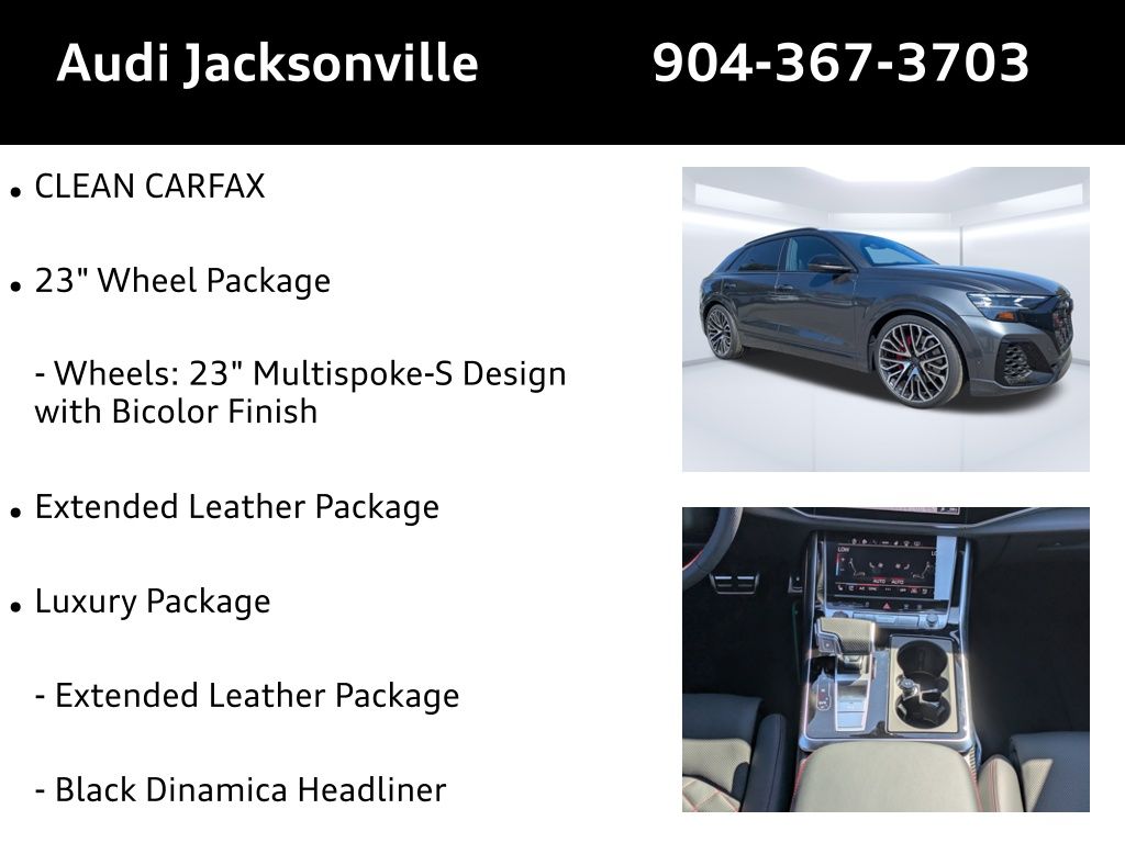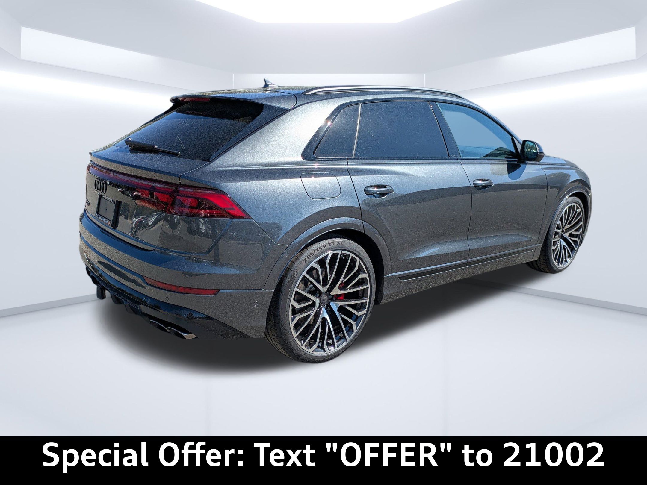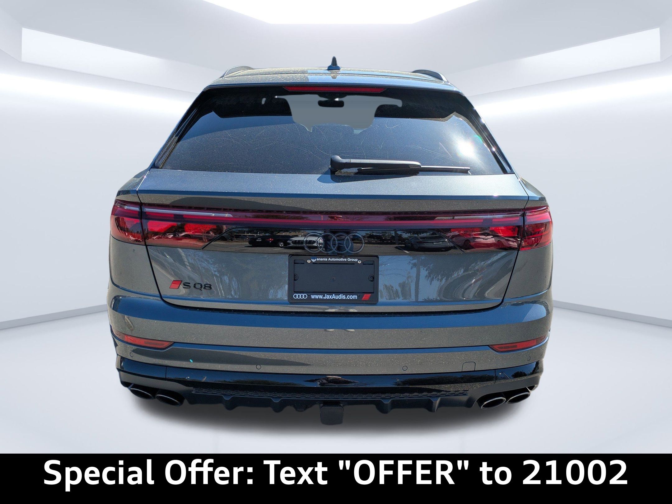 Elevate your driving experience with the 2026 Audi SQ8 Prestige TFSI quattro Tiptronic—a pinnacle of luxury and performance designed for those who demand the best. Nestled in the vibrant city of Jacksonville, FL, Audi Jacksonville invites you to discover how this SUV can redefine your daily commute and weekend escapades. Whether you're navigating the bustling streets of Jacksonville or embarking on a coastal getaway, the 500HP 4L V-8 engine with its twin-turbocharged, quattro all-wheel-drive system ensures that every drive is an exhilarating journey. The adaptive cruise control and adaptive air suspension provide a smooth ride, even on the most challenging roads. And with the rear-wheel steering system, maneuvering through tight city corners or suburban streets becomes effortless. Stay connected and in control with the Audi MMI Navigation Plus featuring a 10.1-inch touchscreen. The Bang & Olufsen Premium Sound System with 17 speakers envelops you in rich, immersive audio, making every drive feel like a private concert. The head-up display and Audi virtual cockpit plus keep essential information at your fingertips, allowing you to focus on the road ahead. Plus, with the Audi connect NAV and PLUS mobile hotspot, staying connected is easier than ever. Prioritize the safety of your loved ones with Audi pre sense city and Audi side assist for blind spot monitoring. The top view camera system ensures that parking is a breeze, while the adaptive headlights with Audi laser light illuminate the darkest roads, enhancing visibility in all conditions. Inside, the Valcona leather seats with massaging functions for both driver and front passenger ensure that every journey is a luxurious experience. The panoramic sunroof floods the cabin with natural light, creating a serene atmosphere for all passengers. The power liftgate and ample cargo space make it easy to pack for a family beach day or a weekend hiking trip in the nearby nature reserves. The split-folding rear seats provide flexibility for any adventure, while the heated and ventilated front seats and four-zone climate control keep everyone comfortable, regardless of the weather. Visit Audi Jacksonville at 11401 Atlantic Blvd, Jacksonville, FL 32225 or call us at 904-367-3700 to experience the 2026 Audi SQ8 for yourself. Ready to make it yours? Start your Credit Application today or get a trade value on your current vehicle. Embrace the luxury and performance that only Audi can offer—your journey begins here.Experience the 2026 Audi SQ8 Prestige TFSI quattro Tiptronic