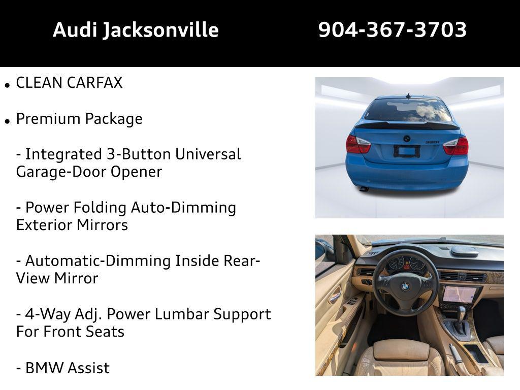 Imagine carving through the scenic A1A, the sun glinting off the Jet Black finish of your 2006 BMW 330i as you head towards Ponte Vedra Beach for a weekend of golf and relaxation. This isn't just a car; it's a statement of refined taste and a gateway to experiencing the best of coastal Florida living. Under the hood of this 2006 BMW 330i lies a potent 3L I-6 DOHC engine featuring Double VANOS variable valve control. This premium unleaded engine delivers responsive performance, ensuring a thrilling drive whether you're navigating the daily commute or enjoying a spirited weekend drive. The available 6-speed manual transmission provides a direct connection to the road, putting you in complete control. With its rear-wheel-drive configuration, this 330i offers the classic BMW driving experience, known for its balanced handling and engaging dynamics. The sport suspension further enhances the driving experience, providing responsive handling and a connected feel on winding roads. Stay connected on the go with the integrated handsfree Bluetooth wireless device connectivity, allowing you to make calls safely and conveniently. The analog instrumentation display provides clear and concise information, while the exterior temperature display keeps you informed of the conditions outside. Enjoy your favorite music through the premium audio system, enhanced by a graphic audio equalizer for customized sound. The diversity antenna ensures optimal radio reception, while the audio system theft deterrent provides added security. Step inside the 2006 BMW 330i and experience a refined interior designed for comfort and convenience. Sink into the luxurious Beige leather front seat upholstery, and find your perfect driving position with the 4-way adjustable power lumbar support for both the driver and front passenger. The memory seat function allows you to save your preferred settings, including door mirror positions, for personalized comfort every time you drive. Enjoy the convenience of power door locks with 2-stage unlocking, and power windows with one-touch up/down functionality. Automatic climate control ensures a comfortable cabin temperature, while rear climate control with separate controls keeps passengers in the back happy. The power moonroof lets you enjoy the Florida sunshine and fresh air. Additional features include heated door mirrors, heated front windshield jets, and a refrigerated front console for keeping beverages cool on the go. The leather-wrapped steering wheel and shift knob add a touch of elegance to the interior. Your safety is a top priority in the 2006 BMW 330i. The vehicle is equipped with 4-wheel disc brakes and ABS brakes for confident stopping power. Brake assist further enhances braking performance in emergency situations. Dual front impact airbags and dual front side impact airbags provide added protection in the event of a collision. Overhead airbags offer additional safety for both front and rear occupants. The vehicle also features child door locks for added security. The 2006 BMW 330i boasts a sleek and sporty exterior design, finished in Jet Black. The body-colored bumpers and chrome grille add a touch of sophistication. Alloy wheels and the first-row sunroof enhance the vehicle's overall appearance. Adaptive headlights provide enhanced visibility in low-light conditions, while fog lights improve visibility in adverse weather. Power folding door mirrors add convenience, and tinted windows provide privacy and help to keep the interior cool. This 2006 BMW 330i is packed with features designed to enhance your driving experience: Audi Jacksonville is conveniently located to serve customers from all over the Jacksonville area, including Palm Coast and San Jose. Stop by Audi Jacksonville at 11401 Atlantic Blvd, Jacksonville, FL 32225 to experience this 2006 BMW 330i for yourself. Get Directions to Audi Jacksonville. Call us at (904) 367-3700 to schedule a test drive or discuss financing options. You can also apply for credit or value your trade online. We look forward to seeing you soon! Build Codes: ZPP | 430 | 431 | 488 | LC__ | 319 | 639 | ZSP | 255 | 2AB | 226 | 4812006 BMW 330i 330i: Experience the Ultimate Driving Machine