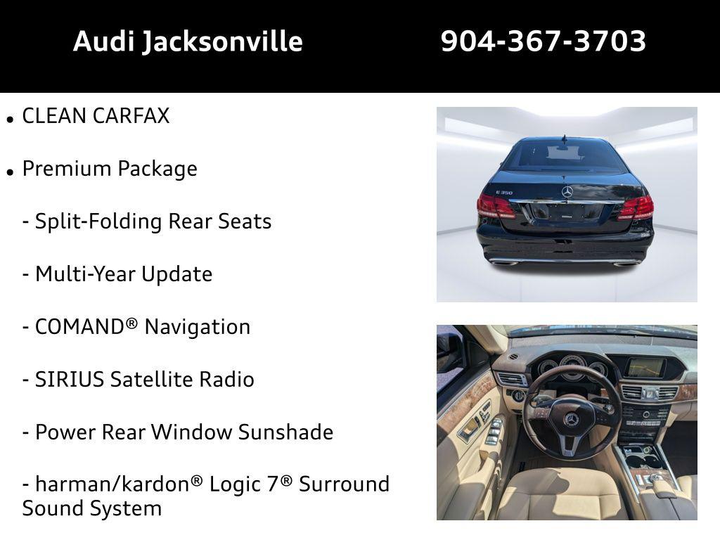 Imagine gliding along the A1A in Neptune Beach, the ocean breeze whispering through your open sunroof as you head to meet friends for brunch. Or perhaps you're making a statement pulling up to the golf club in Ponte Vedra Beach. This 2016 Mercedes-Benz E 350 isn't just a car; it's an extension of your sophisticated lifestyle. Beneath the sleek hood lies a potent 3.5L V-6 engine, delivering a smooth yet assertive 302 horsepower. The 7-speed automatic transmission ensures seamless gear changes, whether you're navigating the daily commute or enjoying a spirited weekend drive. Its Rear Wheel Drive configuration provides a balanced and engaging driving experience. The Comfort ride suspension absorbs every bump, making even the longest journeys feel effortless. The aluminum engine block not only contributes to the car's overall efficiency but also enhances its responsiveness. With selectable driving modes, you can tailor the car's performance to match your mood and the road ahead. Stay connected and entertained with the advanced technology integrated into this E 350. The COMAND APS integrated navigation system guides you effortlessly to your destination, while the premium audio system fills the cabin with rich, immersive sound. Stream your favorite playlists via Bluetooth handsfree wireless device connectivity, and enjoy crystal-clear audio through the premium grade amplifier. The DVD-audio playback capability provides an enhanced listening experience. The analog instrumentation display offers a classic and refined aesthetic, providing essential information at a glance. Step inside and experience a world of refined comfort. The Almond MB-Tex leatherette front seat upholstery offers a luxurious feel, while the heated front seats provide warmth on chilly mornings. The dual-zone front climate control allows you and your passenger to set your preferred temperatures, ensuring everyone stays comfortable. Find your perfect driving position with the power adjustable front seats and memory settings for the seats, mirrors, and steering wheel. Enjoy the sunshine and fresh air with the power moonroof. The Burl Walnut Wood Trim adds a touch of classic elegance to the interior. The KEYLESS GO with hands-free access and push button start makes every journey simple. Your safety is paramount, and this E 350 is equipped with a comprehensive suite of advanced safety features. Automatic Emergency Braking provides an extra layer of protection in critical situations. The Blind Spot Monitor alerts you to vehicles in your blind spots, making lane changes safer. Lane Keeping Assist helps you stay centered in your lane, reducing the risk of unintentional drifting. The Rearview Camera makes parking and maneuvering in tight spaces a breeze. With nine airbags strategically placed throughout the cabin, you can drive with confidence knowing you and your passengers are well-protected. The sleek Black exterior of this E 350 exudes sophistication and timeless appeal. The 18-Inch 5-Double Spoke Wheels add a touch of sporty elegance, while the LED low beam headlights provide excellent visibility and a distinctive look. The chrome grille and body-colored bumpers enhance the car's refined aesthetic. The power moonroof lets you enjoy the open air and sunshine. Its design is sure to turn heads whether you are going to the beach or a night out downtown. This 2016 Mercedes-Benz E 350 is packed with features designed to enhance your driving experience: Audi Jacksonville is conveniently located and easily accessible from anywhere in the Jacksonville area, including Palm Coast and San Jose. We're just a short drive away! Visit us at 11401 Atlantic Blvd, Jacksonville, FL 32225, or Call us at (904) 367-3700. We'd love to show you this exceptional Mercedes-Benz E 350 in person. Feel free to call, visit our website, or stop by to explore Credit Application and get a Value Your Trade for your current vehicle. We look forward to welcoming you! Build Codes: P01 | 287 | 540 | 531 | P49 | 873 | 502 | 810 | 536 | 321 | 772 | 4U4 | 677 | 954 | 993 | 22P | 234 | 476 | 389 | 881 | 871 | P17 | 889 | 55U | R38 | 211 | R02 | 258 | 137 | 218 | 815 | H14 | 068 | 040 | 115 | 077 | 275 | 232 | 551 | 475 | 279 | 632 | 634 | 636 | 6P5 | 915 | 919 | K15 | 763 | U10 | 249 | 887 | U12 | 806 | 12B | B03 | 291 | B09 | PPM | 294 | 690 | 494 | 414 | V04 | B12 | 580 | 1U2 | U71 | 461 | 264 | 3U2 | 301 | 543 | 348 | 986 | 668 | 108 | 427 | 428 | 989 | 3092016 Mercedes-Benz E 350 E 350: Elegance Redefined