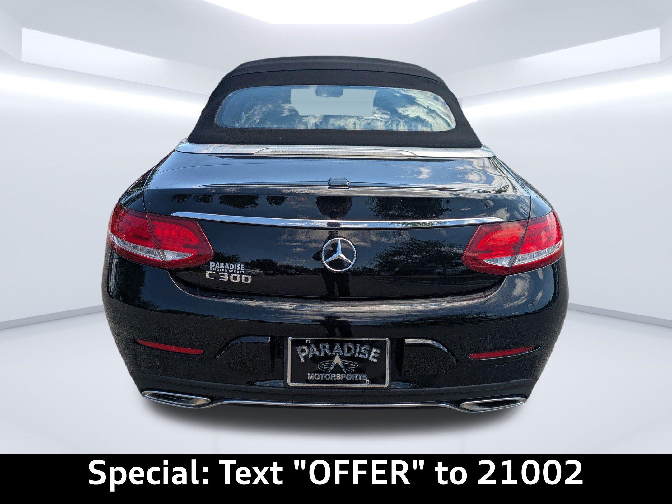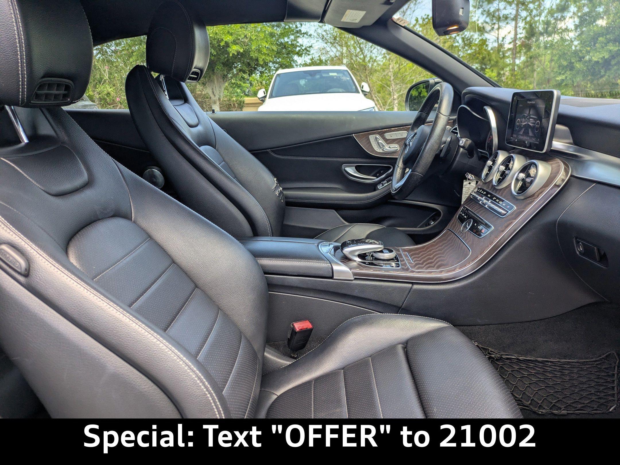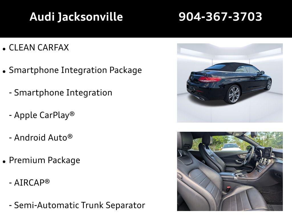 Imagine yourself cruising down A1A, the sun warming your skin as you head towards Ponte Vedra Beach, the ocean breeze tousling your hair. This 2018 Mercedes-Benz C 300 Convertible is ready to transform your daily drive into an exhilarating experience, blending luxury with the pure joy of open-air motoring. The 2018 Mercedes-Benz C 300 is engineered for a responsive and refined driving experience. Its 2L I-4 gasoline direct injection engine delivers a spirited 241 horsepower, providing ample power for both effortless daily commutes and exhilarating weekend getaways. The 9G-TRONIC 9-Speed Automatic Transmission ensures smooth and precise gear changes, optimizing both performance and fuel efficiency. With Rear Wheel Drive, you'll enjoy a dynamic and engaging connection to the road. DYNAMIC SELECT driver selectable drivetrain mode allows you to tailor the driving experience to your preferences, whether you're seeking maximum fuel economy or enhanced responsiveness. The Agility Control automatic suspension ride control provides a comfortable and controlled ride, smoothing out bumps and imperfections on your favorite scenic routes. Stay connected and entertained on every journey with the advanced technology integrated into this C 300 Convertible. Apple CarPlay and Android Auto seamlessly integrate your smartphone, providing access to your favorite apps, music, and navigation directly through the vehicle's infotainment system. The Audio 20 Standard Radio delivers crisp and clear sound, while Bluetooth wireless audio streaming allows you to effortlessly enjoy your personal playlists. The Steering wheel mounted audio controls put essential functions at your fingertips, allowing you to adjust the volume, change tracks, and answer calls without taking your hands off the wheel. Two USB ports ensure your devices stay charged and ready to go. The interior of this 2018 Mercedes-Benz C 300 Convertible is designed for both comfort and style, featuring Black MB-Tex leatherette front seat upholstery that provides a luxurious feel and exceptional durability. Heated front seats offer added warmth and comfort on cooler evenings. The Power Driver Seat & Steering Column w/Memory allows you to find your perfect driving position, with memory settings for the door mirrors, steering wheel, and front headrest. Enjoy the convenience of KEYLESS GO with hands-free access and push button start, making entry and exit effortless. The Power convertible roof allows you to quickly and easily transform the car from a closed coupe to an open-air convertible, letting you soak up the sun and enjoy the fresh air. The Natural Grain Brown Ash Wood Trim adds a touch of elegance to the interior. Dual-zone front climate control ensures that both you and your passenger can enjoy your preferred temperature settings. Your safety is paramount, and this 2018 Mercedes-Benz C 300 Convertible is equipped with a comprehensive suite of safety features to provide peace of mind on every drive. ABS Brakes provide enhanced stopping power, while Brake assist helps to maximize braking performance in emergency situations. Blind Spot Assist alerts you to vehicles in your blind spots, helping to prevent accidents. The Exterior Parking Camera Rear provides a clear view of the area behind the vehicle, making parking and maneuvering easier and safer. ATTENTION ASSIST driver attention alert monitors your driving behavior and provides a warning if it detects signs of fatigue. Forward collision warning helps to prevent or mitigate collisions. The sleek and stylish exterior of this 2018 Mercedes-Benz C 300 Convertible is sure to turn heads wherever you go. Finished in classic Black (040), it exudes sophistication and timeless appeal. The 18-Inch Twin 5-Spoke Wheels add a touch of sporty elegance to the overall design. The Convertible roof with glass rear window provides excellent visibility and insulation when the top is up. LED low and high beam headlights provide exceptional illumination, ensuring clear visibility in all driving conditions. The Chrome side window trim adds a touch of luxury to the exterior. Audi Jacksonville is conveniently located to serve customers from Palm Coast, San Jose and Neptune Beach. We invite you to visit us at Audi Jacksonville at 11401 Atlantic Blvd, Jacksonville, FL 32225 to experience this exceptional 2018 Mercedes-Benz C 300 Convertible for yourself. Get Directions to Audi Jacksonville today. Our friendly and knowledgeable team is ready to answer your questions and help you find the perfect vehicle to fit your lifestyle. Call us at (904) 367-3700 to schedule a test drive or learn more. You can also Value Your Trade or fill out a Credit Application online. Build Codes: P01 | 288 | 500 | 810 | 4U9 | 536 | P50 | 868 | 16U | 14U | 17U | 873 | 242 | 275 | U22 | 522 | 818 | 22R | 355 | 19A | 51U | H09 | 218 | 740 | 421 | 040 | 101 | 270 | 274 | 351 | 154 | 232 | 551 | 475 | 234 | 30P | R66 | 632 | 677 | U02 | 634 | 876 | 636 | 6P5 | 916 | 919 | 07U | K15 | P76 | 362 | P75 | 440 | 15U | 287 | 6U1 | 246 | 763 | U10 | 249 | 403 | 887 | U12 | 448 | 889 | 51V | 808 | 12B | B03 | B09 | 293 | PPM | 294 | 494 | K27 | 299 | 893 | 213 | 455 | P49 | R02 | 258 | 611 | 3P7 | 5P6 | B59 | B16 | 580 | 141 | 461 | 264 | 3U2 | 301 | 345 | 543 | 986 | 668 | 901 | 989 | 309 | B632018 Mercedes-Benz C 300 C 300: Embrace the Open Road