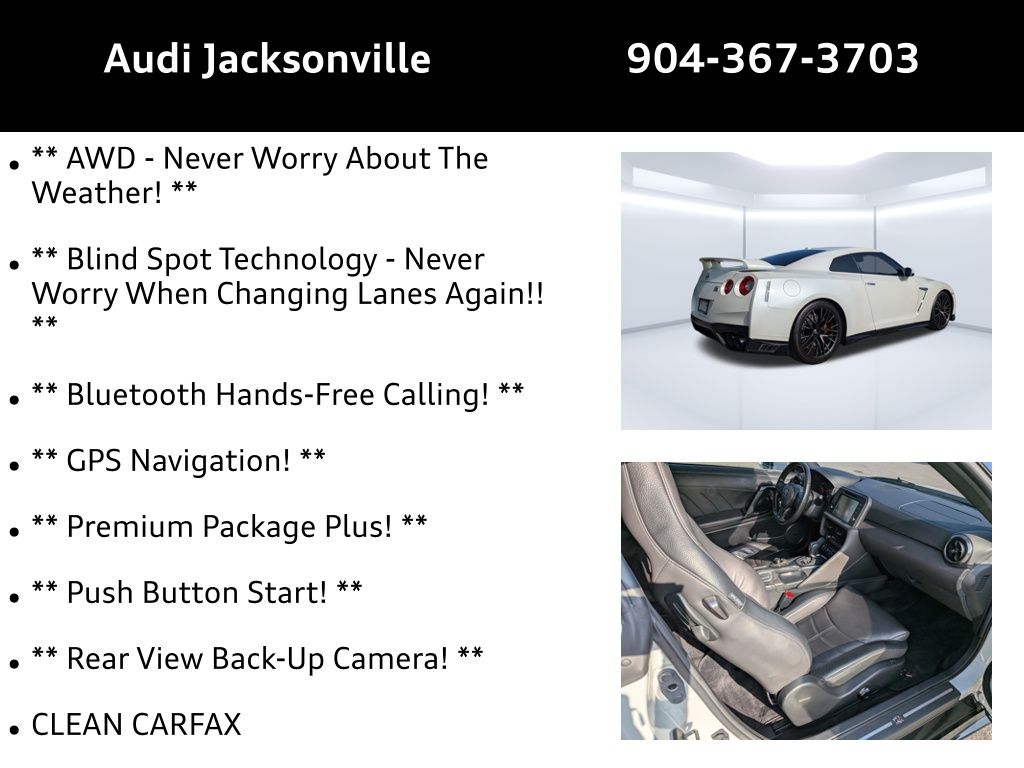 Unleash your driving ambitions with the 2021 Nissan GT-R Premium, a masterpiece of engineering that promises to transform your everyday commute into an exhilarating journey. This iconic coupe, available at Audi Jacksonville, is not just a car; it's a lifestyle statement designed for those who demand the extraordinary. Feel the power at your fingertips with a 3.8L V-6 DOHC twin-turbo engine, delivering a breathtaking 565 horsepower. Whether navigating the bustling streets of Jacksonville or embarking on a weekend getaway to the pristine beaches of Atlantic Beach, the ATTESA E-TS full-time all-wheel drive ensures you conquer every road with precision and confidence. The adaptive suspension and Bilstein shock absorbers offer a ride so smooth, it feels like you're gliding on air. Stay connected and entertained with the cutting-edge NissanConnect featuring Apple CarPlay. The 8-inch touchscreen integrated navigation system with voice activation makes finding your way through Jacksonville's vibrant neighborhoods a breeze. Enjoy your favorite tunes through the Bose 11-speaker system, whether you're cruising along the scenic routes or stuck in traffic on Atlantic Blvd. The 2021 GT-R doesn't compromise on safety. Equipped with automatic emergency braking, front and rear parking sensors, and a RearView Monitor, this vehicle is designed to protect you and your loved ones. The dual-zone climate control and heated front sport seats ensure comfort during those chilly morning drives or late-night adventures. With semi-Aniline leather upholstery and a leather-wrapped steering wheel, every touchpoint exudes luxury and sophistication. Stand out with its captivating Pearl White Tricoat finish, complemented by 20-inch RAYS forged aluminum wheels. The rear wing spoiler and titanium quasi-dual exhaust not only enhance its aesthetic appeal but also its aerodynamic efficiency. With LED headlights guiding your way, every drive becomes a bold statement of style and performance. This GT-R is more than just a car; it's your partner in adventure. Ready to make it yours? Visit Audi Jacksonville today or call us at 904-367-3700 to schedule a test drive. Explore flexible financing options with our Credit Application and discover the value of your current vehicle with our Value Your Trade tool. Don't miss this opportunity to elevate your driving experience with the 2021 Nissan GT-R Premium. The 2021 Nissan GT-R Premium is waiting to redefine your driving narrative. Embrace the power, luxury, and innovation that come with every mile. Your extraordinary journey starts today.Experience the Thrill: 2021 Nissan GT-R Premium Dual-clutch 6-Speed Transmission