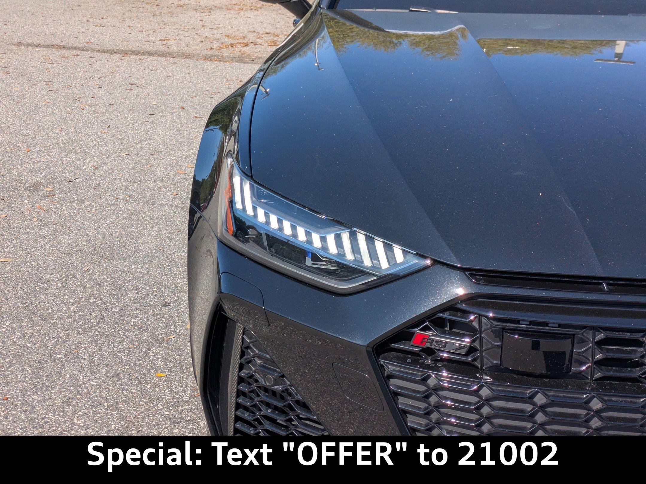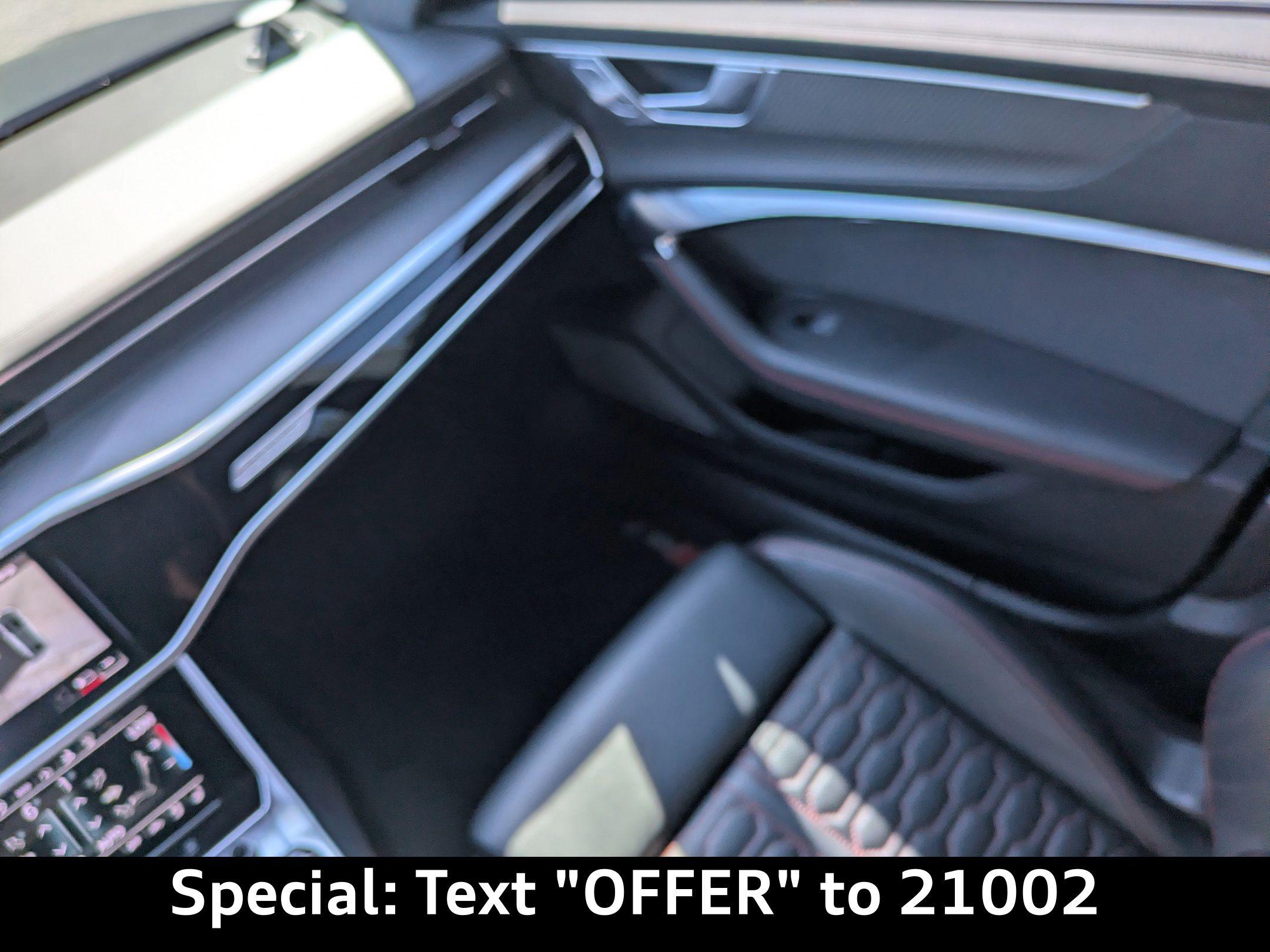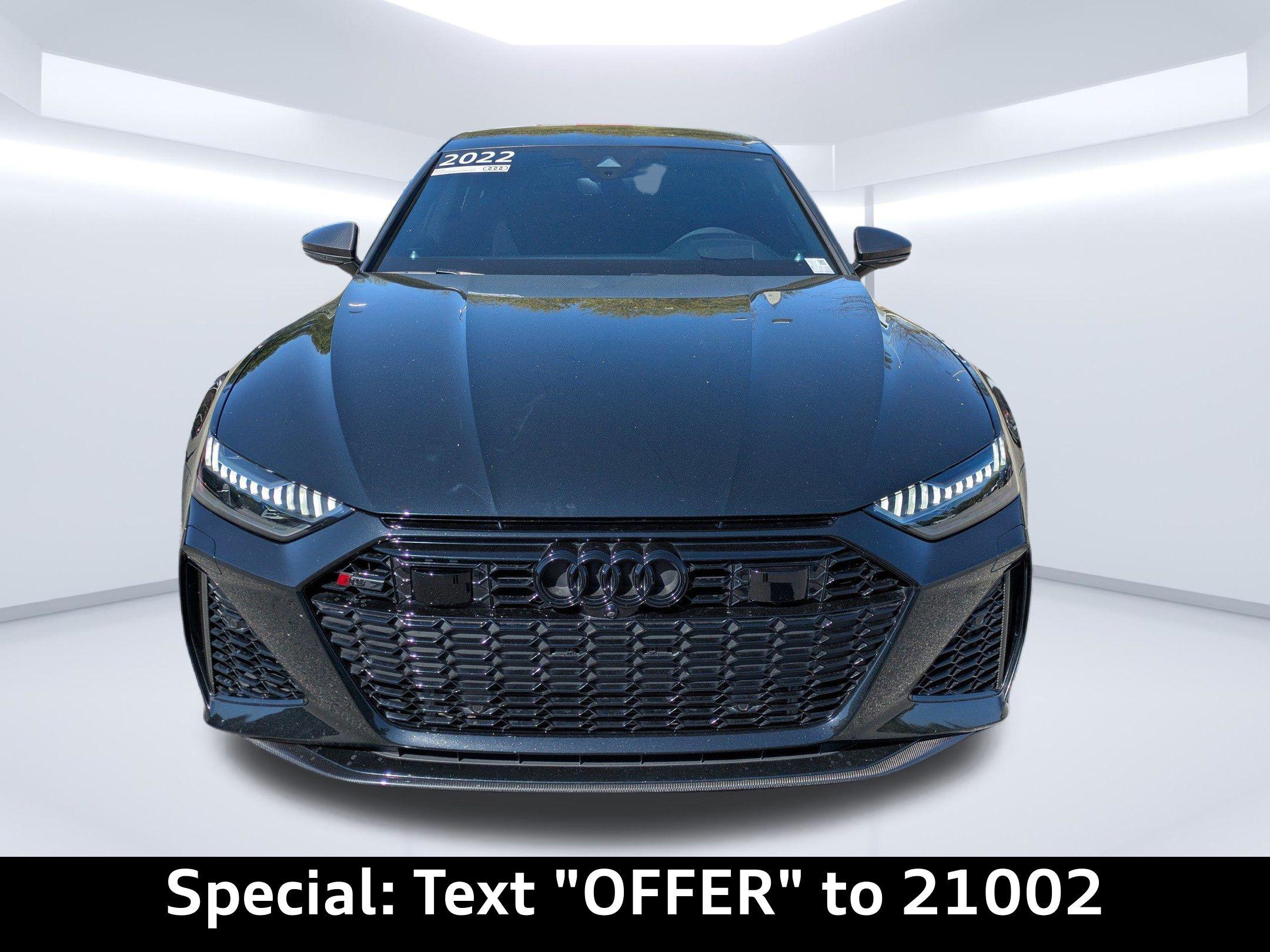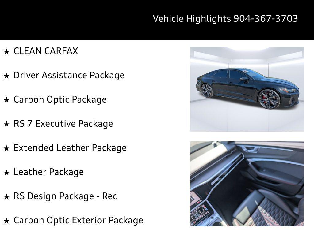 Imagine carving through the coastal roads near Ponte Vedra Beach, the sun glinting off the waves as the powerful engine of this Audi RS 7 Sportback responds to your every command. Whether it's a spirited drive after a round of golf or a stylish arrival at a beachfront restaurant, this machine elevates every experience. The heart of this 2022 Audi RS 7 Sportback is a potent 4L V-8 gasoline direct injection, DOHC, twin turbo engine with cylinder deactivation, delivering 591HP. Paired with an 8-speed automatic transmission and legendary All-Wheel Drive, this car offers exhilarating acceleration and confident handling in all conditions. The Audi drive select system allows you to tailor the car's performance to your preferences, whether you're seeking maximum thrills or comfortable cruising. With an estimated 15 city / 22 highway MPG, you can enjoy the performance without excessive trips to the pump. The advanced adaptive suspension and auto-leveling suspension ensure a smooth, controlled ride, whether you're navigating the scenic A1A or heading into town. And with the convenience of Fob engine controls with advanced key, starting your journey is effortless. Stay connected and informed with the advanced technology integrated into this RS 7 Sportback. The Audi virtual cockpit presents critical driving information on a 12.30-inch full gauge cluster screen, while the 10.1 inch primary display touchscreen provides intuitive control over the MMI Navigation plus integrated navigation system. Seamless smartphone integration is achieved through Audi smartphone interface (wireless Apple CarPlay/wired Android Auto), allowing you to access your favorite apps and music on the go. Enjoy hands-free communication with Bluetooth handsfree wireless device connectivity, and keep your devices charged using the convenient wireless device charging feature. You can control all of this via Steering wheel mounted audio controls, and see important information on the Head-Up Display. Step inside the RS 7 Sportback and experience a world of refined comfort and luxury. The Black/Red Valcona/Milano leather front seat upholstery provides a premium feel, while the heated front seats and ventilated front seats ensure optimal comfort in any weather. The dual-zone front climate control and dual-zone rear climate control allow you and your passengers to customize the temperature to your liking. The power driver seat and power passenger seat both offer extensive adjustability, including power lumbar support, ensuring a perfect driving position. The convenience of power door locks with 2-stage unlocking, power windows, and a power liftgate adds to the overall ease of use. The memory seat function stores your preferred settings for the driver's seat, mirrors, and steering wheel. The heated steering wheel will keep your hands warm on those chilly mornings. The Power Soft-Closing Doors offer an added touch of luxury. Your safety is paramount, and this RS 7 Sportback is equipped with a comprehensive suite of advanced safety features. 4-Wheel Disc Brakes with ABS provide confident stopping power, while Brake assist enhances braking performance in emergency situations. The Audi pre sense front forward collision mitigation system helps to prevent accidents, and lane departure warning alerts you if you unintentionally drift out of your lane. The rear camera and parking sensors make maneuvering in tight spaces easier and safer. The vehicle is equipped with dual front impact airbags, dual front side impact airbags, knee airbags, and overhead airbags to provide comprehensive protection in the event of a collision. The Blind spot Audi side assist blind spot warning will keep you safe on the highway. The Mythos Black Metallic exterior of this RS 7 Sportback exudes sophistication and understated aggression. The sleek lines and distinctive silhouette are further enhanced by the Black Optic Exterior Pkg and Carbon Exterior Mirror Housings. The First-row sunroof lets you enjoy the Florida sunshine, while the power rear spoiler adds a touch of sporty flair. The alloy wheels complement the overall design, and the rear wheel steering enhances agility and handling. The Bumpers are body-colored, and the Grille style is black with a metal-look surround. This 2022 Audi RS 7 Sportback is loaded with premium features for an exceptional driving experience: Audi Jacksonville is conveniently located to serve customers from Palm Coast, San Jose and Neptune Beach. Visit us at 11401 Atlantic Blvd, Jacksonville, FL 32225 to experience the 2022 Audi RS 7 Sportback for yourself. Call us at (904) 367-3700 to schedule a test drive or get a trade-in value for your current vehicle. You can also apply for credit online. We look forward to welcoming you to Audi Jacksonville! Get Directions to Audi Jacksonville. Build Codes: 98A | PRES | INTER | SIDEA | CRUISE | RECOG | 98E | EXTLP | HEAD | POWER | REARST | PEF | RSMATR | REDBLT | LTHR | RSTCH | ACSW | PEG | GSTCH | GRYBLT | RSMATGUnleash Your Potential: 2022 Audi RS 7 Sportback TFSI quattro Tiptronic