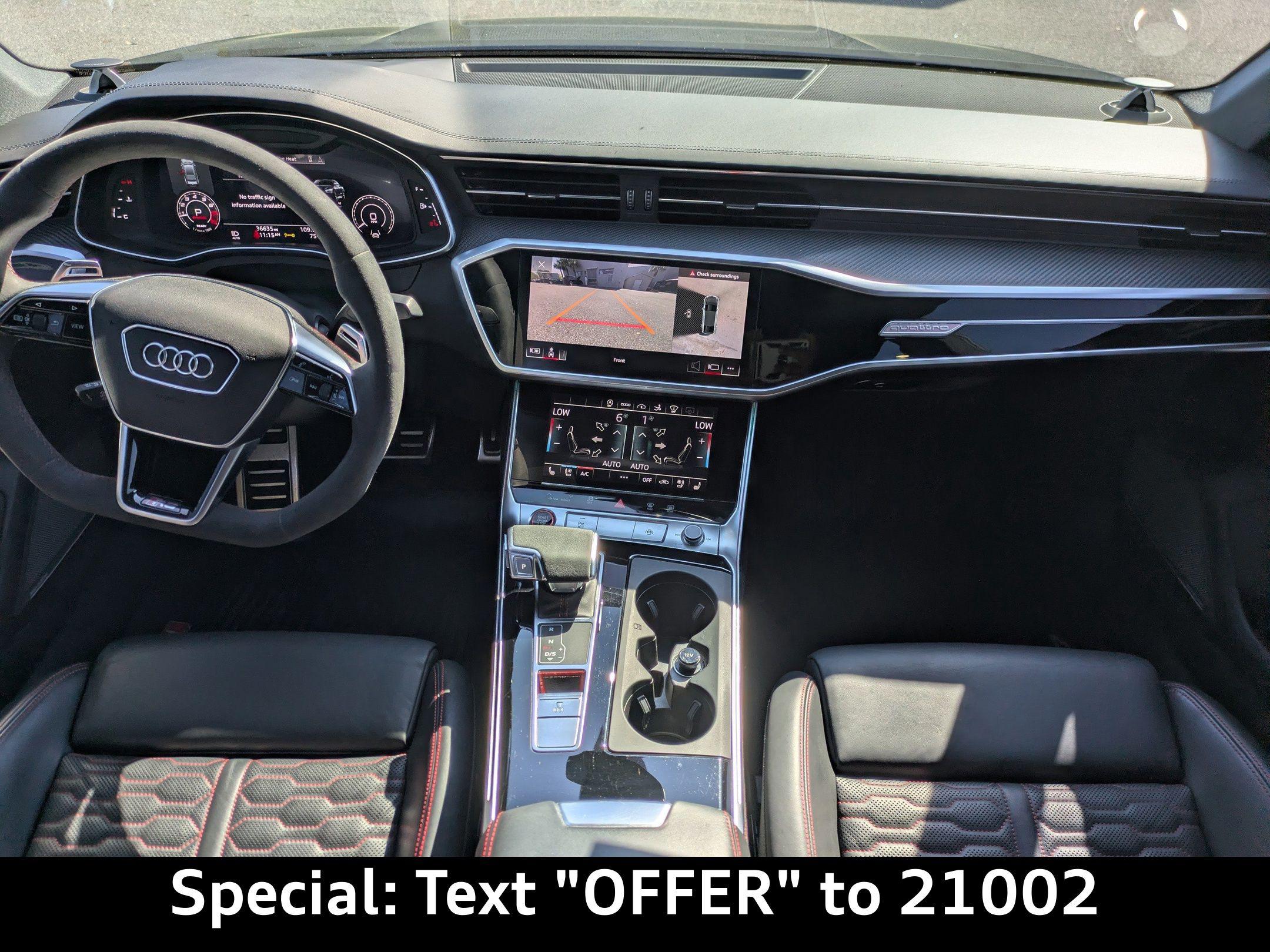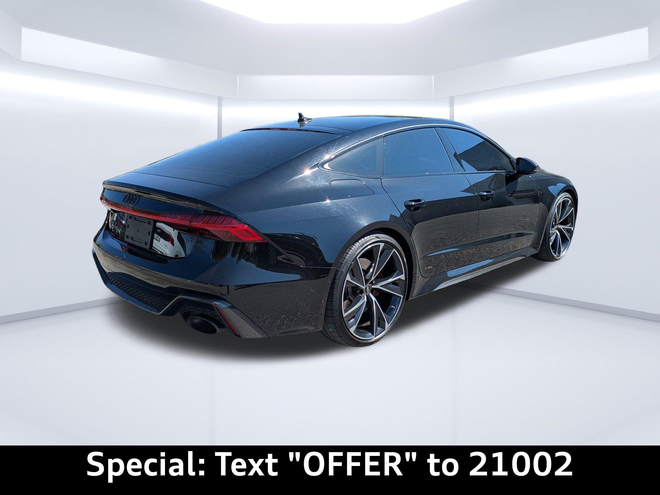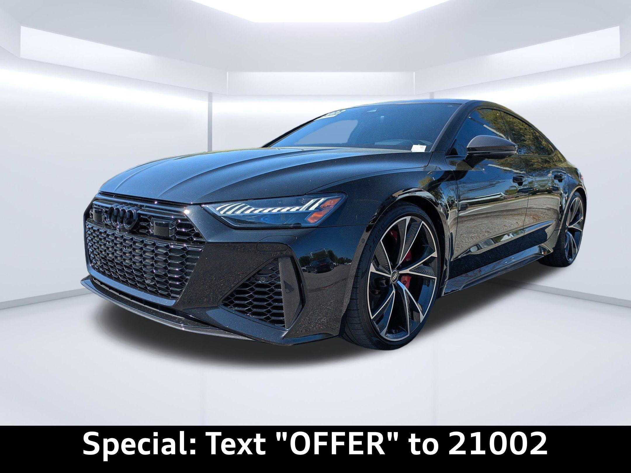 Imagine carving through the coastal roads near Ponte Vedra Beach, the sun glinting off the waves as the powerful engine of this Audi RS 7 Sportback responds to your every command. Whether it's a spirited drive after a round of golf or a stylish arrival at a beachfront restaurant, this machine elevates every experience. The heart of this 2022 Audi RS 7 Sportback is a potent 4L V-8 gasoline direct injection, DOHC, twin turbo engine with cylinder deactivation, delivering 591HP. Paired with an 8-speed automatic transmission and legendary All-Wheel Drive, this car offers exhilarating acceleration and confident handling in all conditions. The Audi drive select system allows you to tailor the car's performance to your preferences, whether you're seeking maximum thrills or comfortable cruising. With an estimated 15 city / 22 highway MPG, you can enjoy the performance without excessive trips to the pump. The advanced adaptive suspension and auto-leveling suspension ensure a smooth, controlled ride, whether you're navigating the scenic A1A or heading into town. And with the convenience of Fob engine controls with advanced key, starting your journey is effortless. Stay connected and informed with the advanced technology integrated into this RS 7 Sportback. The Audi virtual cockpit presents critical driving information on a 12.30-inch full gauge cluster screen, while the 10.1 inch primary display touchscreen provides intuitive control over the MMI Navigation plus integrated navigation system. Seamless smartphone integration is achieved through Audi smartphone interface (wireless Apple CarPlay/wired Android Auto), allowing you to access your favorite apps and music on the go. Enjoy hands-free communication with Bluetooth handsfree wireless device connectivity, and keep your devices charged using the convenient wireless device charging feature. You can control all of this via Steering wheel mounted audio controls, and see important information on the Head-Up Display. Step inside the RS 7 Sportback and experience a world of refined comfort and luxury. The Black/Red Valcona/Milano leather front seat upholstery provides a premium feel, while the heated front seats and ventilated front seats ensure optimal comfort in any weather. The dual-zone front climate control and dual-zone rear climate control allow you and your passengers to customize the temperature to your liking. The power driver seat and power passenger seat both offer extensive adjustability, including power lumbar support, ensuring a perfect driving position. The convenience of power door locks with 2-stage unlocking, power windows, and a power liftgate adds to the overall ease of use. The memory seat function stores your preferred settings for the driver's seat, mirrors, and steering wheel. The heated steering wheel will keep your hands warm on those chilly mornings. The Power Soft-Closing Doors offer an added touch of luxury. Your safety is paramount, and this RS 7 Sportback is equipped with a comprehensive suite of advanced safety features. 4-Wheel Disc Brakes with ABS provide confident stopping power, while Brake assist enhances braking performance in emergency situations. The Audi pre sense front forward collision mitigation system helps to prevent accidents, and lane departure warning alerts you if you unintentionally drift out of your lane. The rear camera and parking sensors make maneuvering in tight spaces easier and safer. The vehicle is equipped with dual front impact airbags, dual front side impact airbags, knee airbags, and overhead airbags to provide comprehensive protection in the event of a collision. The Blind spot Audi side assist blind spot warning will keep you safe on the highway. The Mythos Black Metallic exterior of this RS 7 Sportback exudes sophistication and understated aggression. The sleek lines and distinctive silhouette are further enhanced by the Black Optic Exterior Pkg and Carbon Exterior Mirror Housings. The First-row sunroof lets you enjoy the Florida sunshine, while the power rear spoiler adds a touch of sporty flair. The alloy wheels complement the overall design, and the rear wheel steering enhances agility and handling. The Bumpers are body-colored, and the Grille style is black with a metal-look surround. This 2022 Audi RS 7 Sportback is loaded with premium features for an exceptional driving experience: Audi Jacksonville is conveniently located to serve customers from Palm Coast, San Jose and Neptune Beach. Visit us at 11401 Atlantic Blvd, Jacksonville, FL 32225 to experience the 2022 Audi RS 7 Sportback for yourself. Call us at (904) 367-3700 to schedule a test drive or get a trade-in value for your current vehicle. You can also apply for credit online. We look forward to welcoming you to Audi Jacksonville! Get Directions to Audi Jacksonville. Build Codes: 98A | PRES | INTER | SIDEA | CRUISE | RECOG | 98E | EXTLP | HEAD | POWER | REARST | PEF | RSMATR | REDBLT | LTHR | RSTCH | ACSW | PEG | GSTCH | GRYBLT | RSMATGUnleash Your Potential: 2022 Audi RS 7 Sportback TFSI quattro Tiptronic