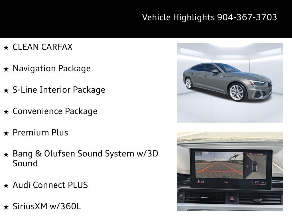 Experience the perfect blend of luxury, performance, and technology with the 2023 Audi A5 Sportback Premium Plus 45 TFSI S line quattro S tronic. Designed for those who demand sophistication and efficiency, this vehicle is your ideal companion for both daily commutes and spontaneous weekend adventures across Jacksonville and beyond. Feel the power of the 2L I-4 engine, delivering 261 horsepower with the precision of a 7-Speed Automatic S tronic transmission. The quattro all-wheel drive ensures you maintain control on both the sunny streets of Jacksonville and the occasional rainy day, enhanced by the Sport ride suspension. Whether navigating the vibrant city or exploring the scenic routes of nearby beaches, this Audi guarantees a drive that's both exhilarating and smooth. Stay seamlessly connected with the Audi Virtual Cockpit Plus and MMI Navigation Plus, featuring a 10.1-inch primary touchscreen display. The Audi Connect PLUS and Bang & Olufsen Sound System with 3D Sound transform every journey into an immersive experience. With Apple CarPlay and wireless device charging, your smartphone integrates effortlessly, ensuring you're always in touch and entertained. Designed with your family's safety in mind, the A5 Sportback includes Audi pre sense rear collision mitigation, Audi side assist, and a Top view camera system. The adaptive cruise control with stop and go and Audi Active Lane Assist make highway driving less stressful, while the automatic emergency braking adds an extra layer of security. Inside, the Nappa/Dinamica simulated suede and leather upholstery offers unparalleled comfort, complemented by heated front sport seats and a heated steering wheel for those cooler Jacksonville evenings. The Chronos Gray Metallic exterior with body-colored bumpers and chrome grille exudes elegance, while the power liftgate and split folding rear seats add practicality for your active lifestyle. Whether you're loading up for a family beach day or a golf outing with friends, the spacious interior and rigid cargo cover ensure you have all the room you need. Don't miss out on the opportunity to own this incredible vehicle. Visit Audi Jacksonville or call us at 904-367-3700 to schedule your test drive. Ready to make the leap? Apply for financing through our Credit Application or get an estimate on your current vehicle's trade-in value with Value Your Trade. Embrace the future of driving with the 2023 Audi A5 Sportback. It's not just a car; it's your ticket to a lifestyle of luxury and adventure.2023 Audi A5 Sportback Premium Plus 45 TFSI S line quattro S tronic: Elevate Your Drive