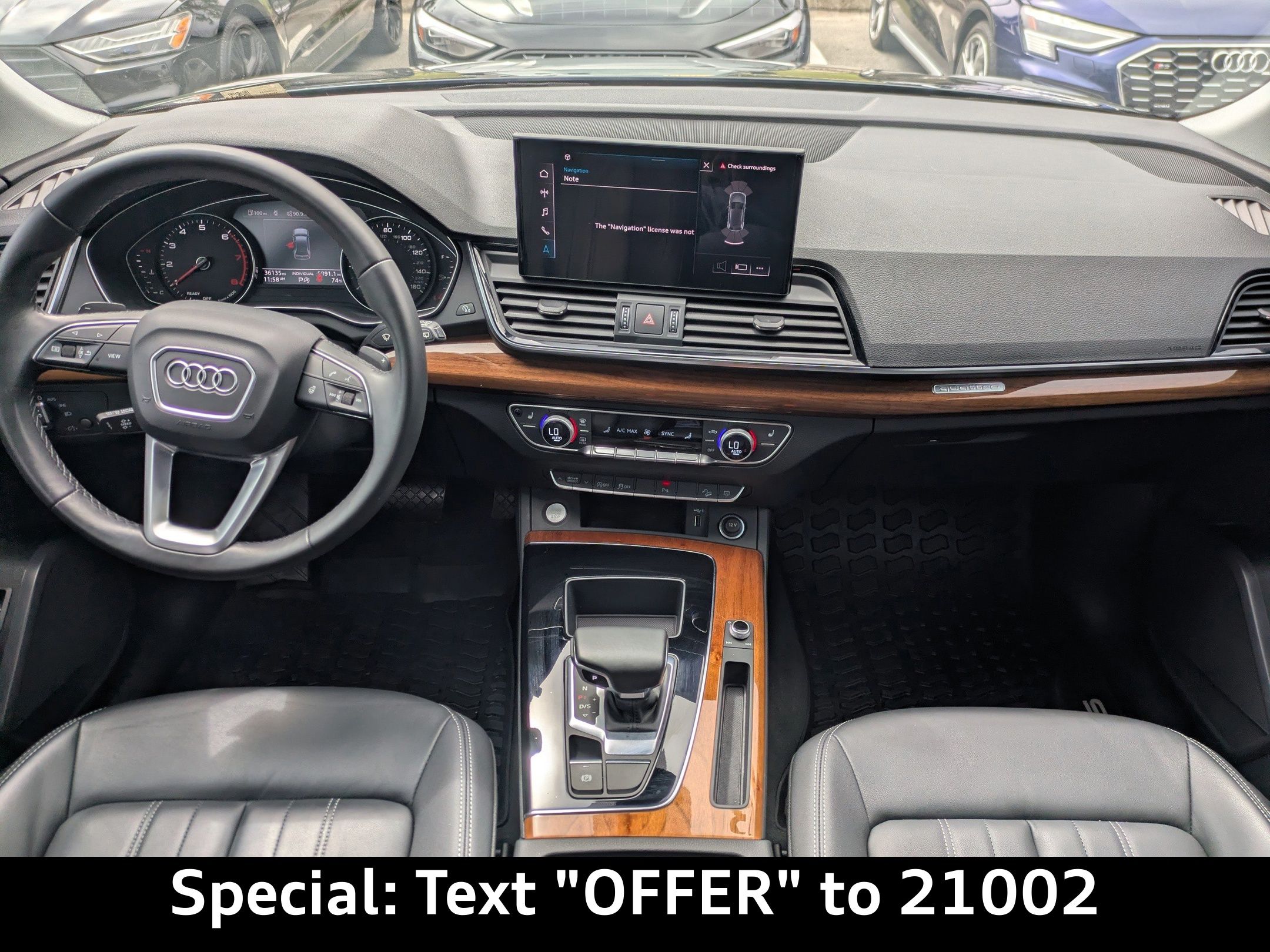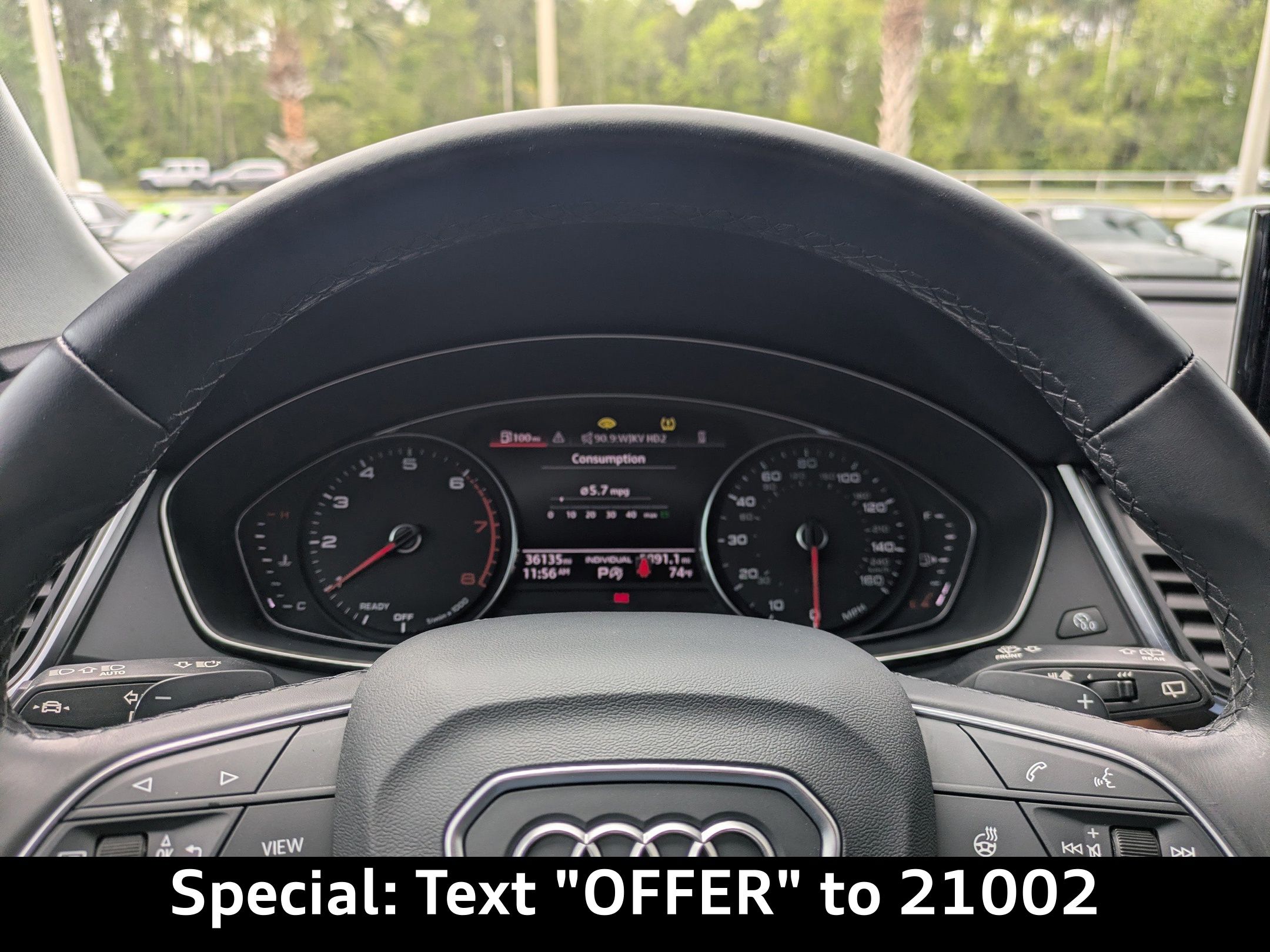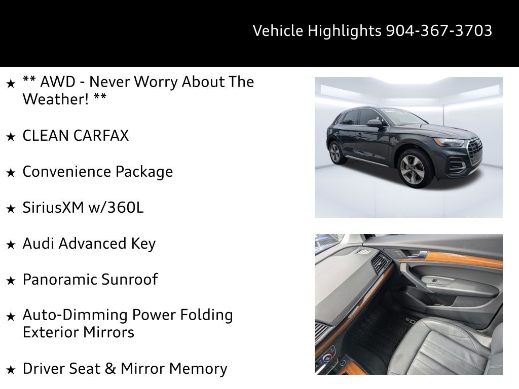 Imagine yourself cruising down A1A in Neptune Beach, the sun glinting off the ocean as you head to your favorite brunch spot. Or picture navigating the bustling streets of San Jose, effortlessly gliding through traffic with the confidence and style that only an Audi can provide. The 2023 Audi Q5 Premium 40 TFSI quattro S tronic is more than just an SUV; it's your gateway to experiencing the best of Northeast Florida. The 2023 Audi Q5 Premium is engineered to deliver a refined driving experience, whether you're commuting to work or exploring the scenic routes around Jacksonville. Powered by a 2.0L Turbo TFSI 4-Cylinder 201 HP Engine and paired with a responsive 7-Speed S Tronic Dual-Clutch Automatic Transmission, this SUV offers a smooth and efficient ride. The legendary All Wheel Drive system provides exceptional grip and control in various weather conditions, giving you peace of mind on those occasional rainy days. With Audi drive select driver selectable drivetrain mode, you can tailor the vehicle's performance to match your driving style and the road ahead. The hybrid powertrain offers enhanced fuel efficiency, making it ideal for both city commutes and weekend getaways. Stay connected and entertained on every journey with the advanced technology features of the 2023 Audi Q5 Premium. The Audi smartphone interface (Apple CarPlay/Android Auto) smart device wireless mirroring seamlessly integrates your smartphone, allowing you to access your favorite apps, navigation, and music directly from the 10.1 inch primary display touchscreen. The Steering wheel mounted audio controls put essential functions at your fingertips, while Handsfree Bluetooth handsfree wireless device connectivity keeps you connected without distractions. Enjoy crisp and clear audio through the 10 Speakers that envelop the cabin. Step inside the 2023 Audi Q5 Premium and experience a sanctuary of comfort and sophistication. Sink into the Heated 8-Way Power Front Bucket Seats upholstered in supple Leather Seating Surfaces, providing exceptional support and comfort on long drives. The Driver Seat & Mirror Memory ensures your preferred settings are always just a touch away. Maintain the perfect cabin temperature with the Automatic climate control, while rear passengers enjoy personalized comfort with Rear climate control system with separate controls. The convenience of the Power Liftgate makes loading and unloading cargo a breeze, and the Heated Steering Wheel adds a touch of luxury on chilly mornings. Your safety is paramount, and the 2023 Audi Q5 Premium is equipped with a comprehensive suite of safety features to provide peace of mind on every drive. 4-Wheel Disc Brakes and ABS brakes deliver confident stopping power, while Electronic Stability Control helps maintain stability in challenging conditions. The Exterior Parking Camera Rear provides a clear view of your surroundings when backing up, and Audi pre sense city forward collision mitigation helps prevent or mitigate potential collisions. Lane departure Lane departure warning alerts you if you unintentionally drift out of your lane, and the advanced airbag system provides comprehensive protection in the event of a collision. The 2023 Audi Q5 Premium exudes modern elegance and sporty sophistication. Finished in stunning Manhattan Gray Metallic paint, this SUV commands attention with its sleek lines and distinctive Audi design cues. The Panoramic Sunroof floods the cabin with natural light, creating an airy and open atmosphere. The 19' 5-Arm-pylon Design with Matte Finish Wheels add a touch of sporty flair, while the Rear lip spoiler enhances the vehicle's aerodynamic profile. The Power door mirrors provide added convenience, and the Roof rack offers versatility for carrying extra cargo on your adventures. The 2023 Audi Q5 Premium 40 TFSI quattro S tronic offers a compelling blend of luxury, performance, and technology. Here are some key highlights: Getting to Audi Jacksonville from anywhere in Northeast Florida is easy. Whether you're coming from Palm Coast, Ponte Vedra Beach, or anywhere in between, our convenient location on Atlantic Boulevard makes us easily accessible. We invite you to visit Audi Jacksonville at 11401 Atlantic Blvd, Jacksonville, FL 32225 to experience the 2023 Audi Q5 Premium for yourself. Call us at (904) 367-3700 to schedule a test drive or discuss financing options. You can also apply for credit online or value your trade before you arrive. We look forward to welcoming you to Audi Jacksonville! Build Codes: WPD | DMEM | SIR3M | HSTEER | KEY | MIRROR | U40 | NONTR | 3FU | 7TC | STDAX | STDEN | STDGV | STDRD | STDST | STDTM | ZY2023 Audi Q5 Premium: Elevate Your Jacksonville Drive