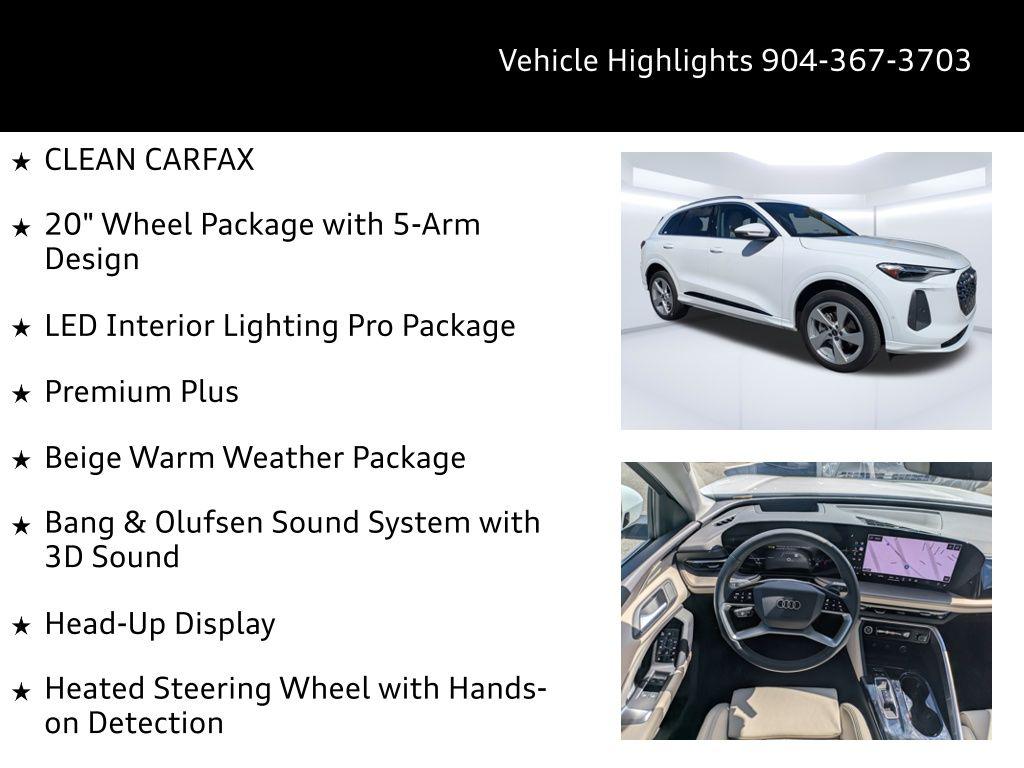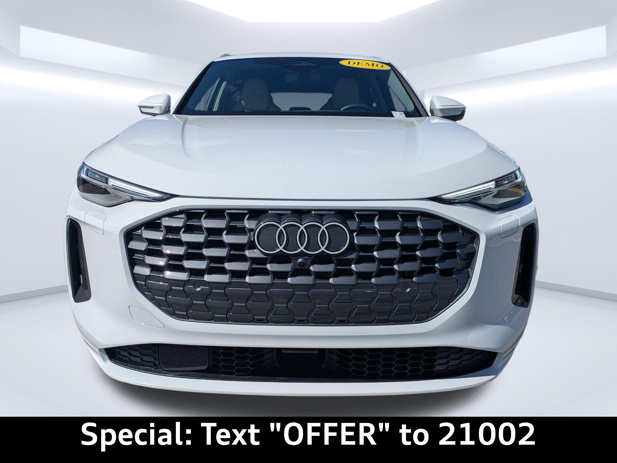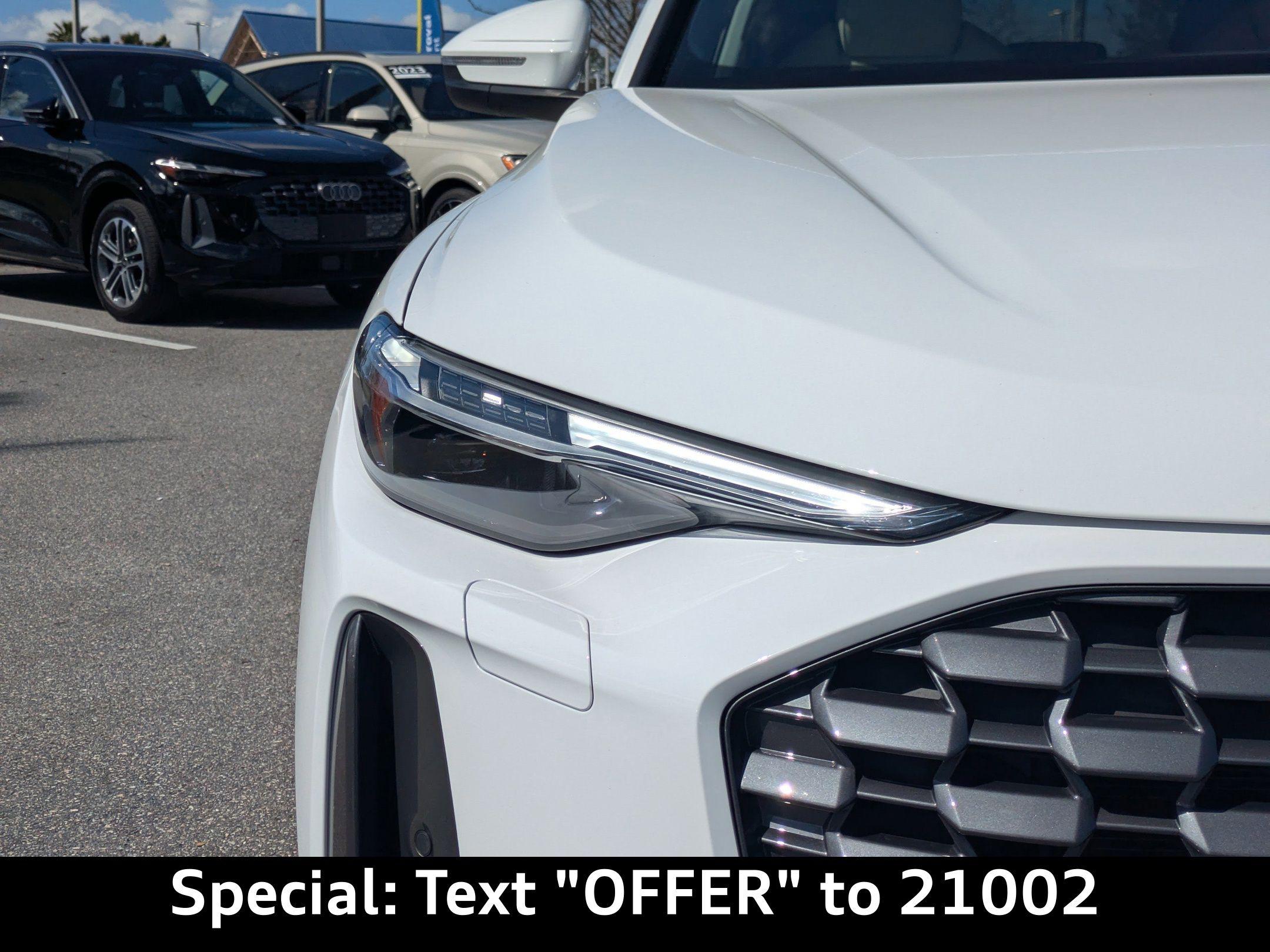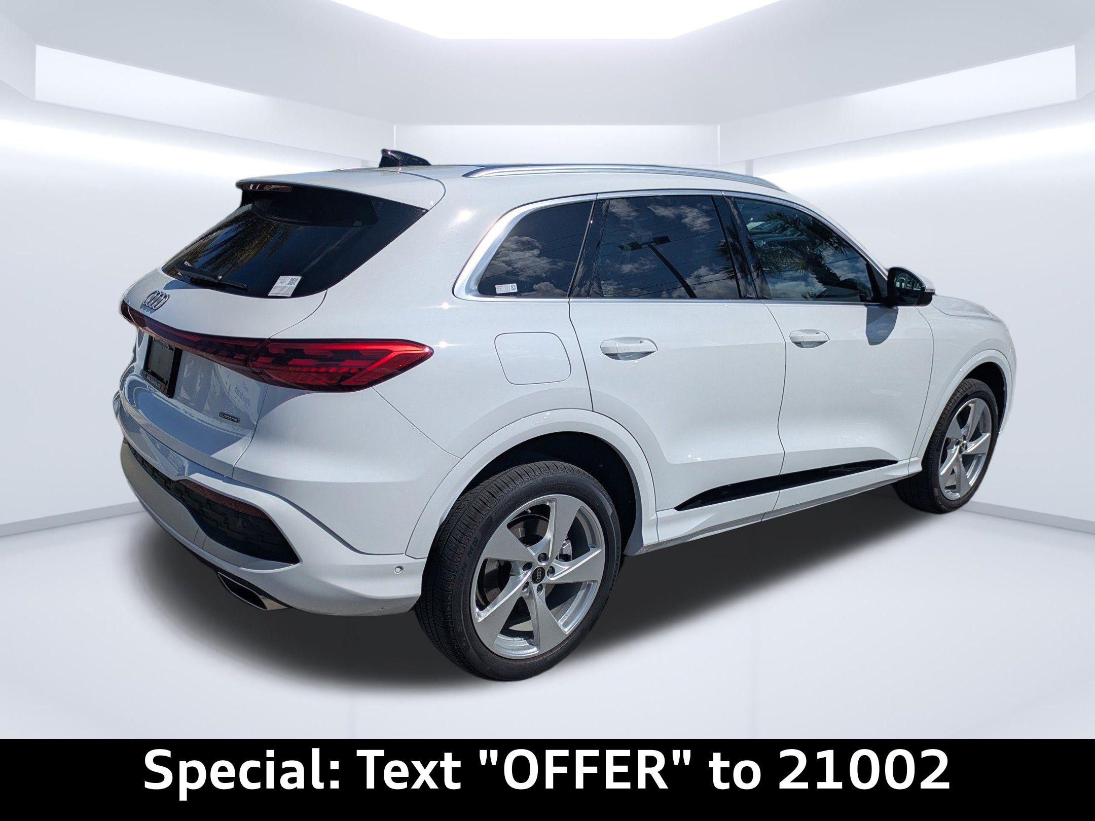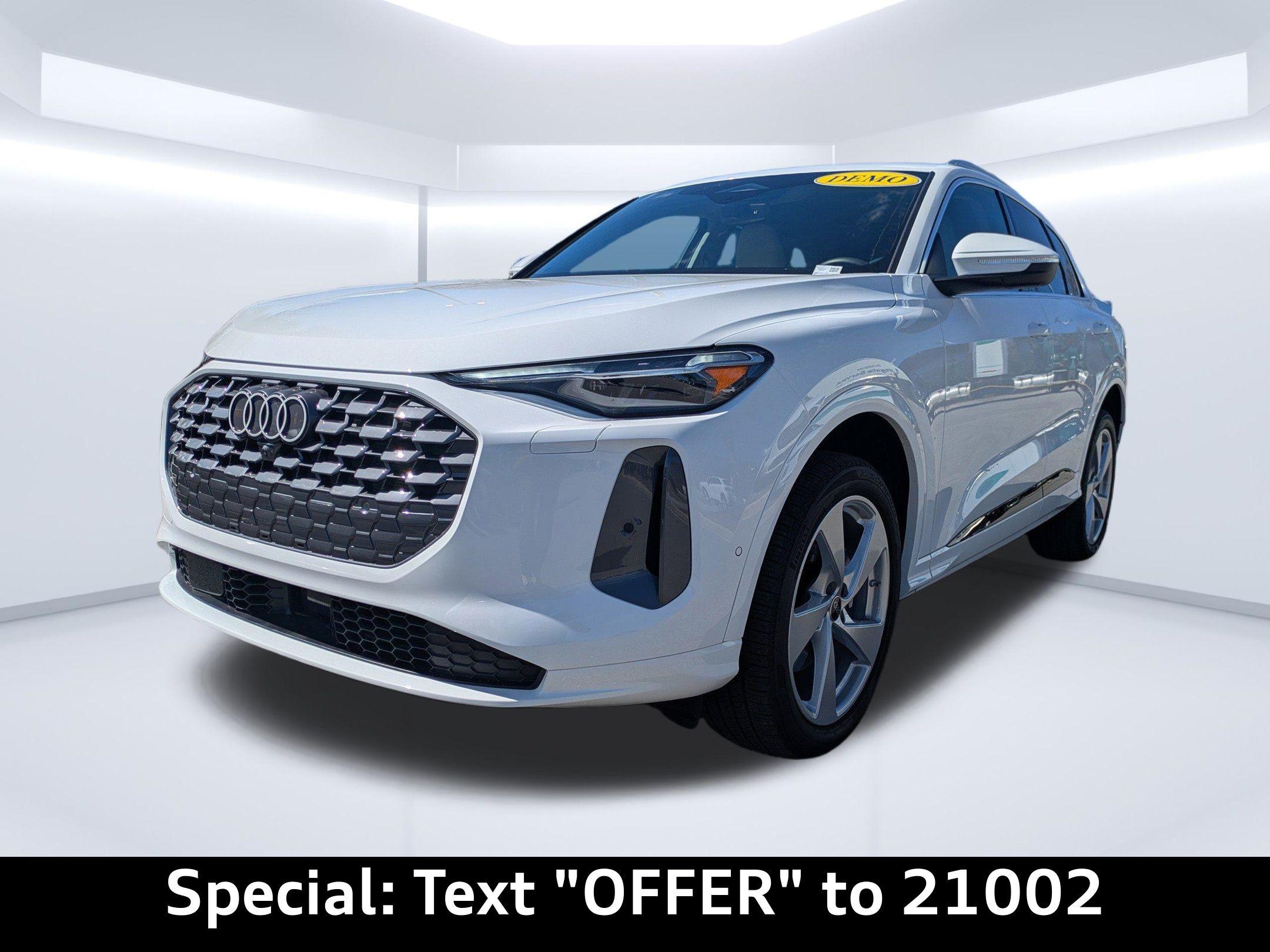 Imagine gliding through the sun-drenched streets of Ponte Vedra Beach, the ocean breeze whispering through the panoramic sunroof of your brand new Audi Q5. Whether you're heading to the golf course or picking up the kids from school, the Q5 effortlessly blends luxury with the demands of your active lifestyle. The 2025 Audi Q5 Premium Plus is engineered to conquer any road with confidence. Its 2.0L I-4 turbocharged engine delivers a robust 268 horsepower, providing exhilarating acceleration for effortless highway merging and responsive city driving. The advanced 7-speed S tronic automatic transmission ensures seamless gear changes, optimizing both performance and fuel efficiency. Audi's legendary quattro all-wheel drive provides exceptional grip and stability, giving you peace of mind during those occasional Florida rainstorms or when navigating unpaved roads closer to Palm Coast. With Audi drive select, you can tailor the Q5's driving dynamics to your preference, choosing from various modes that adjust the steering, throttle response, and suspension for a truly personalized experience. The engine oil cooler ensures optimal performance even under demanding conditions, while the start-stop engine technology helps conserve fuel during city commutes. Stay connected and entertained on every journey with the Q5's cutting-edge technology. The centerpiece is the 14.5-inch primary touchscreen display, offering intuitive control over the infotainment system. Seamlessly integrate your smartphone with wireless Apple CarPlay and wired Android Auto, accessing your favorite apps, music, and contacts with ease. The Audi connect NAV & PLUS integrated navigation system guides you to your destination with precision, providing real-time traffic updates and voice-activated control. Enjoy crystal-clear audio through the premium sound system, and keep your devices charged with the convenient wireless device charging pad and multiple USB ports throughout the cabin. The 11.90-inch digital gauge cluster provides a customizable display of essential vehicle information, while the head-up display projects critical data onto the windshield, allowing you to keep your eyes on the road. Step inside the Q5 and experience a world of refined comfort and sophistication. The leather front seats offer exceptional support, with power-adjustable lumbar support for both the driver and front passenger. Stay comfortable in any weather with the ventilated front seats and heated front seats, while the heated steering wheel provides warmth on chilly mornings. The automatic climate control system maintains the perfect temperature for both front and rear passengers, ensuring a comfortable ride for everyone. The panoramic sunroof fills the cabin with natural light, creating an open and airy atmosphere. The power liftgate provides easy access to the spacious cargo area, perfect for hauling groceries or weekend gear. With features like memory settings for the driver's seat and mirrors, keyless entry, and a power tilt and telescopic steering column, the Q5 is designed to make every journey effortless. The 2025 Audi Q5 is equipped with a comprehensive suite of safety and driver-assistance features to provide peace of mind on every drive. Adaptive cruise control maintains a safe following distance, while lane departure warning helps you stay within your lane. Blind spot monitoring alerts you to vehicles in your blind spots, and rear cross traffic assist helps you back out of parking spaces safely. The top view camera system provides a 360-degree view of your surroundings, making parking and maneuvering in tight spaces a breeze. Forward collision mitigation helps prevent accidents, and the advanced airbag system provides comprehensive protection in the event of a collision. With features like electronic stability control and anti-lock brakes, the Q5 is designed to keep you safe and in control in any situation. The Arkona White exterior of the 2025 Audi Q5 exudes sophistication and elegance. The sleek lines and distinctive Audi grille make a bold statement, while the 20-inch wheels add a touch of sporty flair. The LED headlights provide exceptional visibility, and the panoramic sunroof adds an open and airy feel to the cabin. The rear lip spoiler enhances the Q5's aerodynamic profile, while the roof rails provide added versatility for carrying cargo. The body-colored bumpers and metal-look accents create a cohesive and stylish look, while the power folding door mirrors add convenience. You can find more Accessories at our store. This 2025 Audi Q5 Premium Plus offers a compelling combination of luxury, performance, and technology. Here are some of its standout features: New Vehicles are waiting for you. Audi Jacksonville is conveniently located to serve customers from Neptune Beach and surrounding areas. Stop by our showroom at 11401 Atlantic Blvd, Jacksonville, FL 32225, or Call us at (904) 367-3700 to Schedule Service or a test drive. Our friendly and knowledgeable staff is ready to assist you with Credit Application options, Value Your Trade appraisals, and any questions you may have. Experience the Audi difference today at Audi Jacksonville! Get Directions to Audi Jacksonville. Build Codes: WPS | 3FU | USB | BANG | TOPV | CRUISE | INLP | ANIME | NONTR1 | DILGT | STRHD | NONWL1 | HEADUP | WASHER | LEDHP | PWE | SHADE | NONST | XWF | INLAY | XWT2025 Audi All-new Q5 Premium Plus TFSI quattro S tronic: Elevate Your Everyday