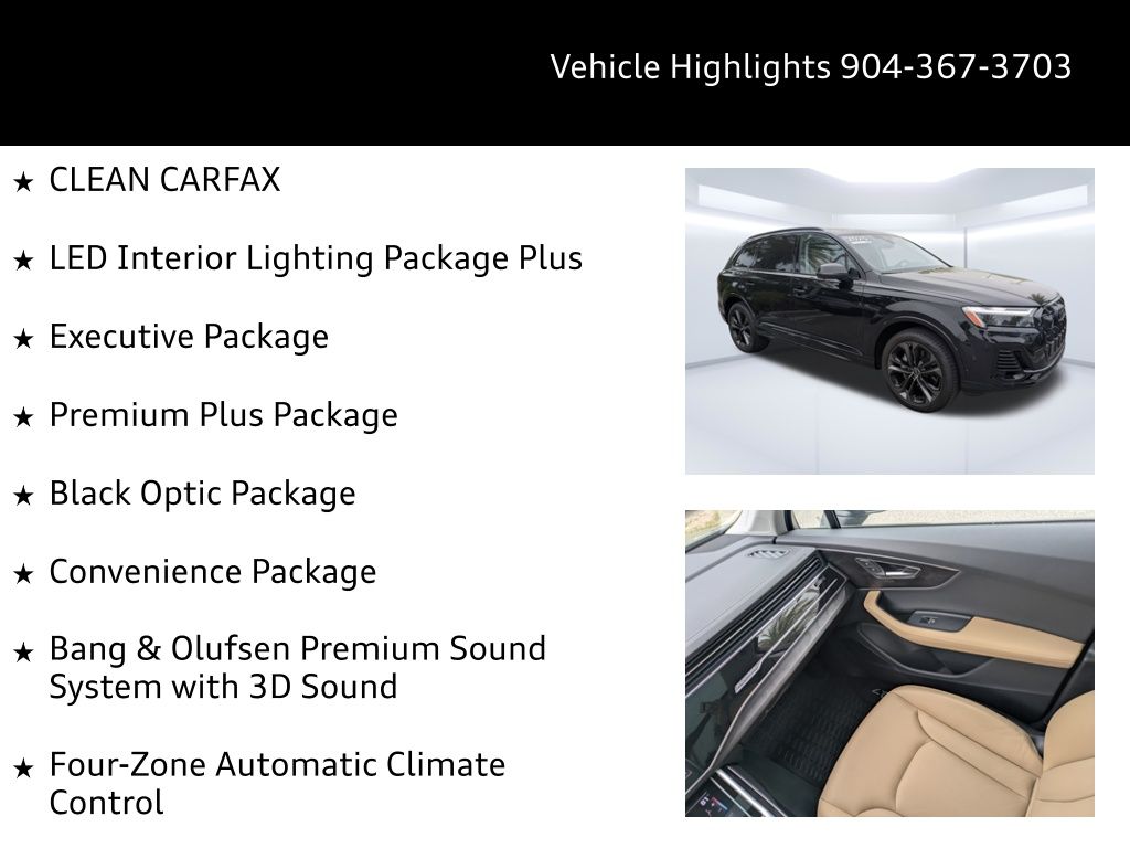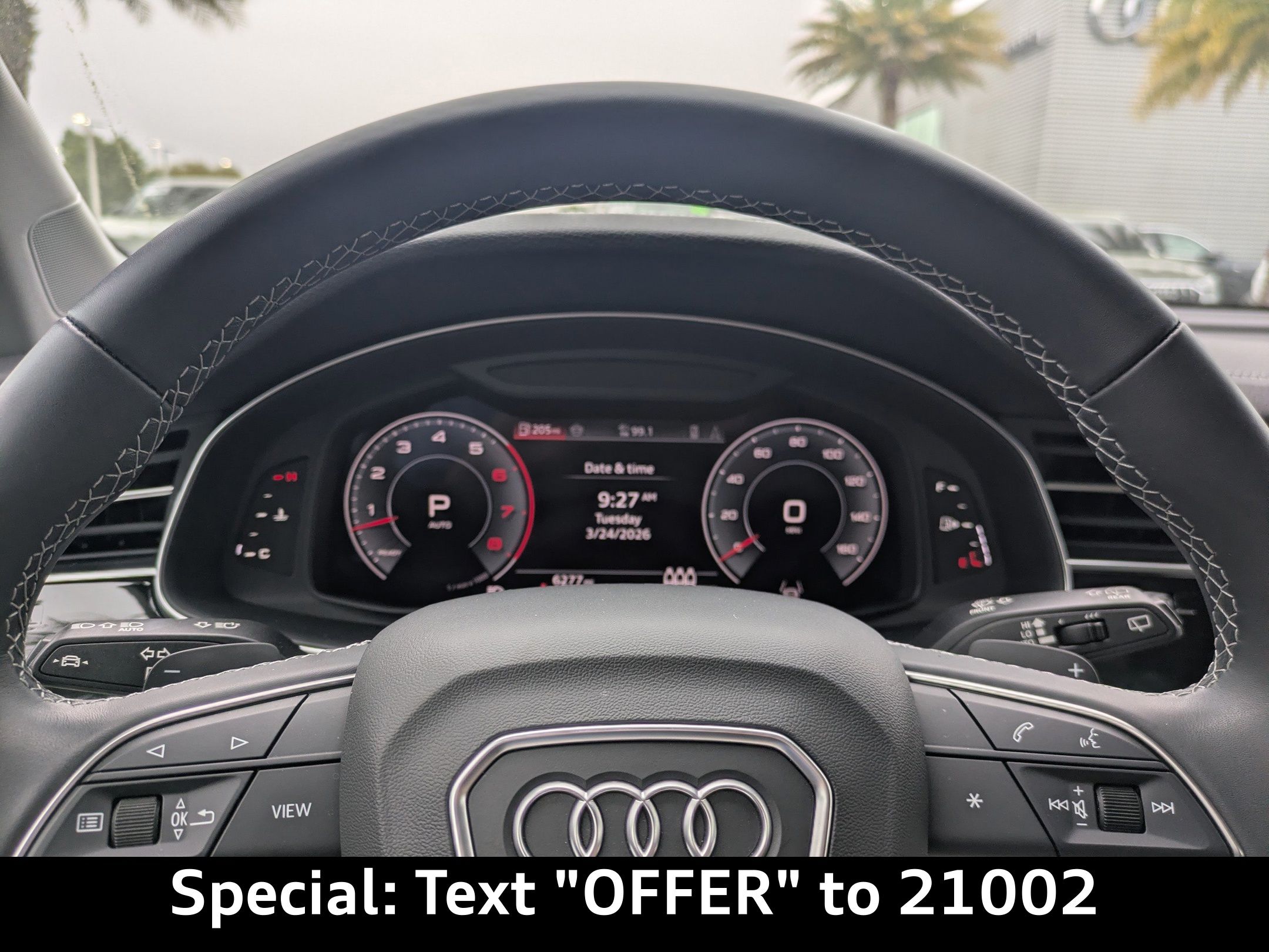 Imagine navigating the scenic A1A in Neptune Beach, the sun glinting off the Mythos Black Metallic finish of your new Audi Q7. Whether it's a quick trip to the beach with the family or a sophisticated evening out, this SUV blends luxury and practicality for the discerning Jacksonville driver. The 2025 Audi Q7 Premium Plus is engineered for both spirited performance and refined comfort. Its 3L V-6 gasoline direct injection, DOHC, variable valve control, intercooled turbo, premium unleaded, engine with 335HP delivers responsive power for effortless highway merging and confident city driving. Paired with a smooth 8-speed automatic transmission and legendary All Wheel Drive quattro system, you'll experience exceptional grip and control in any weather. The Audi drive select driver selectable drivetrain mode allows you to tailor the Q7's driving dynamics to your preference, whether you're seeking maximum fuel efficiency or enhanced agility. The Electric powertrain MHEV (mild hybrid electric vehicle) enhances fuel economy, achieving an EPA-estimated 18 City/23 Hwy MPG. The Aluminum engine block construction contributes to the Q7's balanced handling and overall efficiency. The Lock-up transmission ensures optimal power transfer, while the Engine oil cooler maintains consistent performance even under demanding conditions. Stay connected and entertained on every journey with the advanced technology integrated into the 2025 Audi Q7 Premium Plus. The Audi smartphone interface w/wireless Apple CarPlay & Android Auto smart device wireless mirroring seamlessly integrates your smartphone, providing access to your favorite apps, music, and contacts. The Audi MMI Navigation plus with Touch Response integrated navigation system with voice activation ensures you're always on the right path, with intuitive controls and real-time traffic updates. The expansive 10.1 inch primary display touchscreen MMI touch response primary monitor touchscreen provides a clear and responsive interface for controlling vehicle functions and accessing information. The Audi virtual cockpit plus digital/analog instrumentation display presents essential driving data in a customizable and easy-to-read format. Enjoy crystal-clear audio with the Bang & Olufsen Premium Sound System with 3D Sound. Keep your devices charged on the go with the Wireless Phone Charging Pad. Stream your favorite music wirelessly via Bluetooth wireless audio streaming. Step inside the 2025 Audi Q7 Premium Plus and experience a sanctuary of comfort and luxury. Sink into the supportive Leather front seat upholstery and find your perfect driving position with the Power driver seat featuring power reclining, lumbar support, cushion tilt, fore/aft control and height adjustable control. Your front passenger also enjoys optimal comfort with the Power passenger seat with power reclining, lumbar support, cushion tilt, fore/aft control and height adjustable control. The Heated front seats and Heated steering wheel provide warmth on chilly mornings, while the Ventilated driver and front passenger seats keep you cool and comfortable during the hot Florida summers. The Four-Zone Automatic Climate Control ensures everyone stays comfortable. Enjoy the expansive view of the sky with the Power moonroof: Panoramic. The Power Liftgate makes loading and unloading cargo a breeze. The Memory seat function stores your preferred settings for the driver's seat and mirrors. The Remote keyless entry and Power door locks with 2 stage unlocking provide added convenience and security. The 2025 Audi Q7 Premium Plus prioritizes your safety with a comprehensive suite of advanced safety features. The Adaptive cruise control Adaptive cruise assist with lane guidance cruise control with stop and go helps maintain a safe following distance on the highway, while the Audi side assist blind spot warning alerts you to vehicles in your blind spot. The Audi pre sense basic and front forward collision mitigation system can detect potential collisions and automatically apply the brakes to help mitigate or avoid an impact. The Top View Camera System provides a 360-degree view of your surroundings, making parking and maneuvering in tight spaces easier and safer. The 4-Wheel Disc Brakes with ABS brakes provide confident stopping power in all conditions. The Q7 is equipped with 8 airbags to provide comprehensive protection in the event of a collision. The Mythos Black Metallic exterior of the 2025 Audi Q7 Premium Plus exudes sophistication and understated elegance. The Black Grille and Black Roof Rails add a touch of sporty flair. The Alloy wheels complement the Q7's dynamic stance. The LED daytime running lights enhance visibility and add a distinctive visual signature. The Power moonroof: Panoramic floods the cabin with natural light. The Rear lip spoiler adds a touch of aerodynamic style. This 2025 Audi Q7 Premium Plus 55 TFSI quattro Tiptronic offers a compelling blend of luxury, performance, and technology. Getting to Audi Jacksonville from anywhere in the Jacksonville area, including San Jose, is a breeze. We're conveniently located at 11401 Atlantic Blvd, Jacksonville, FL 32225. Get Directions to Audi Jacksonville. We invite you to visit Audi Jacksonville to experience the 2025 Audi Q7 Premium Plus firsthand. Call us at (904) 367-3700 to schedule a test drive or learn more. You can also Value Your Trade or apply for credit online. We look forward to welcoming you! Build Codes: XBO | RINGS | TIPS | XCP | HTWHL | TVCS | CHARGE | PWZ | GLASS | HEAT | TRAFIC | 4ZONE | VENTST | SHADE | WPS | U22 | BANG | LEDINT | SILLS | OPTIC | BGRL | BRR | BLADE | BWS2025 Audi Q7 Premium Plus 55 TFSI quattro Tiptronic: Elevate Your Everyday Drive