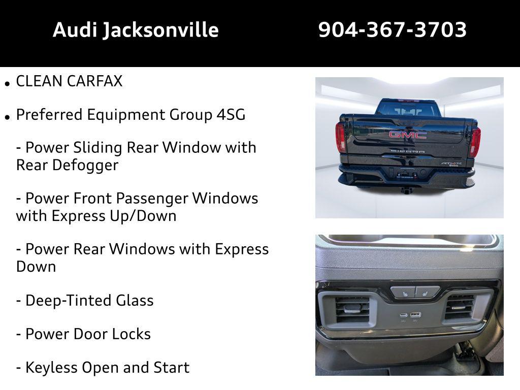 Welcome to the epitome of rugged sophistication, the 2026 GMC Sierra 1500 Crew Cab, Short Bed, AT4X, 4WD. Perfectly crafted for the vibrant lifestyle of Jacksonville, Florida, this truck is more than just a means of transportation—it's a statement of power, luxury, and innovation. Whether you're navigating the urban jungle or venturing off the beaten path, the Sierra's 6.2L EcoTec3 V8 Engine with 420HP ensures you're never short on power. The AutoTrac part and full-time 4WD system, complemented by Driver-Selectable Full-Locking Front and Rear Differentials, offers unparalleled control on any terrain. With Off-Road Suspension and Hill Descent Control, you can confidently tackle the trails of the nearby Timucuan Preserve or the sandy shores of Atlantic Beach. Seamlessly integrate your digital life with the Premium GMC Infotainment Audio System Radio featuring Wireless Apple CarPlay and Android Auto. Stay connected on the go with the Wi-Fi Hotspot Capability and Built-in Google Assistant. The Head-Up Display and 12.3-inch Gauge Cluster Display keep essential information right in your line of sight, ensuring you remain focused on the road ahead. Safety is paramount with features like Automatic Emergency Braking, Forward Collision Alert, and Lane Keep Assist with Lane Departure Warning. The HD Surround Vision system provides a 360-degree view, making parking in bustling Jacksonville downtown a breeze. Enjoy the luxury of Ventilated Driver & Front Passenger Seats and a Heated Steering Wheel for those cooler winter mornings or when returning from a day at the Riverside Arts Market. With the Spray-On Pickup Bedliner and 120-Volt Bed Mounted Power Outlet, the Sierra is ready for your next DIY project or a weekend escape to the St. Johns River. The MultiPro Tailgate with Integrated Audio System by Kicker transforms your truck into the ultimate tailgating machine during Jaguars games. Plus, the Bose Premium Series with 12 Speakers ensures a concert-like experience on every drive. This vehicle is in stock at Audi Jacksonville, located at 11401 Atlantic Blvd, Jacksonville, FL 32225. Call us at 904-367-3700 to schedule a test drive. Ready to upgrade your ride? Use our Value Your Trade tool to get an estimate on your current vehicle. Need financing? Begin your journey with our Credit Application. Experience the GMC Sierra 1500 AT4X—where luxury meets power, all tailored to your adventurous lifestyle in Jacksonville.Discover the 2026 GMC Sierra 1500 Crew Cab, Short Bed, AT4X, 4WD