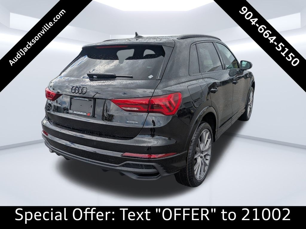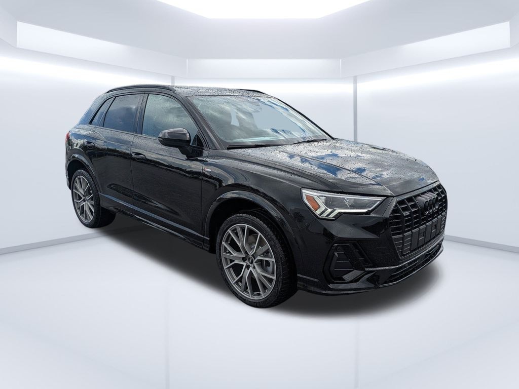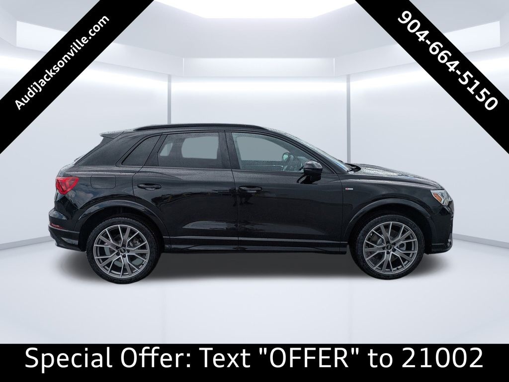 Mythos Black Metallic 2025 Audi Q3 S Line 45 TFSI quattro Premium Plus 8-Speed Automatic with Tiptronic 2.0L 4-Cylinder TFSI 12.3'' Audi Virtual Cockpit Plus Screen, 20'' Wheel Package, Alarm w/Motion Sensor, Alexa Integration, Audi Advanced Key, Audi Beam-Rings, Audi Cargo Box, Audi Connect NAV & PLUS, Audi Guard Protection Kit, Audi MMI Navigation Plus, Auto-Dimming Power-Folding Exterior Mirrors, Auto-Dimming Rear-View Mirror, Black Exterior Mirrors, Black Exterior Trim & Badges, Black Optic Plus Package, Black Roof Rails, Carbon Inlays, Convenience Package, Dinamica Upper Inlay & Door Armrests in Steel Gray, Driver Seat Memory, Garage Door Opener (HomeLink), LED Interior Lighting Package, LED Interior Lighting Plus Package, Premium Plus Package, SiriusXM, SiriusXM w/360L, SONOS Premium Sound System w/3D Sound, Sport Front Bucket Seats w/S Embossing, Stainless Steel Pedal Caps, Technology Package, Top View Camera System, Traffic Sign Recognition, Wheels: 20'' 5-V-Spoke-Star Design, Wireless Apple CarPlay/Android Auto, Wireless Phone Charging Pad, 4-Wheel Disc Brakes, ABS brakes, Air Conditioning, Alloy wheels, AM/FM radio, Audi smartphone interface (Apple CarPlay/Android Auto), Auto High-beam Headlights, Automatic temperature control, Brake assist, Bumpers: body-color, Delay-off headlights, Driver door bin, Driver vanity mirror, Dual front impact airbags, Dual front side impact airbags, Electronic Stability Control, Emergency communication system: Audi connect CARE, Exterior Parking Camera Rear, Four wheel independent suspension, Front anti-roll bar, Front Bucket Seats, Front Center Armrest, Front dual zone A/C, Front fog lights, Front reading lights, Fully automatic headlights, Heated door mirrors, Heated Front Bucket Seats, Heated front seats, Illuminated entry, Knee airbag, Leather Seating Surfaces, Leather Shift Knob, Leather steering wheel, Low tire pressure warning, Occupant sensing airbag, Outside temperature display, Overhead airbag, Overhead console, Panic alarm, Passenger door bin, Passenger vanity mirror, Power door mirrors, Power driver seat, Power Liftgate, Power moonroof: Panoramic, Power passenger seat, Power steering, Power windows, Radio data system, Rain sensing wipers, Rear air conditioning, Rear anti-roll bar, Rear fog lights, Rear reading lights, Rear seat center armrest, Rear window defroster, Rear window wiper, Remote keyless entry, Speed control, Speed-sensing steering, Split folding rear seat, Spoiler, Steering wheel mounted audio controls, Tachometer, Telescoping steering wheel, Tilt steering wheel, Traction control, Trip computer, Turn signal indicator mirrors, Variably intermittent wipers, CLEAN CARFAX, 12.3'' Audi Virtual Cockpit Plus Screen, 20'' Wheel Package, Alarm w/Motion Sensor, Alexa Integration, Audi Advanced Key, Audi Beam-Rings, Audi Cargo Box, Audi Connect NAV & PLUS, Audi Guard Protection Kit, Audi MMI Navigation Plus, Auto-Dimming Power-Folding Exterior Mirrors, Auto-Dimming Rear-View Mirror, Black Exterior Mirrors, Black Exterior Trim & Badges, Black Optic Plus Package, Black Roof Rails, Carbon Inlays, Convenience Package, Dinamica Upper Inlay & Door Armrests in Steel Gray, Driver Seat Memory, Garage Door Opener (HomeLink), LED Interior Lighting Package, LED Interior Lighting Plus Package, Premium Plus Package, SiriusXM, SiriusXM w/360L, SONOS Premium Sound System w/3D Sound, Sport Front Bucket Seats w/S Embossing, Stainless Steel Pedal Caps, Technology Package, Top View Camera System, Traffic Sign Recognition, Wheels: 20'' 5-V-Spoke-Star Design, Wireless Apple CarPlay/Android Auto, Wireless Phone Charging Pad.Recent Arrival! 20/28 City/Highway MPG