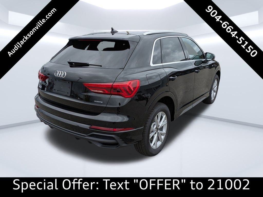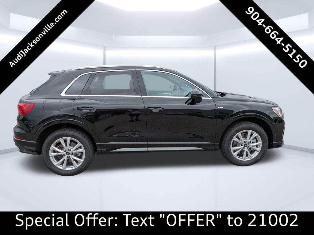 New Price! Mythos Black Metallic 2025 Audi Q3 S Line 45 TFSI quattro Premium 8-Speed Automatic with Tiptronic 2.0L 4-Cylinder TFSI Alarm w/Motion Sensor, Audi Advanced Key, Auto-Dimming Power-Folding Exterior Mirrors, Auto-Dimming Rear-View Mirror, Brown Gray Natural Wood Inlay, Convenience Package, Driver Seat Memory, Garage Door Opener (HomeLink), LED Interior Lighting Package, SiriusXM, Wheels: 18'' 5-V-Spoke-S Design, Wireless Phone Charging Pad, 10 Speakers, 4-Wheel Disc Brakes, ABS brakes, Air Conditioning, Alloy wheels, AM/FM radio, Audi smartphone interface (Apple CarPlay/Android Auto), Auto High-beam Headlights, Automatic temperature control, Brake assist, Bumpers: body-color, Delay-off headlights, Driver door bin, Driver vanity mirror, Dual front impact airbags, Dual front side impact airbags, Electronic Stability Control, Emergency communication system: Audi connect CARE, Exterior Parking Camera Rear, Four wheel independent suspension, Front anti-roll bar, Front Bucket Seats, Front Center Armrest, Front dual zone A/C, Front fog lights, Front reading lights, Fully automatic headlights, Heated door mirrors, Heated Front Bucket Seats, Heated front seats, Illuminated entry, Knee airbag, Leather Seating Surfaces, Leather Shift Knob, Leather steering wheel, Low tire pressure warning, Occupant sensing airbag, Outside temperature display, Overhead airbag, Overhead console, Panic alarm, Passenger door bin, Passenger vanity mirror, Power door mirrors, Power driver seat, Power Liftgate, Power moonroof: Panoramic, Power passenger seat, Power steering, Power windows, Radio data system, Radio: Audi Sound System, Rain sensing wipers, Rear air conditioning, Rear anti-roll bar, Rear fog lights, Rear reading lights, Rear seat center armrest, Rear window defroster, Rear window wiper, Remote keyless entry, Speed control, Speed-sensing steering, Split folding rear seat, Spoiler, Steering wheel mounted audio controls, Tachometer, Telescoping steering wheel, Tilt steering wheel, Traction control, Trip computer, Turn signal indicator mirrors, Variably intermittent wipers, CLEAN CARFAX, Alarm w/Motion Sensor, Audi Advanced Key, Auto-Dimming Power-Folding Exterior Mirrors, Auto-Dimming Rear-View Mirror, Brown Gray Natural Wood Inlay, Convenience Package, Driver Seat Memory, Garage Door Opener (HomeLink), LED Interior Lighting Package, SiriusXM, Wheels: 18'' 5-V-Spoke-S Design, Wireless Phone Charging Pad.Recent Arrival! 20/28 City/Highway MPG