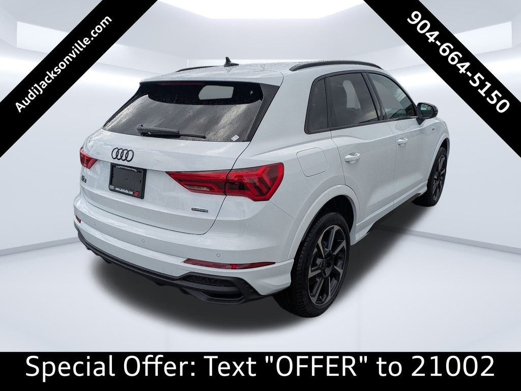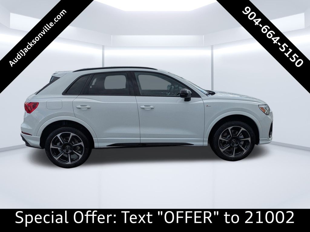 Glacier White Metallic 2025 Audi Q3 S Line 45 TFSI quattro Premium Plus 8-Speed Automatic with Tiptronic 2.0L 4-Cylinder TFSI Alarm w/Motion Sensor, Audi Advanced Key, Audi Beam-Rings, Audi Guard Protection Kit, Audi Guard Wheel Lock Kit, Auto-Dimming Power-Folding Exterior Mirrors, Auto-Dimming Rear-View Mirror, Black Exterior Mirrors, Black Exterior Trim & Badges, Black Optic Plus Package, Black Roof Rails, Carbon Inlays, Convenience Package, Dinamica Upper Inlay & Door Armrests in Steel Gray, Driver Seat Memory, Garage Door Opener (HomeLink), LED Interior Lighting Package, LED Interior Lighting Plus Package, Premium Plus Package, SiriusXM, SONOS Premium Sound System w/3D Sound, Sport Front Bucket Seats w/S Embossing, Stainless Steel Pedal Caps, Top View Camera System, Wheels: 19'' 7-Spoke-Rotor-Design, Wireless Phone Charging Pad, 4-Wheel Disc Brakes, ABS brakes, Air Conditioning, Alloy wheels, AM/FM radio, Audi smartphone interface (Apple CarPlay/Android Auto), Auto High-beam Headlights, Automatic temperature control, Brake assist, Bumpers: body-color, Delay-off headlights, Driver door bin, Driver vanity mirror, Dual front impact airbags, Dual front side impact airbags, Electronic Stability Control, Emergency communication system: Audi connect CARE, Exterior Parking Camera Rear, Four wheel independent suspension, Front anti-roll bar, Front Bucket Seats, Front Center Armrest, Front dual zone A/C, Front fog lights, Front reading lights, Fully automatic headlights, Heated door mirrors, Heated Front Bucket Seats, Heated front seats, Illuminated entry, Knee airbag, Leather Seating Surfaces, Leather Shift Knob, Leather steering wheel, Low tire pressure warning, Occupant sensing airbag, Outside temperature display, Overhead airbag, Overhead console, Panic alarm, Passenger door bin, Passenger vanity mirror, Power door mirrors, Power driver seat, Power Liftgate, Power moonroof: Panoramic, Power passenger seat, Power steering, Power windows, Radio data system, Rain sensing wipers, Rear air conditioning, Rear anti-roll bar, Rear fog lights, Rear reading lights, Rear seat center armrest, Rear window defroster, Rear window wiper, Remote keyless entry, Speed control, Speed-sensing steering, Split folding rear seat, Spoiler, Steering wheel mounted audio controls, Tachometer, Telescoping steering wheel, Tilt steering wheel, Traction control, Trip computer, Turn signal indicator mirrors, Variably intermittent wipers, CLEAN CARFAX, Alarm w/Motion Sensor, Audi Advanced Key, Audi Beam-Rings, Audi Guard Protection Kit, Audi Guard Wheel Lock Kit, Auto-Dimming Power-Folding Exterior Mirrors, Auto-Dimming Rear-View Mirror, Black Exterior Mirrors, Black Exterior Trim & Badges, Black Optic Plus Package, Black Roof Rails, Carbon Inlays, Convenience Package, Dinamica Upper Inlay & Door Armrests in Steel Gray, Driver Seat Memory, Garage Door Opener (HomeLink), LED Interior Lighting Package, LED Interior Lighting Plus Package, Premium Plus Package, SiriusXM, SONOS Premium Sound System w/3D Sound, Sport Front Bucket Seats w/S Embossing, Stainless Steel Pedal Caps, Top View Camera System, Wheels: 19'' 7-Spoke-Rotor-Design, Wireless Phone Charging Pad.Recent Arrival! 20/28 City/Highway MPG