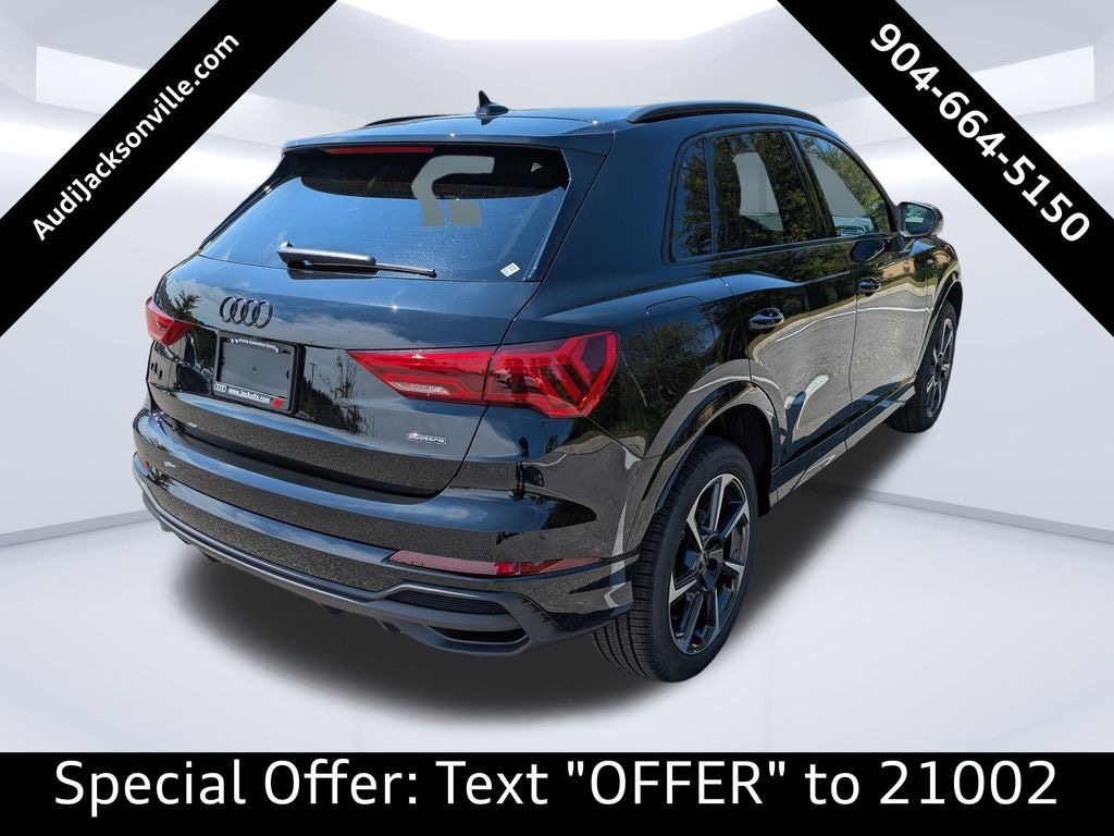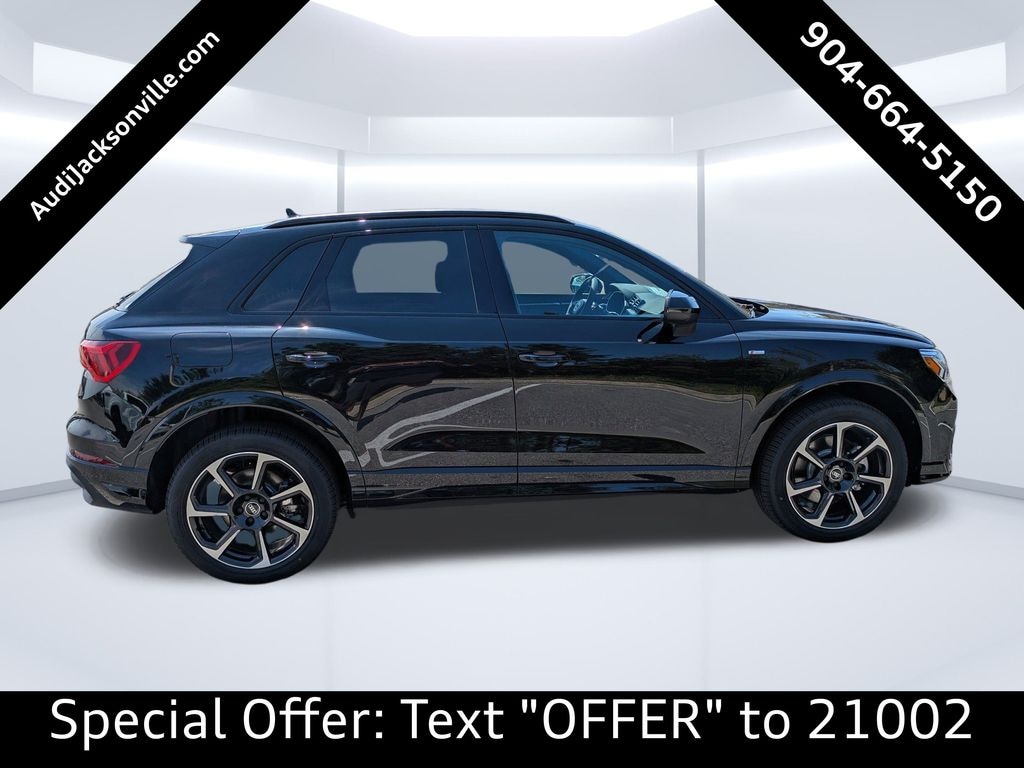 Mythos Black Metallic 2025 Audi Q3 Premium Plus S Line 45 TFSI quattro 8-Speed Automatic with Tiptronic 2.0L 4-Cylinder TFSI Alarm w/Motion Sensor, Audi Advanced Key, Audi Beam-Rings, Audi Guard Protection Kit, Audi Guard Wheel Lock Kit, Auto-Dimming Power-Folding Exterior Mirrors, Auto-Dimming Rear-View Mirror, Black Exterior Mirrors, Black Exterior Trim & Badges, Black Optic Plus Package, Black Roof Rails, Carbon Inlays, Convenience Package, Driver Seat Memory, Garage Door Opener (HomeLink), LED Interior Lighting Package, LED Interior Lighting Plus Package, Premium Plus Package, SiriusXM, SONOS Premium Sound System w/3D Sound, Sport Front Bucket Seats w/S Embossing, Stainless Steel Pedal Caps, Top View Camera System, Wheels: 19'' 7-Spoke-Rotor-Design, Wireless Phone Charging Pad, 4-Wheel Disc Brakes, ABS brakes, Air Conditioning, Alloy wheels, AM/FM radio, Audi smartphone interface (Apple CarPlay/Android Auto), Auto High-beam Headlights, Automatic temperature control, Brake assist, Bumpers: body-color, Delay-off headlights, Driver door bin, Driver vanity mirror, Dual front impact airbags, Dual front side impact airbags, Electronic Stability Control, Emergency communication system: Audi connect CARE, Exterior Parking Camera Rear, Four wheel independent suspension, Front anti-roll bar, Front Bucket Seats, Front Center Armrest, Front dual zone A/C, Front fog lights, Front reading lights, Fully automatic headlights, Heated door mirrors, Heated Front Bucket Seats, Heated front seats, Illuminated entry, Knee airbag, Leather Seating Surfaces, Leather Shift Knob, Leather steering wheel, Low tire pressure warning, Occupant sensing airbag, Outside temperature display, Overhead airbag, Overhead console, Panic alarm, Passenger door bin, Passenger vanity mirror, Power door mirrors, Power driver seat, Power Liftgate, Power moonroof: Panoramic, Power passenger seat, Power steering, Power windows, Radio data system, Rain sensing wipers, Rear air conditioning, Rear anti-roll bar, Rear fog lights, Rear reading lights, Rear seat center armrest, Rear window defroster, Rear window wiper, Remote keyless entry, Speed control, Speed-sensing steering, Split folding rear seat, Spoiler, Steering wheel mounted audio controls, Tachometer, Telescoping steering wheel, Tilt steering wheel, Traction control, Trip computer, Turn signal indicator mirrors, Variably intermittent wipers, CLEAN CARFAX, Alarm w/Motion Sensor, Audi Advanced Key, Audi Beam-Rings, Audi Guard Protection Kit, Audi Guard Wheel Lock Kit, Auto-Dimming Power-Folding Exterior Mirrors, Auto-Dimming Rear-View Mirror, Black Exterior Mirrors, Black Exterior Trim & Badges, Black Optic Plus Package, Black Roof Rails, Carbon Inlays, Convenience Package, Driver Seat Memory, Garage Door Opener (HomeLink), LED Interior Lighting Package, LED Interior Lighting Plus Package, Premium Plus Package, SiriusXM, SONOS Premium Sound System w/3D Sound, Sport Front Bucket Seats w/S Embossing, Stainless Steel Pedal Caps, Top View Camera System, Wheels: 19'' 7-Spoke-Rotor-Design, Wireless Phone Charging Pad.Recent Arrival! 20/28 City/Highway MPG
