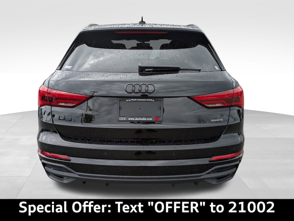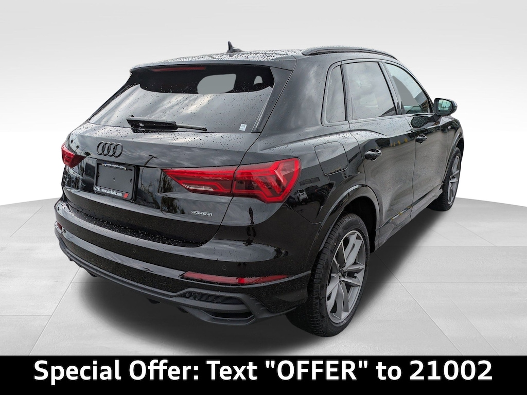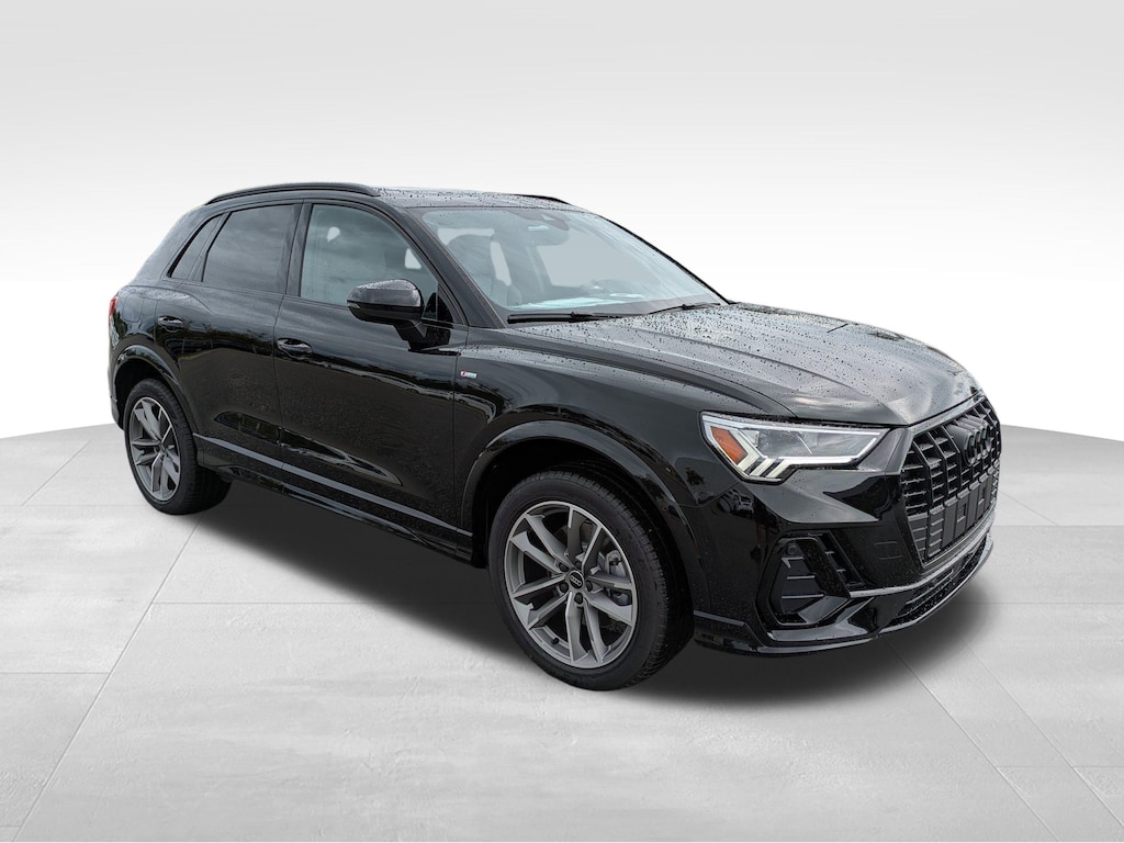 Mythos Black Metallic 2025 Audi Q3 S line 45 TFSI quattro Premium quattro 8-Speed Automatic with Tiptronic 2.0L 4-Cylinder TFSI ABS brakes, Alarm w/Motion Sensor, Alloy wheels, Audi Advanced Key, Audi Beam-Rings, Audi Guard Protection Kit, Auto-Dimming Power-Folding Exterior Mirrors, Auto-Dimming Rear-View Mirror, Black Audi Rings & Badges, Black Exterior Trim, Black Optic Sport Package, Black Roof Rails, Convenience Package, Driver Seat Memory, Electronic Stability Control, Front dual zone A/C, Garage Door Opener (HomeLink), Heated door mirrors, Heated Front Bucket Seats, Heated front seats, Illuminated entry, LED Interior Lighting Package, Low tire pressure warning, Power Liftgate, Remote keyless entry, Sport Front Bucket Seats, Traction control, Wheels: 19'' 5-Double-Arm Design, Wireless Phone Charging Pad.20/28 City/Highway MPG