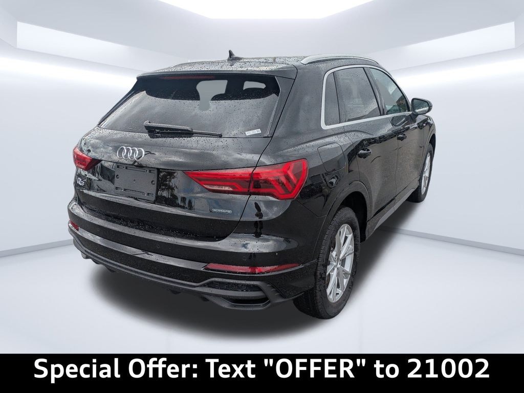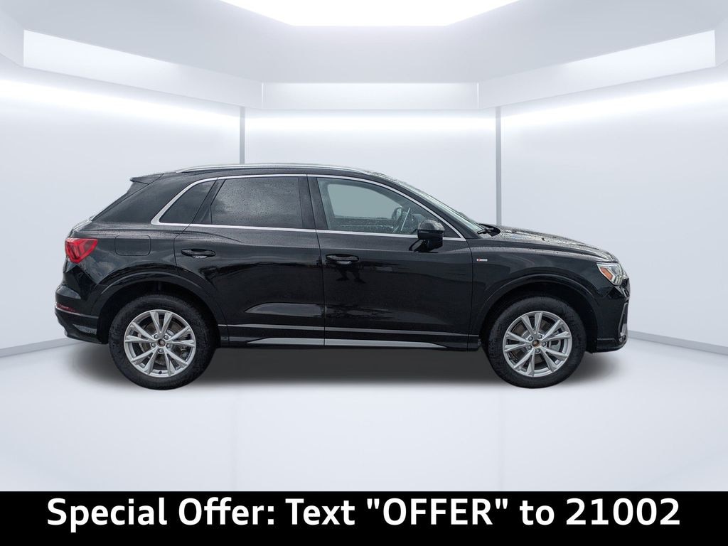 Mythos Black Metallic 2025 Audi Q3 S Line 45 TFSI quattro Premium 8-Speed Automatic with Tiptronic 2.0L 4-Cylinder TFSI Alarm w/Motion Sensor, Audi Advanced Key, Audi Beam-Rings, Audi Guard Protection Kit, Auto-Dimming Power-Folding Exterior Mirrors, Auto-Dimming Rear-View Mirror, Convenience Package, Driver Seat Memory, Garage Door Opener (HomeLink), LED Interior Lighting Package, SiriusXM, Wireless Phone Charging Pad, 10 Speakers, 4-Wheel Disc Brakes, ABS brakes, Air Conditioning, Alloy wheels, AM/FM radio, Audi smartphone interface (Apple CarPlay/Android Auto), Auto High-beam Headlights, Automatic temperature control, Brake assist, Bumpers: body-color, Delay-off headlights, Driver door bin, Driver vanity mirror, Dual front impact airbags, Dual front side impact airbags, Electronic Stability Control, Emergency communication system: Audi connect CARE, Exterior Parking Camera Rear, Four wheel independent suspension, Front anti-roll bar, Front Bucket Seats, Front Center Armrest, Front dual zone A/C, Front fog lights, Front reading lights, Fully automatic headlights, Heated door mirrors, Heated Front Bucket Seats, Heated front seats, Illuminated entry, Knee airbag, Leather Seating Surfaces, Leather Shift Knob, Leather steering wheel, Low tire pressure warning, Occupant sensing airbag, Outside temperature display, Overhead airbag, Overhead console, Panic alarm, Passenger door bin, Passenger vanity mirror, Power door mirrors, Power driver seat, Power Liftgate, Power moonroof: Panoramic, Power passenger seat, Power steering, Power windows, Radio data system, Radio: Audi Sound System, Rain sensing wipers, Rear air conditioning, Rear anti-roll bar, Rear fog lights, Rear reading lights, Rear seat center armrest, Rear window defroster, Rear window wiper, Remote keyless entry, Speed control, Speed-sensing steering, Split folding rear seat, Spoiler, Steering wheel mounted audio controls, Tachometer, Telescoping steering wheel, Tilt steering wheel, Traction control, Trip computer, Turn signal indicator mirrors, Variably intermittent wipers, Wheels: 18'' 5-V-Spoke-S Design, CLEAN CARFAX, Alarm w/Motion Sensor, Audi Advanced Key, Audi Beam-Rings, Audi Guard Protection Kit, Auto-Dimming Power-Folding Exterior Mirrors, Auto-Dimming Rear-View Mirror, Convenience Package, Driver Seat Memory, Garage Door Opener (HomeLink), LED Interior Lighting Package, SiriusXM, Wireless Phone Charging Pad.Recent Arrival! 20/28 City/Highway MPG
