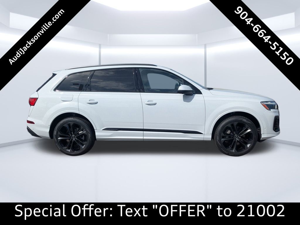 Glacier White Metallic 2025 Audi Q7 55 Premium Plus quattro 8-Speed Automatic with Tiptronic 3.0L TFSI 7-Pin Adapter, Anthracite Gray Audi Rings, Audi Beam Rings, Audi Guard Protection Kit, Bang & Olufsen Premium Sound System w/3D Sound, Black Door Blades, Black Exterior Trim, Black Grille, Black Optic Package, Black Roof Rails, Black Window Surrounds, Convenience Package, Dark Chrome Exhaust Tips, Dual-Pane Acoustic Glass for Side Windows, Executive Package (DISC), Four-Zone Automatic Climate Control, Front Seats w/Ventilation, Heated Rear Seats, Heated Steering Wheel, Illuminated Door Sills, LED Interior Lighting Package Plus, Premium Plus Package, Privacy Trunk Cover, Rear Door/Side Windows & Tailgate Sunshades, Top View Camera System, Traffic Sign Recognition, Trailer Hitch, Wheels: 21'' 5-Double-Spoke-Design Matte Gray, 3rd row seats: bench, 4-Wheel Disc Brakes, ABS brakes, Air Conditioning, Alloy wheels, AM/FM radio: SiriusXM w/ 360L, Auto High-beam Headlights, Auto-dimming door mirrors, Auto-dimming Rear-View mirror, Automatic temperature control, Brake assist, Bumpers: body-color, Compass, Delay-off headlights, Driver door bin, Driver vanity mirror, Dual front impact airbags, Dual front side impact airbags, Electronic Stability Control, Emergency communication system: Audi connect CARE, Exterior Parking Camera Rear, Four wheel independent suspension, Front anti-roll bar, Front Bucket Seats, Front Center Armrest, Front dual zone A/C, Front fog lights, Front reading lights, Fully automatic headlights, Garage door transmitter: HomeLink, Genuine wood door panel insert, Heated door mirrors, Heated Front Bucket Seats, Heated front seats, Illuminated entry, Leather Seating Surfaces, Leather Shift Knob, Leather steering wheel, Low tire pressure warning, Memory seat, Navigation system: Audi MMI Navigation plus with Touch Response, Occupant sensing airbag, Outside temperature display, Overhead airbag, Overhead console, Panic alarm, Passenger door bin, Passenger vanity mirror, Power door mirrors, Power driver seat, Power Liftgate, Power moonroof: Panoramic, Power passenger seat, Power steering, Power windows, Radio data system, Rain sensing wipers, Rear air conditioning, Rear anti-roll bar, Rear fog lights, Rear reading lights, Rear seat center armrest, Rear side impact airbag, Rear window defroster, Rear window wiper, Reclining 3rd row seat, Remote keyless entry, Security system, Speed control, Speed-sensing steering, Split folding rear seat, Spoiler, Steering wheel memory, Steering wheel mounted audio controls, Tachometer, Telescoping steering wheel, Tilt steering wheel, Traction control, Trip computer, Turn signal indicator mirrors, Variably intermittent wipers, Wireless Phone Charging Pad Delete, 7-Pin Adapter, Anthracite Gray Audi Rings, Audi Beam Rings, Audi Guard Protection Kit, Bang & Olufsen Premium Sound System w/3D Sound, Black Door Blades, Black Exterior Trim, Black Grille, Black Optic Package, Black Roof Rails, Black Window Surrounds, Convenience Package, Dark Chrome Exhaust Tips, Dual-Pane Acoustic Glass for Side Windows, Executive Package (DISC), Four-Zone Automatic Climate Control, Front Seats w/Ventilation, Heated Rear Seats, Heated Steering Wheel, Illuminated Door Sills, LED Interior Lighting Package Plus, Premium Plus Package, Privacy Trunk Cover, Rear Door/Side Windows & Tailgate Sunshades, Top View Camera System, Traffic Sign Recognition, Trailer Hitch, Wheels: 21'' 5-Double-Spoke-Design Matte Gray.Recent Arrival!