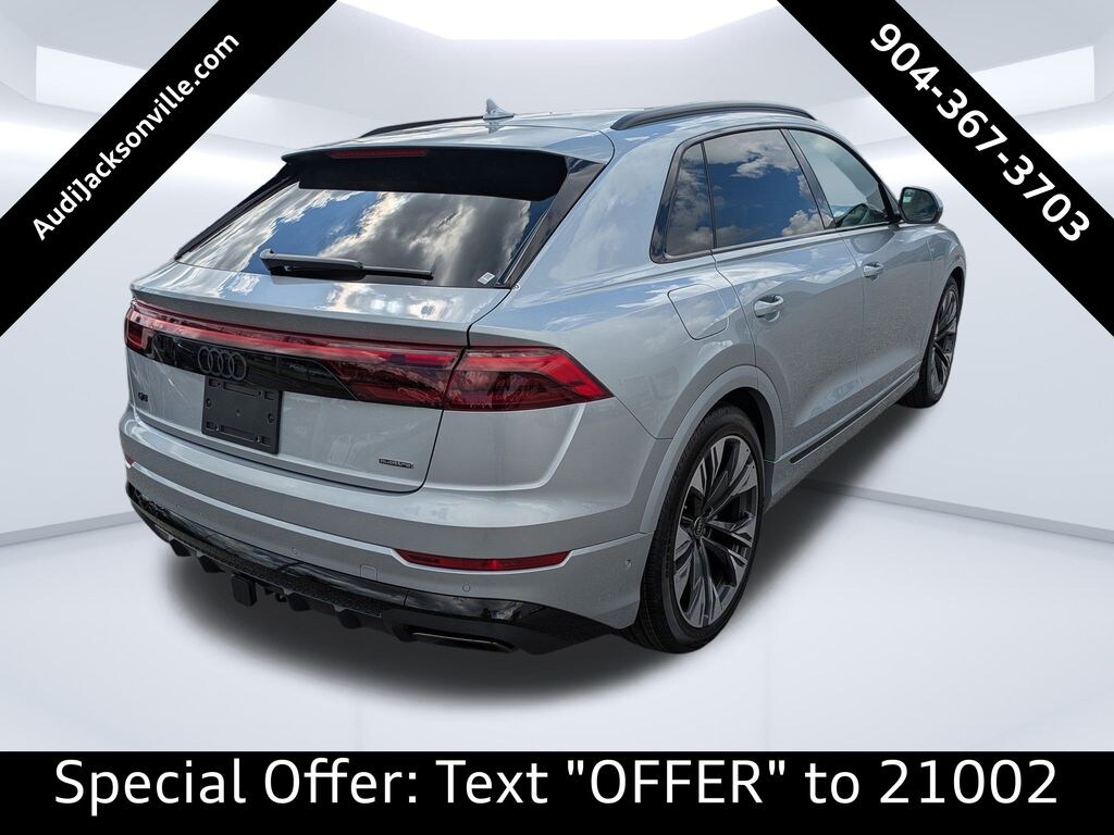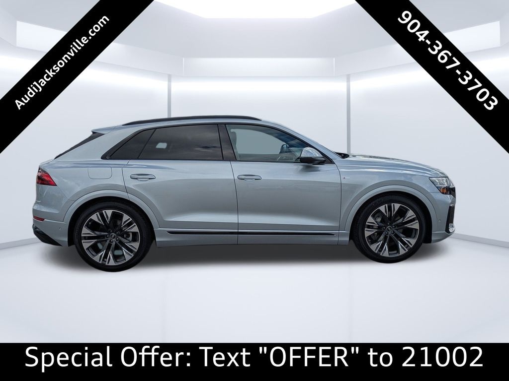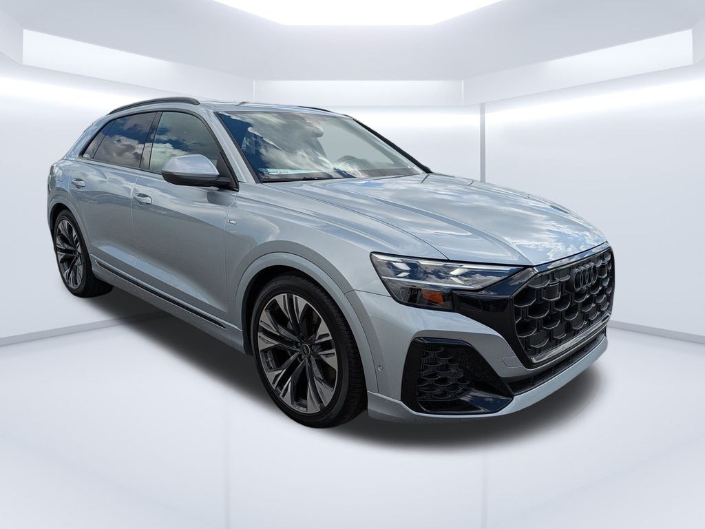 Satellite Silver Metallic 2025 Audi Q8 55 Prestige TFSI quattro 8-Speed Automatic with Tiptronic 3.0L V6 Turbocharged DOHC 24V LEV3-ULEV70 335hp 4-Zone Automatic Climate Control, 7-Pin Adapter, Animation for Headlights & Taillights, Anthracite Gray Audi Rings, Audi Guard All-Weather Mats, Bang & Olufsen 3D Advanced Sound System, Black Exterior Trim, Black Optic Package, Comfort Adaptive Air Suspension, Control Buttons in Gloss Black w/Haptic Feedback, Convenience Package, Dark Chrome Exhaust Tips, Dual-Pane Acoustic Glass for Side Windows, Executive Plus Package, Front & Rear Doors Audi Beam-Rings, Front Seats w/Ventilation, HD Matrix-Design LED Headlights w/Audi Laser Light, Head-Up Display, Heated Rear Seats, Heated Steering Wheel, Illuminated Door Sills, Individual Contour Front Seats, Intersection Assist, LED Interior Lighting Plus Package, Night Vision Assistant, Power Rear Side Windows, Power Soft-Closing Doors, Prestige Package, Remote Park Assist Plus, S Line Exterior, S Line Illuminated Door Sills, S Line Style Package, Top View Camera System w/Virtual 360 View, Trailer Hitch, Valcona/Cricket Leather Seat Trim, Wheels: 22'' 5-Double-Arm Design Bicolor Finish, 4-Wheel Disc Brakes, ABS brakes, Adaptive suspension, Air Conditioning, Alloy wheels, AM/FM radio: SiriusXM w/ 360L, Auto High-beam Headlights, Auto-dimming door mirrors, Auto-dimming Rear-View mirror, Automatic temperature control, Brake assist, Bumpers: body-color, Compass, Delay-off headlights, Driver door bin, Driver vanity mirror, Dual front impact airbags, Dual front side impact airbags, Electronic Stability Control, Emergency communication system: Audi connect CARE, Exterior Parking Camera Rear, Four wheel independent suspension, Front anti-roll bar, Front Bucket Seats, Front Center Armrest, Front dual zone A/C, Front fog lights, Front reading lights, Fully automatic headlights, Garage door transmitter: HomeLink, Genuine wood door panel insert, Headlight cleaning, Heated door mirrors, Heated Front Bucket Seats, Heated front seats, Illuminated entry, Leather Seating Surfaces, Leather Shift Knob, Leather steering wheel, Low tire pressure warning, Memory seat, Navigation system: Audi MMI Navigation with Touch Response, Occupant sensing airbag, Outside temperature display, Overhead airbag, Overhead console, Panic alarm, Passenger door bin, Passenger vanity mirror, Power door mirrors, Power driver seat, Power Liftgate, Power moonroof: Panoramic, Power passenger seat, Power steering, Power windows, Radio data system, Radio: Audi MMI Nav Plus w/MMI Touch Response, Rain sensing wipers, Rear air conditioning, Rear anti-roll bar, Rear fog lights, Rear reading lights, Rear seat center armrest, Rear side impact airbag, Rear window defroster, Rear window wiper, Remote keyless entry, Security system, Speed control, Speed-sensing steering, Split folding rear seat, Spoiler, Steering wheel memory, Steering wheel mounted audio controls, Tachometer, Telescoping steering wheel, Tilt steering wheel, Traction control, Trip computer, Turn signal indicator mirrors, Variably intermittent wipers, Wireless Phone Charging Pad Delete, CLEAN CARFAX, 4-Zone Automatic Climate Control, 7-Pin Adapter, Animation for Headlights & Taillights, Anthracite Gray Audi Rings, Audi Guard All-Weather Mats, Bang & Olufsen 3D Advanced Sound System, Black Exterior Trim, Black Optic Package, Comfort Adaptive Air Suspension, Control Buttons in Gloss Black w/Haptic Feedback, Convenience Package, Dark Chrome Exhaust Tips, Dual-Pane Acoustic Glass for Side Windows, Executive Plus Package, Front & Rear Doors Audi Beam-Rings, Front Seats w/Ventilation, HD Matrix-Design LED Headlights w/Audi Laser Light, Head-Up Display, Heated Rear Seats, Heated Steering Wheel, Illuminated Door Sills, Individual Contour Front Seats, Intersection Assist, LED Interior Lighting Plus Package, Night Vision Assistant, Power Rear Side Windows, Power Soft-Closing Doors, Prestige Package, Remote Park Assist Plus, S Line Exterior.