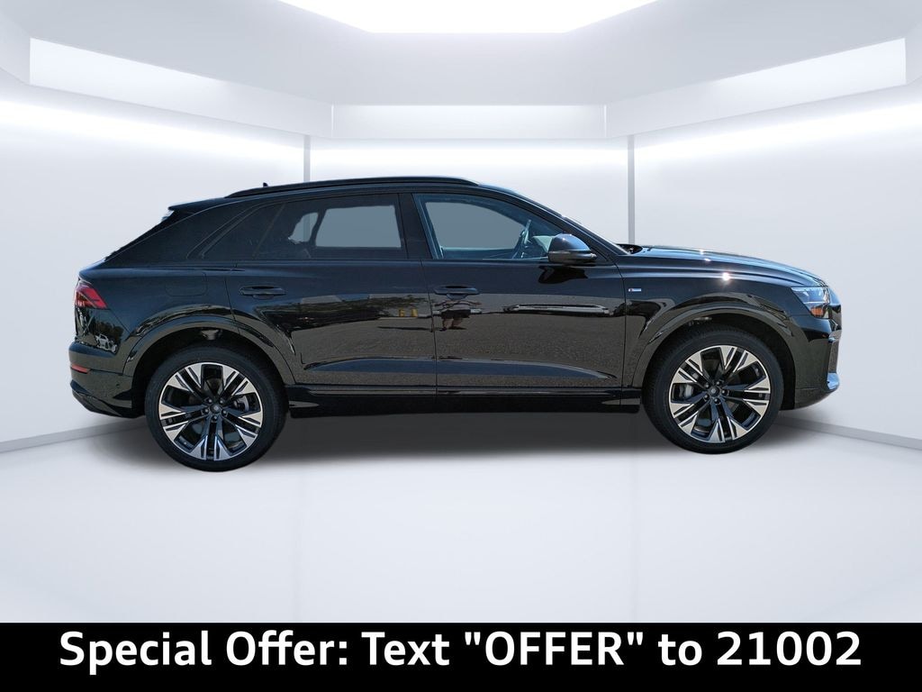 Mythos Black Metallic 2026 Audi Q8 55 TFSI quattro Prestige quattro 8-Speed Automatic with Overdrive 3.0L V6Factory Options1D6 - Towing package, PCR - S line black optic package, PPD - Luxury package, WPT - Prestige package - Adaptive air suspensionAll-wheel steeringBang & Olufsen Premium sound system with 3D soundDual-pane acoustic glass for side windowsFour-zone automatic climate controlHead-up displayHeated steering wheel and rear seatsIlluminated door sillsIndividual contour front seats w/ ventilation and massageIntersection assistLED interior lighting plus packageOLED taillightsPower lumbar & memory for passenger seatPower side window, manual tailgate sunshadesPower soft-closing doorsRemote park assist plusTopview camera systemValcona/cricket leather interiorPort Installed AccessoriesQEP - Audi Guard Protection Kit, RBF - Audi Beam-Rings Front & Rear DoorsRecent Arrival!